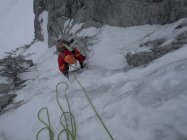 Der Bergschrund kann zur Zeit relativ einfach überwunden werden. Die ersten sieben Seillängen in der Schwierigkeit WI3 weisen guten Styropor-Schnee bzw. Eis auf und lassen sich einfach durchsteigen. Insbesondere die kürzen 80 Grad steilen Eisaufschwünge können gut abgesichert werden. Die teilweise vorhanden Normalhaken-Stände sind schneefrei und sichtbar.