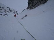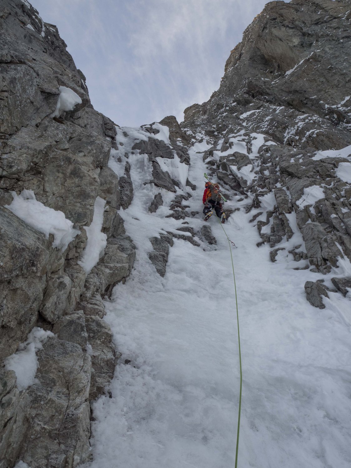 Anschliessend folgen zwei sehr unangenehme Seillängen über Platten, die spärlich mit losen Schnee abgedeckt sind, technisch nicht besonders schwierig, aber bei den aktuellen Verhältnissen kaum absicherbar.