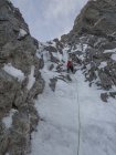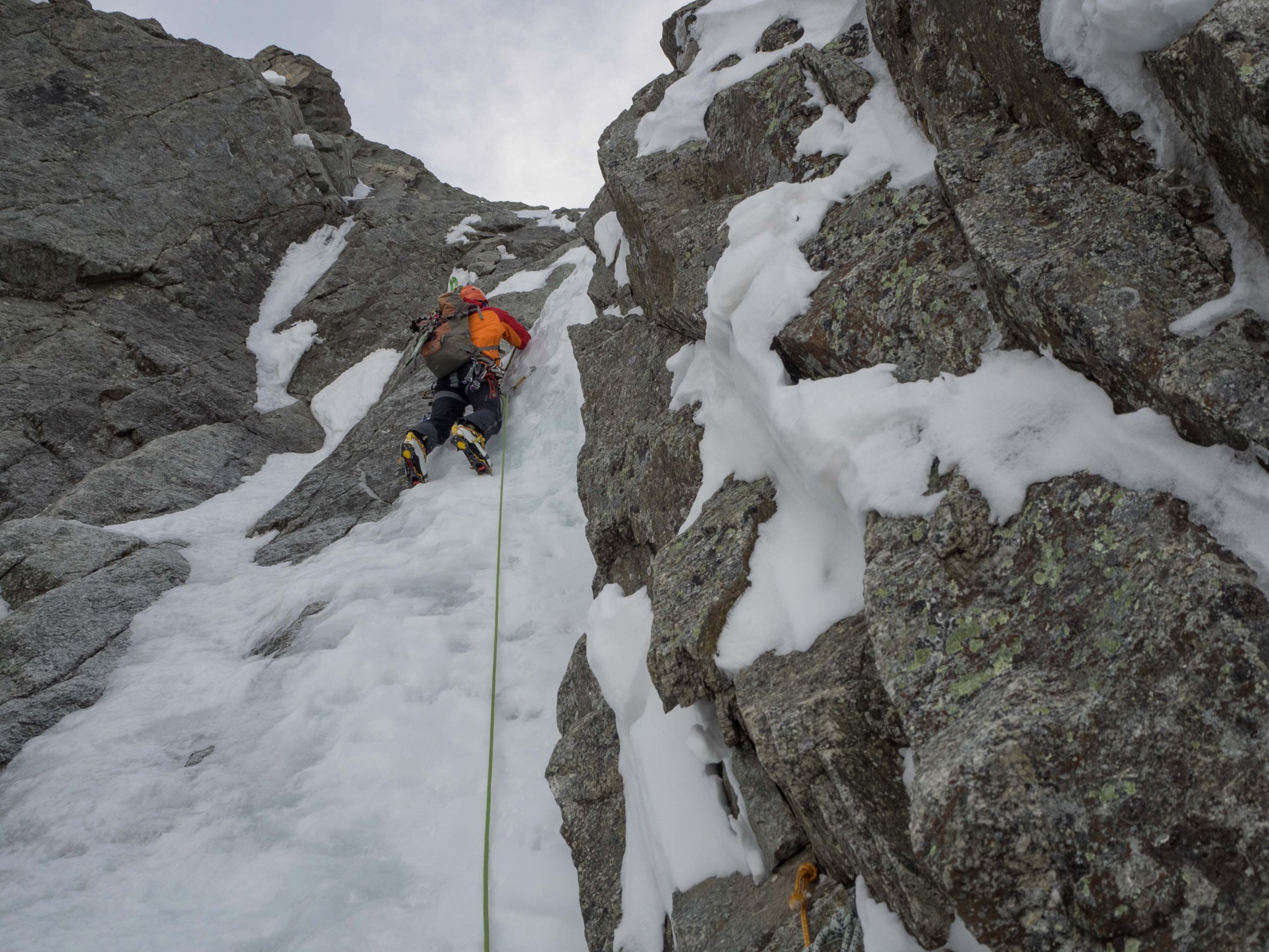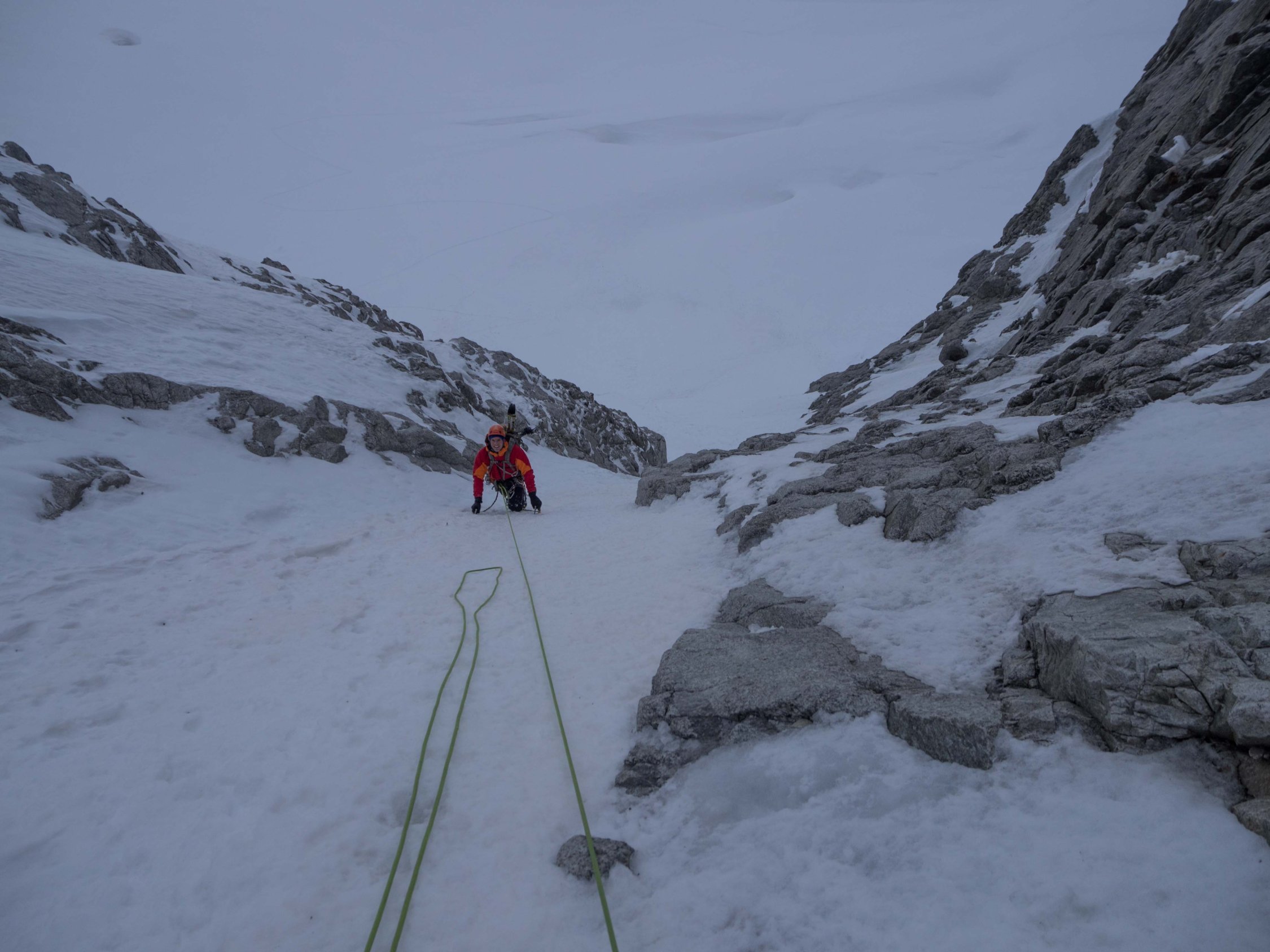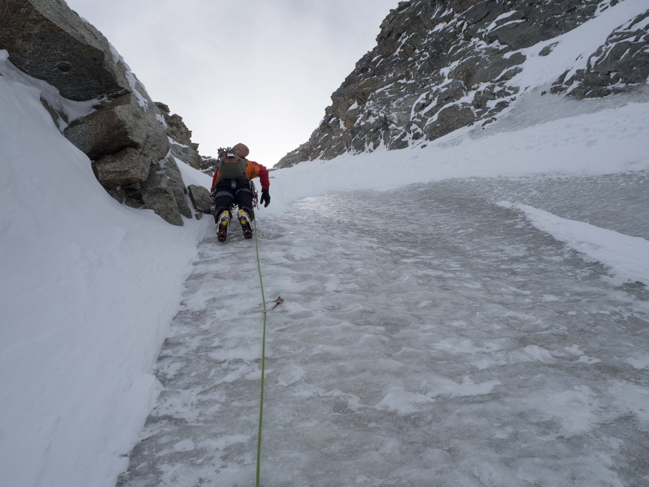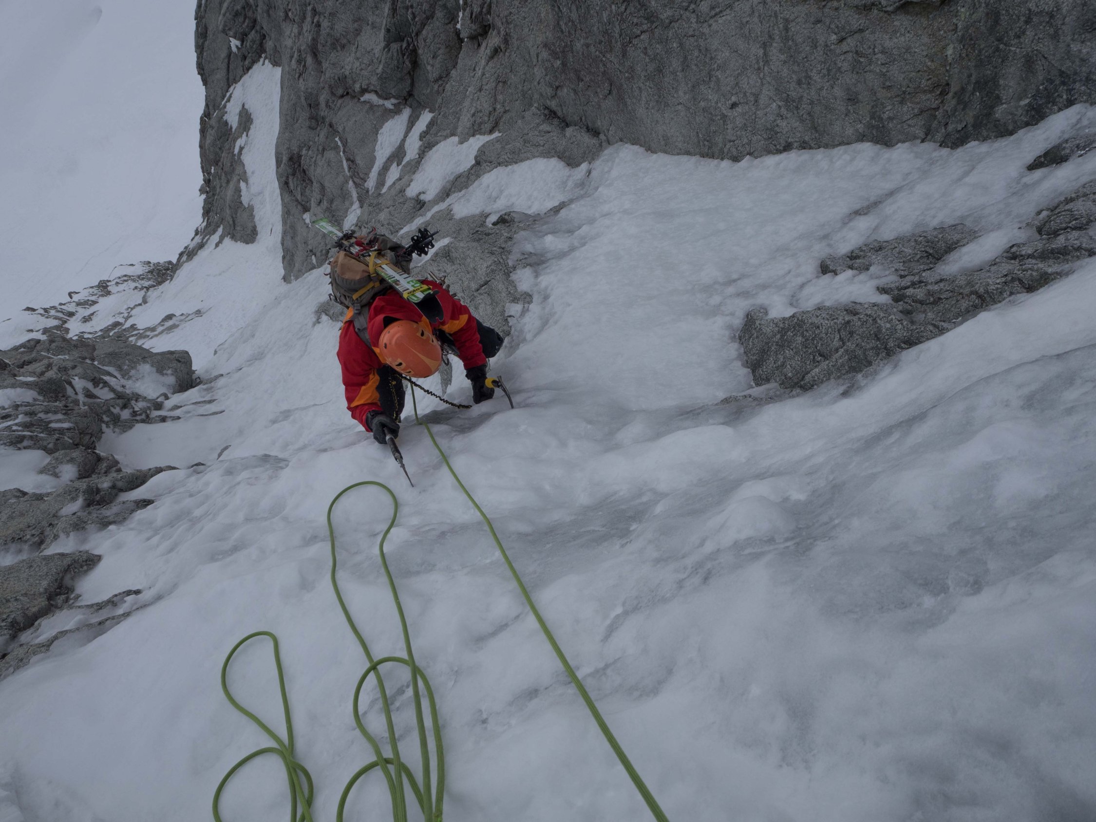 Die letzten drei Seillängen bis in den Sattel (ca. 55 Grad) weisen wieder perfekte Bedingungen auf: Guter Trittschnee oder Blankes, das sich gut absichern lässt.