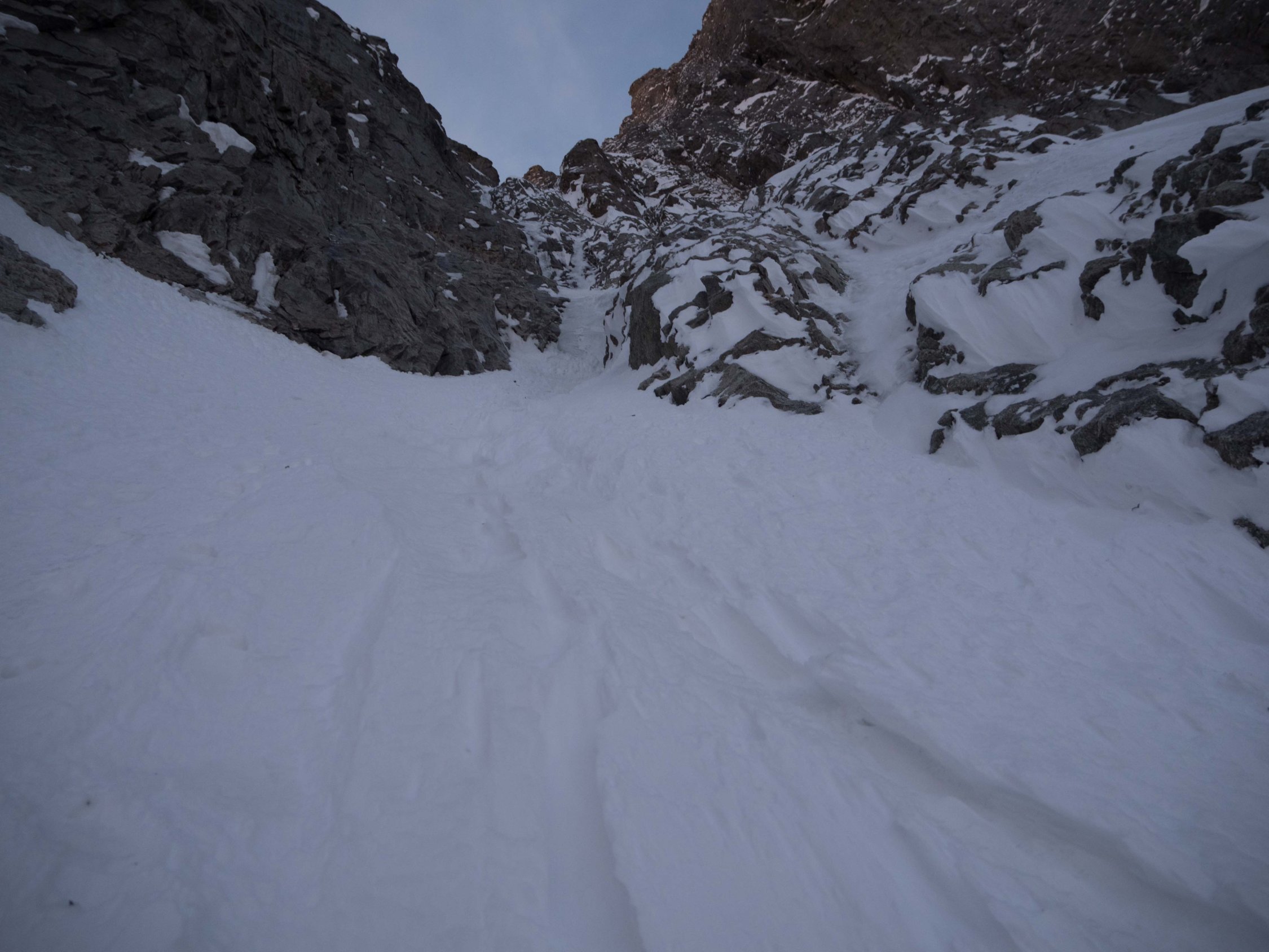 Mit der nächsten trockenen Wärmeperiode wird sich der lose Schnee im Couloir verfirnen. Die Verhältnisse werden damit wohl einen Tick besser werden. Das Couloir ist und bleibt aber verhältnismässig trocken mit wenig Eis und Schnee. Das wird sich bis im nächsten Herbst auch nicht ändern. Die Skiabfahrt nach La Fouly wird unten bald einmal ausapern, so dass die Skis in den nächsten Wochen am Schluss getragen werden müssen.
