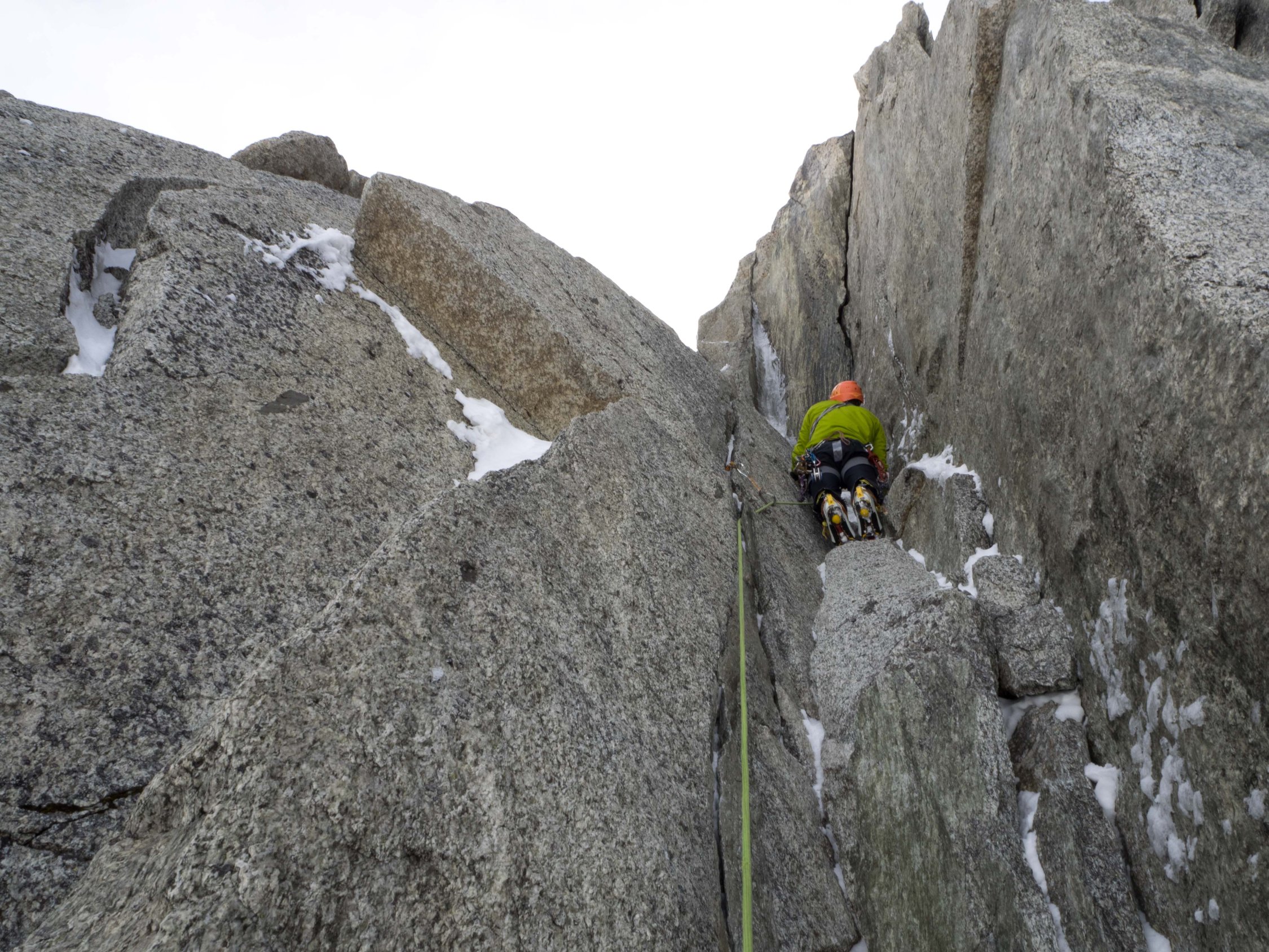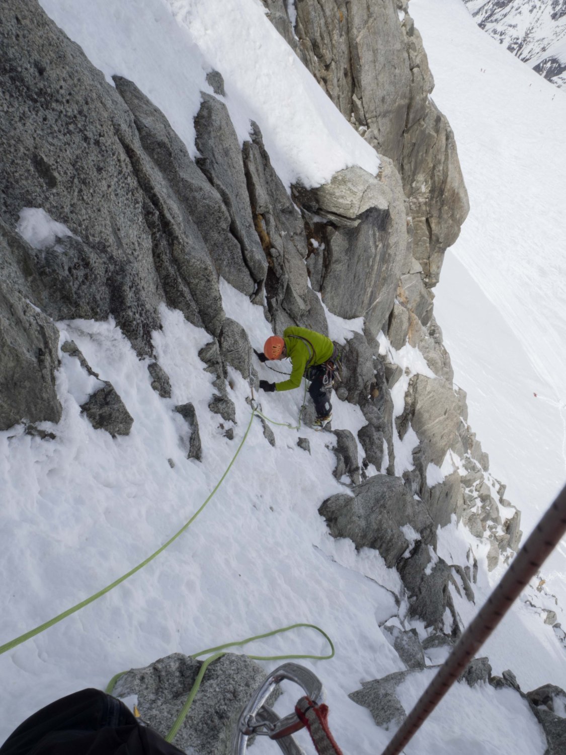 Wie die meisten Routen in Chamonix ist auch die Pépite diesen Frühling ziemlich trocken. Es hat kein Eis in der Route und wenig Schnee. Vor allem im mittleren Teil ist der Schnee zudem nicht gebunden. Im untersten technischen Teil hat es guten Styroporschnee, der ein zügiges Klettern erlaubt.