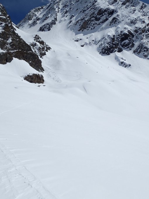 Der starke Nord- und Westwind hat im Bedretto sehr viel Schnee verfrachtet. Die ganz steilen Hänge brauchen noch ein paar Tage, um sicher befahren werden zu können.
