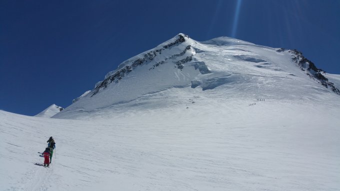 50m unter dem Gipfel Skidepot. Von dort in guten Trittschnee mit Steigeisen zum Gipfel.