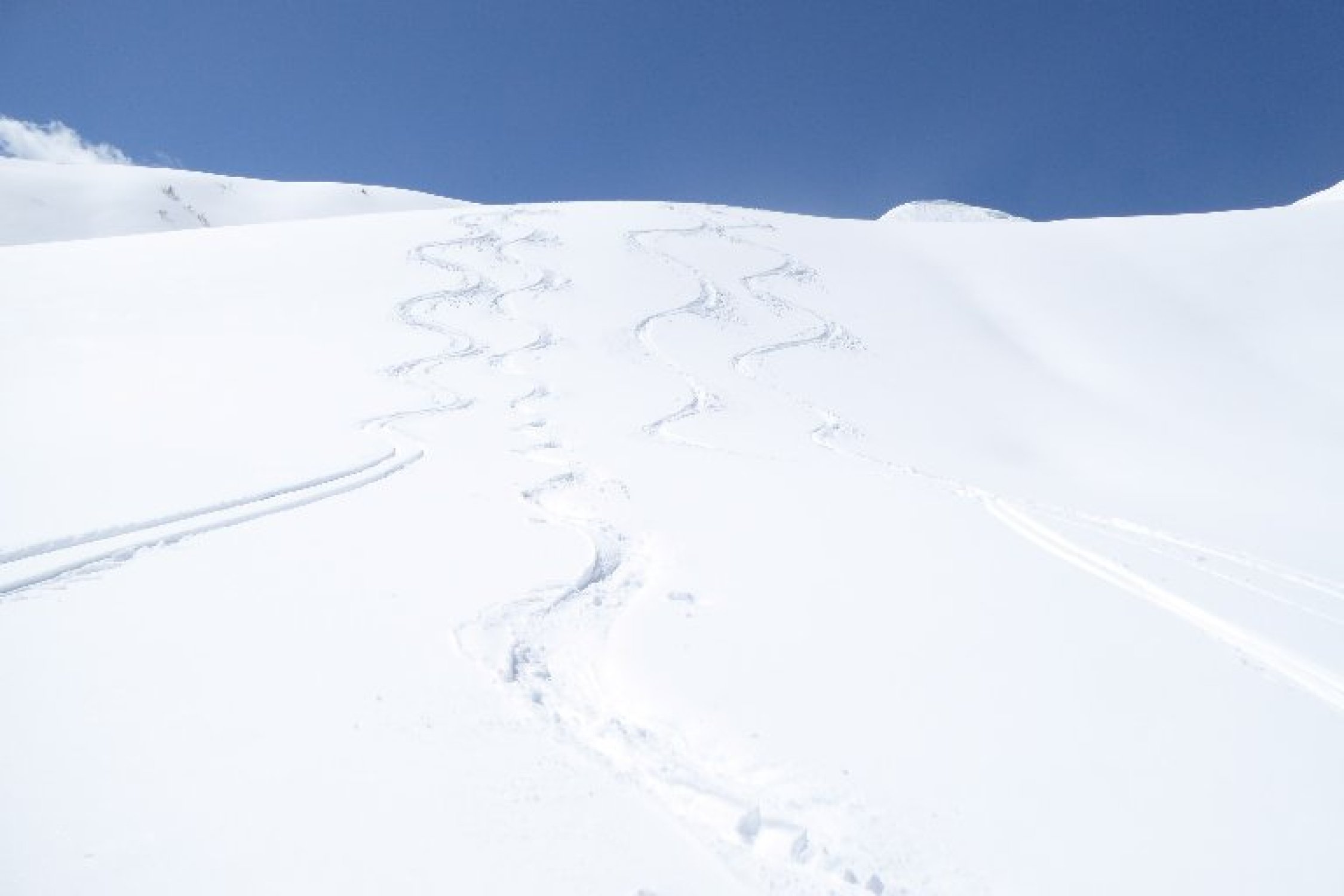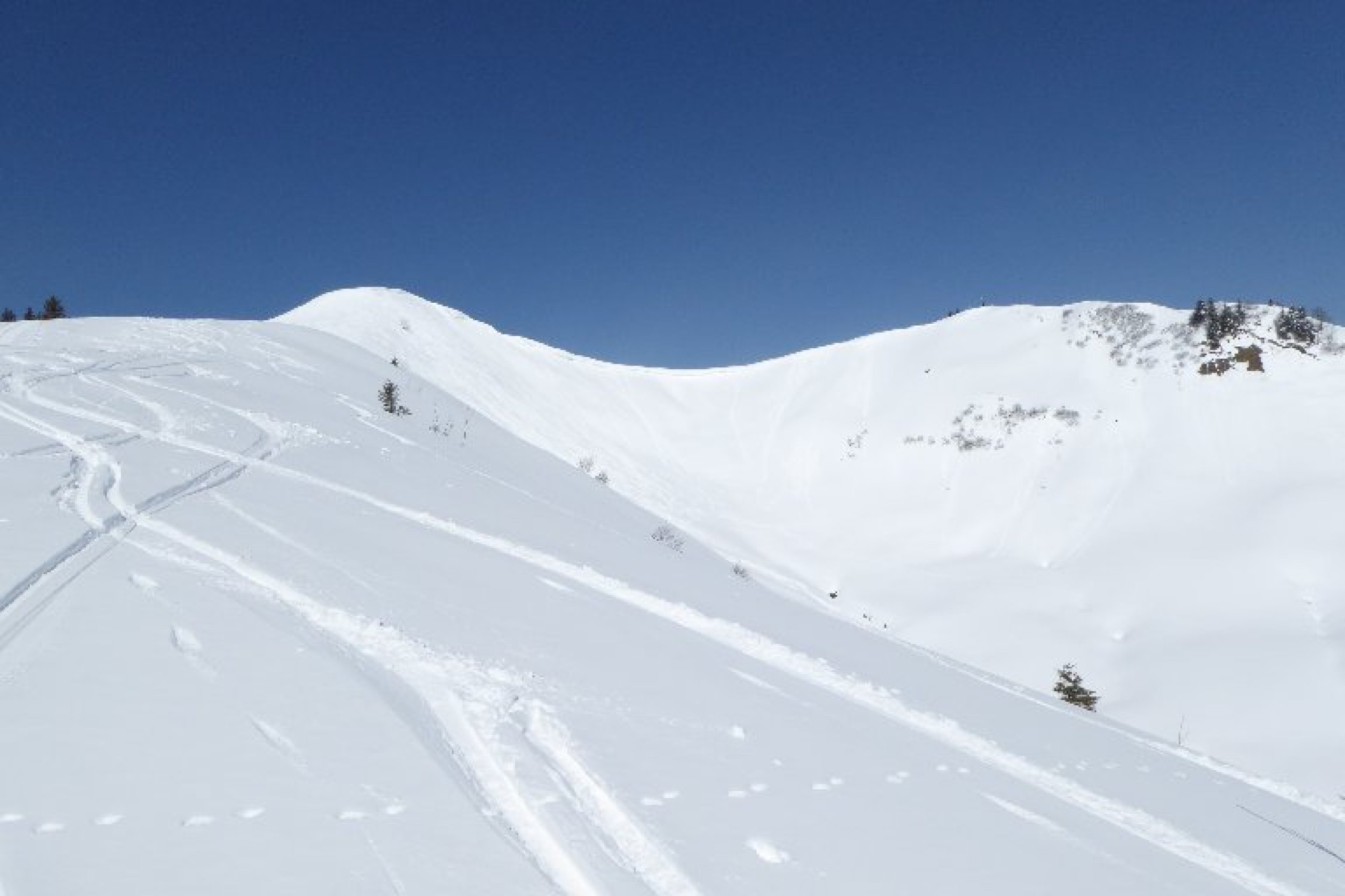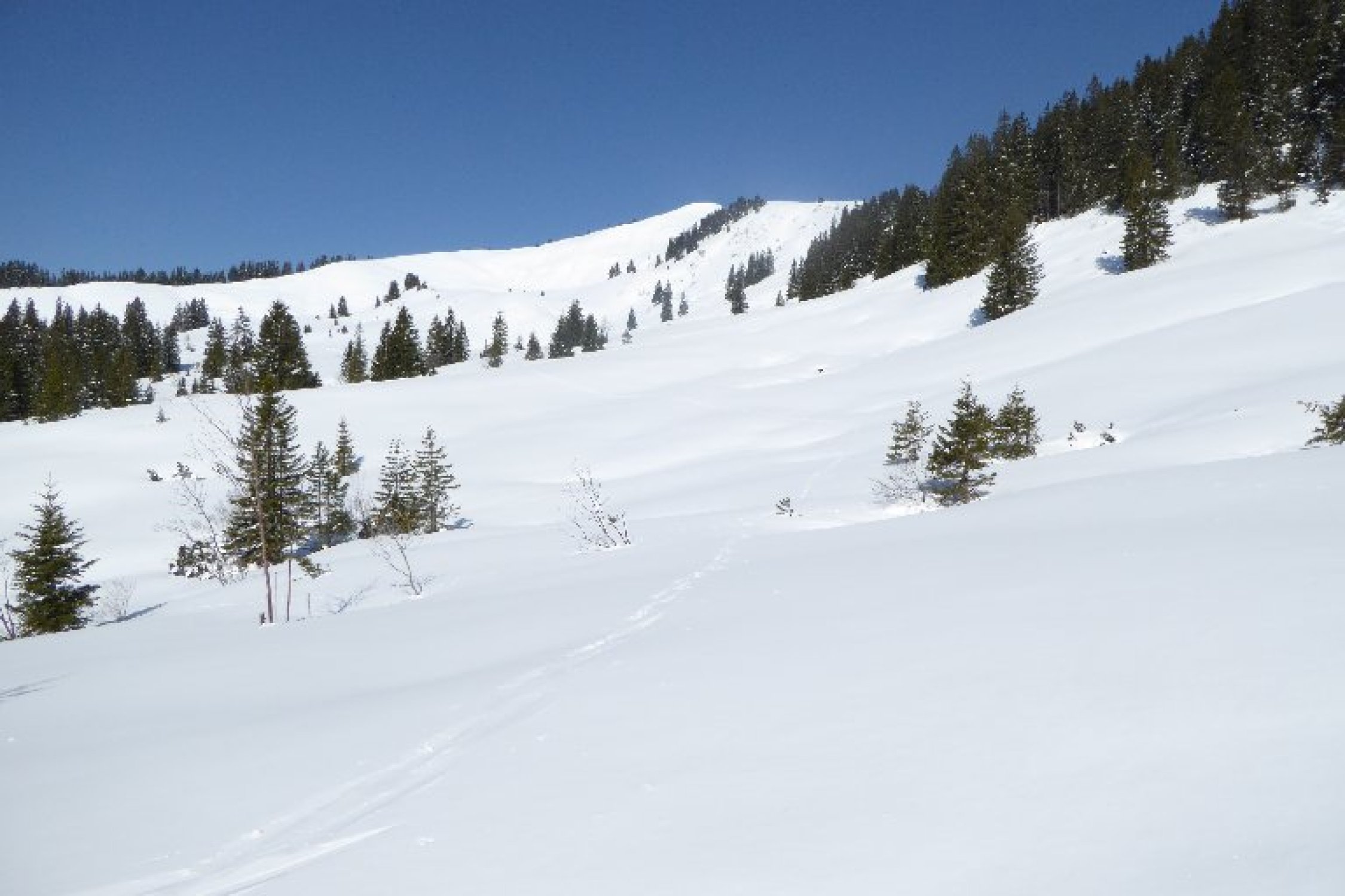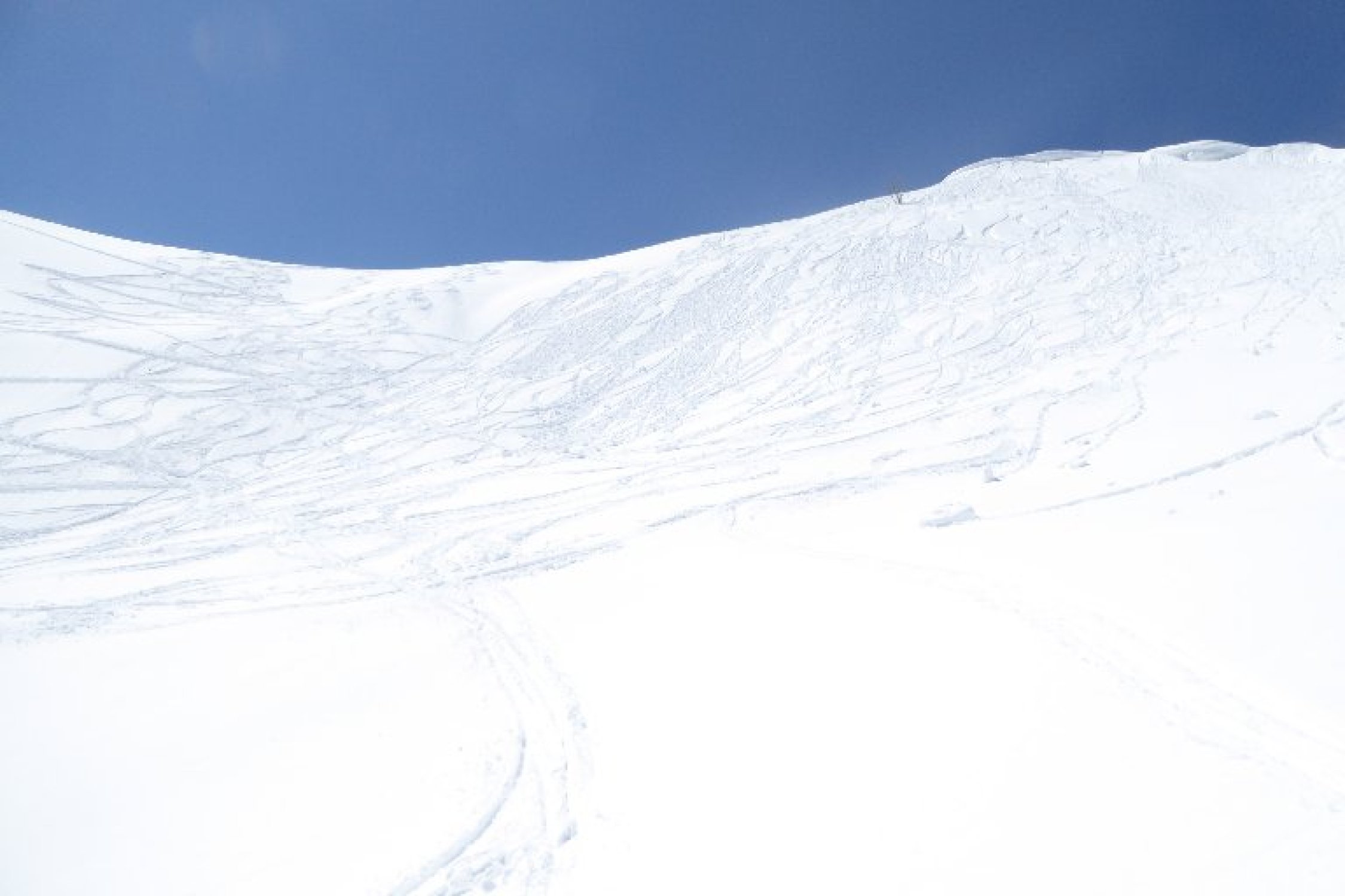 Nachmittags bollen die Südhänge schon auf und sollten auf keinen Fall befahren werden, wenn sich darunter Leute befinden.