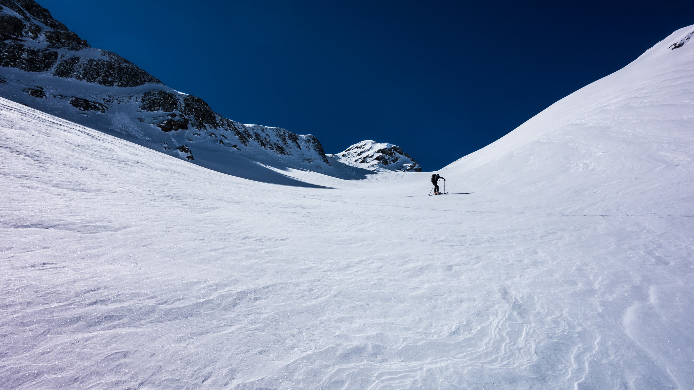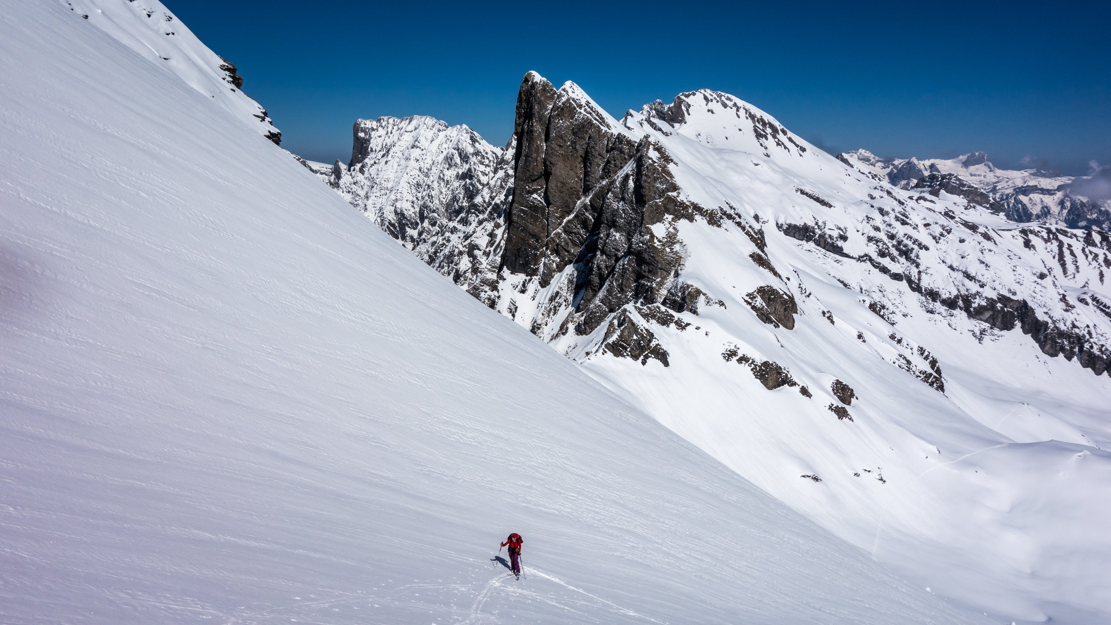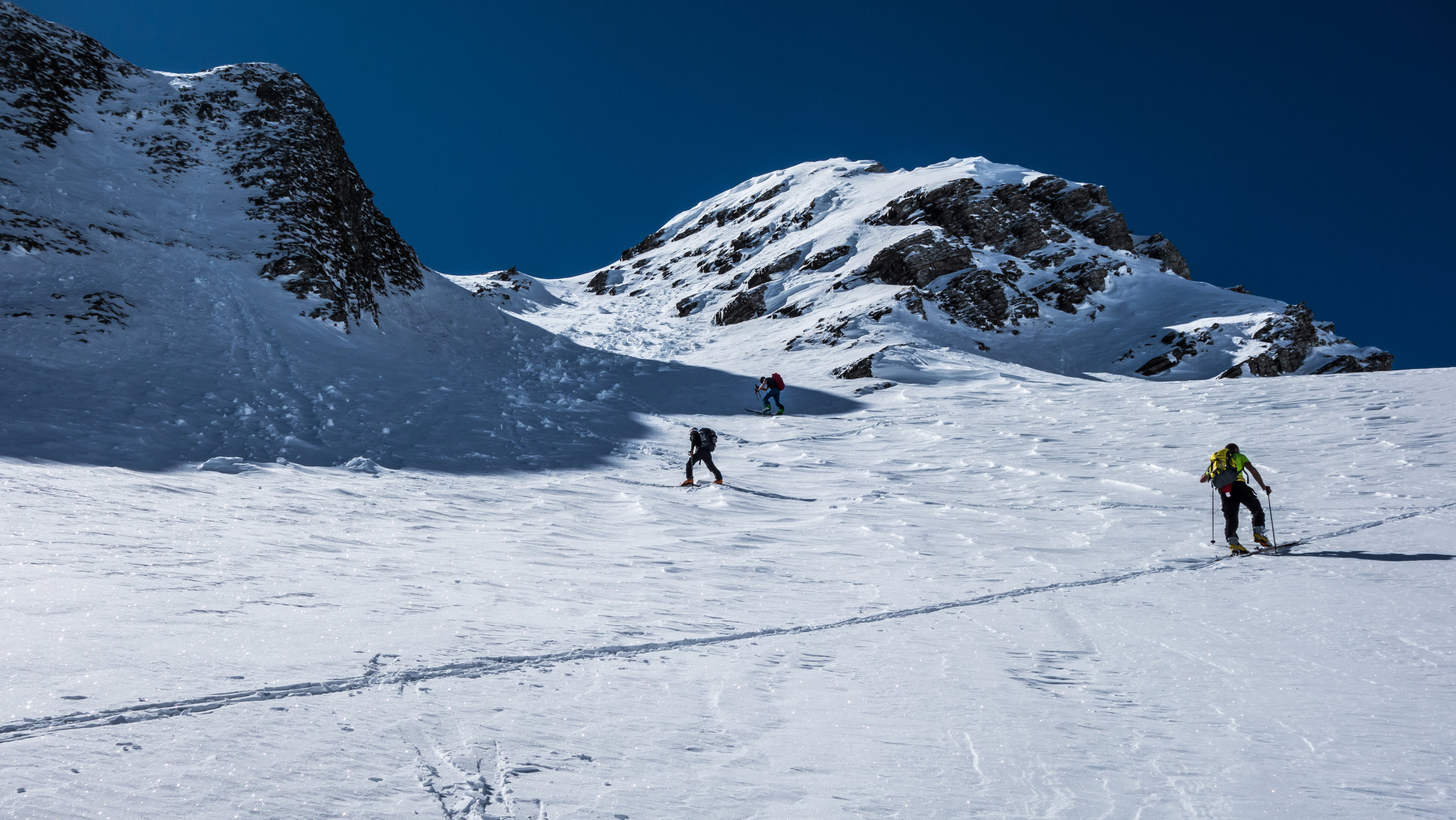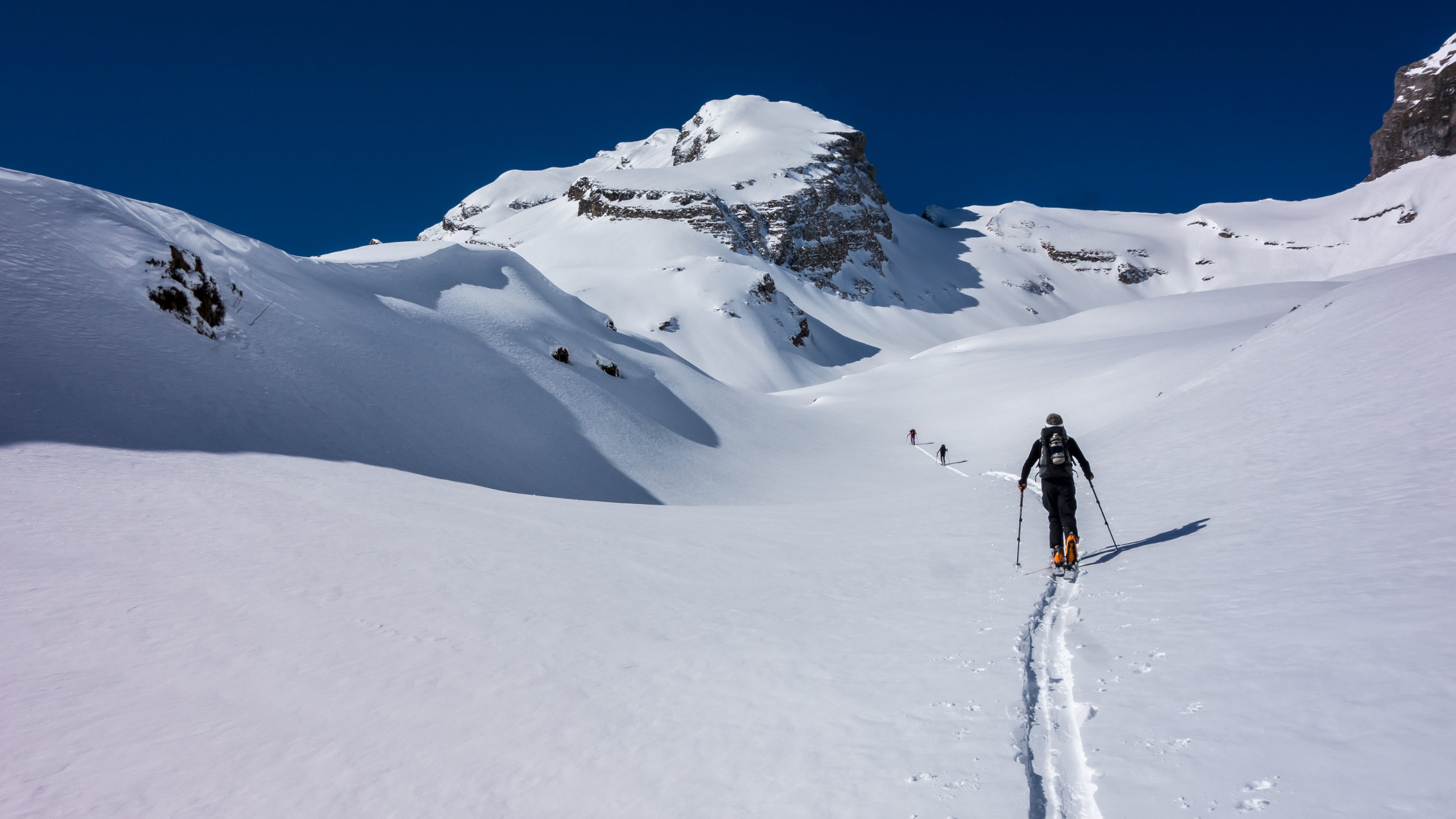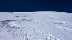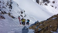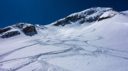 Ab Wasserreservoir durchgehende Schneedecke, keine Steine. Heute gute, einfache Aufstiegsspur. Die Schlüsselstelle im oberen Teil beim Felscouloir war heute bei gutem Trittschnee zu Fuss einfach zu bewältigen.
