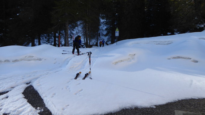 sehr sonnig, viel Schnee von unten bis oben, gedeckelt zu Beginn, oben schön pulvirg, beim Runterfahren leicht sulzig. Strasse ab Sali unten schneefrei, durch den Wald aufsteigen problemlos.