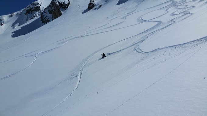 Grand Beau. Auf der Engstligenalp rund 20cm gesetzter Neuschnee. Wollten eigentlich den Lift nehmen und danach unter der Strubelegga durchqueren. Die Hänge sahen aber geladen aus, weshalb wir über den Strubelgletscher aufstiegen. Die Querung wurde aber später von mehreren Leuten gemacht, ohne dass etwas abging. Unter dem Frühstücksplatz fuhren viele wieder ab, da die Querung noch nicht gespurt war und eine dicke Wechte darüberhängt. Ein Bergführer der Adelbodener Bergschule hat sich dann durchgeschaufelt und damit seiner Gruppe und allen nachfolgenden den Weg freigemacht - tausend Dank. Für den Aufstieg auf den Frühstückplatz müssen die Ski getragen werden und allzu lange unter der Wechte zu verweilen ist nicht empfehlenswert. Neben uns waren knapp 10 Leuten auf dem Grossstrubel. 2 Spuren am Steghorn und einige wenige Abfahrtspuren vom Mittel- und Westgipfel. Abfahrt um 13.30. Plateau abgeblasen und hart, von 3200m bis Frühstücksplatz windgedeckelter Pulver und nach dem Frühstücksplatz bis auf die Engstligen gesetzter Pulver, der sich noch herrlich schieben lässt.