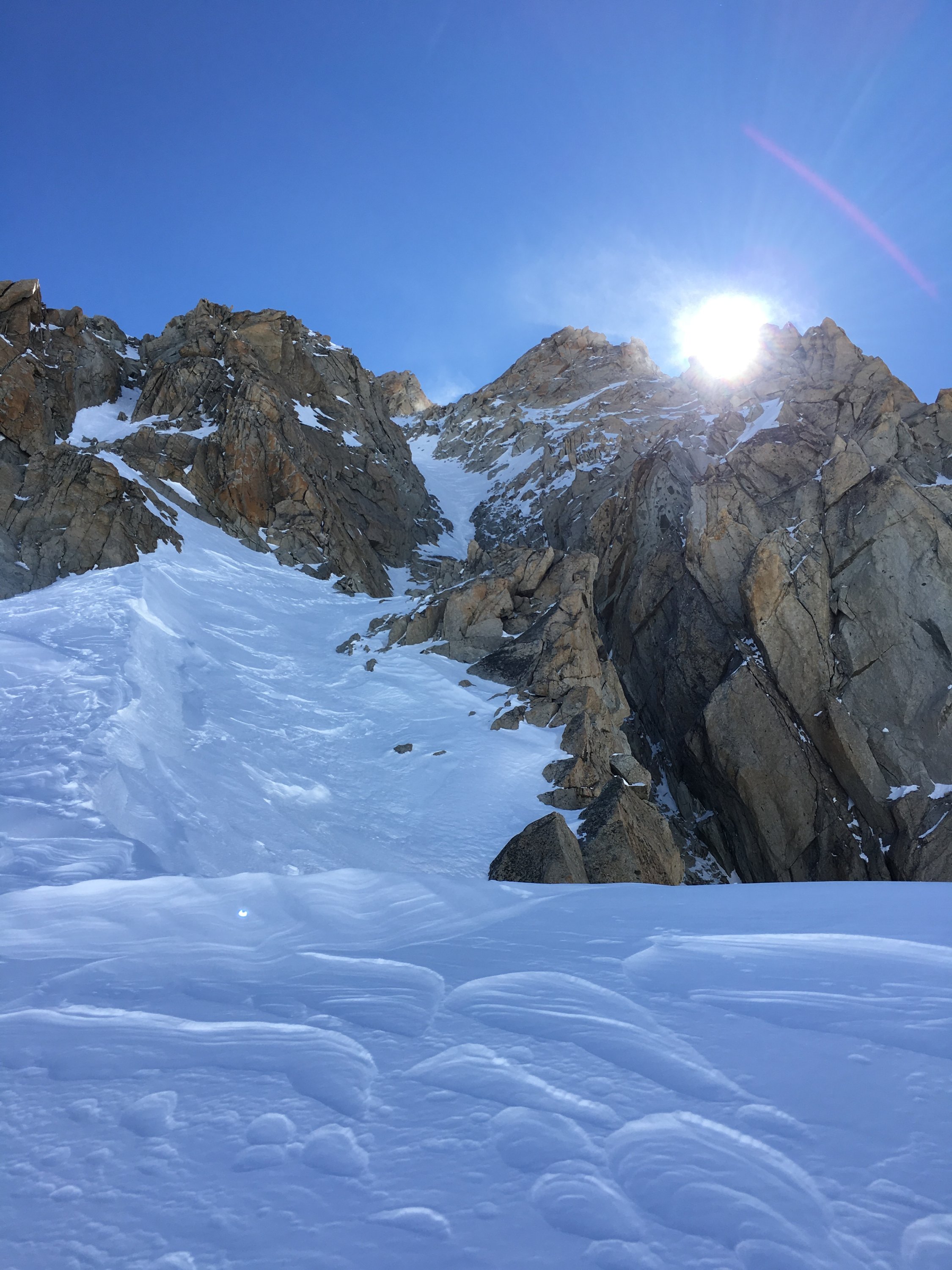 Gletscher gut eingeschneit. Schnee nicht richtig verfirnt, daher häufig Bruchharsch. Im Couloir selber Pulver, abwechselnd mit Pressschnee; an 3 steilen Stellen kurz Blankeis, das kaum mit Ski befahren werden kann. Querung auf 3550 gut machbar. Allgemein eher magere Schneeauflage im Couloir. Abfahrt war aber knapp durchgehend möglich, stellenweise mit Pickel in der Hand abgerutscht.