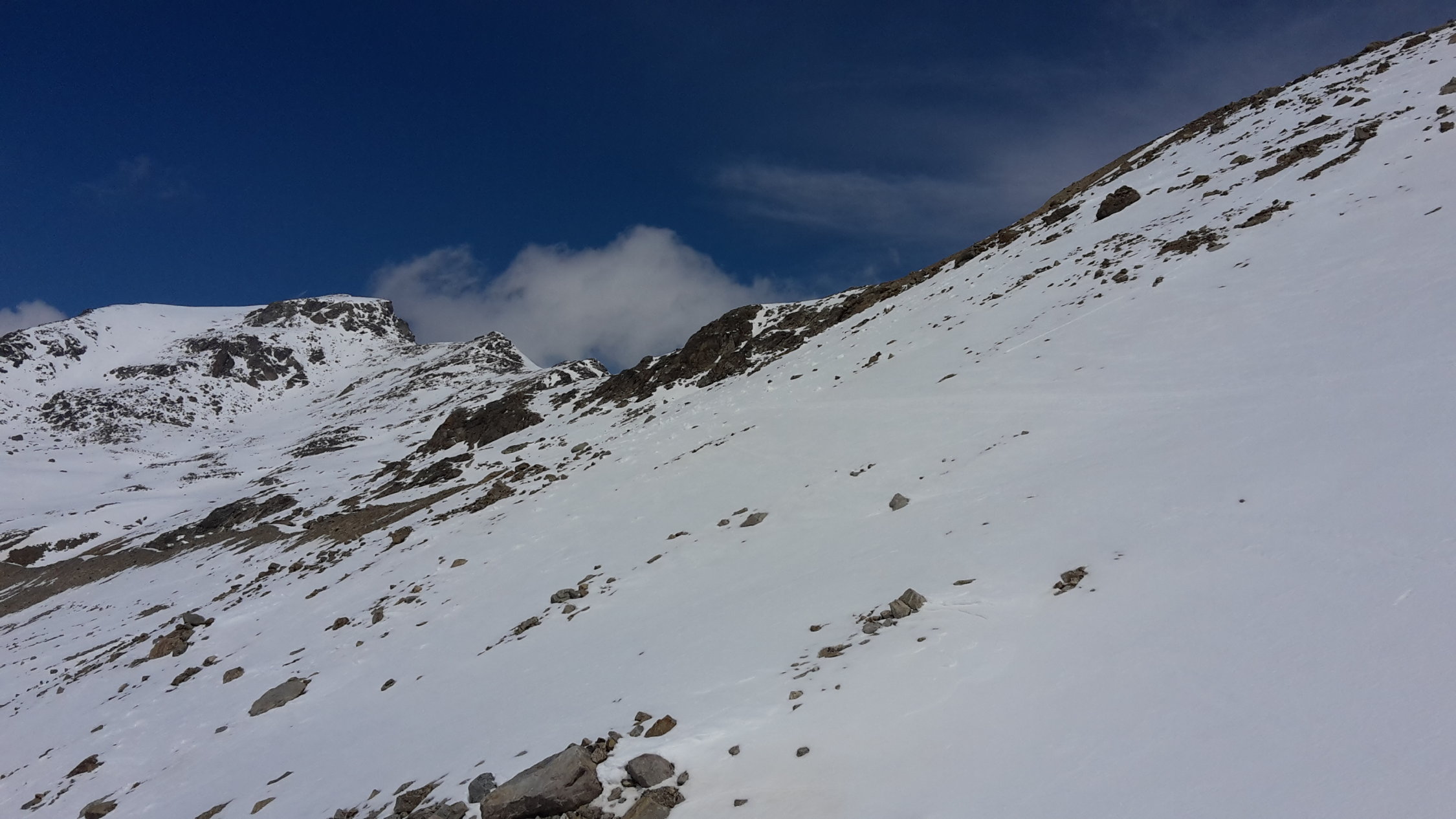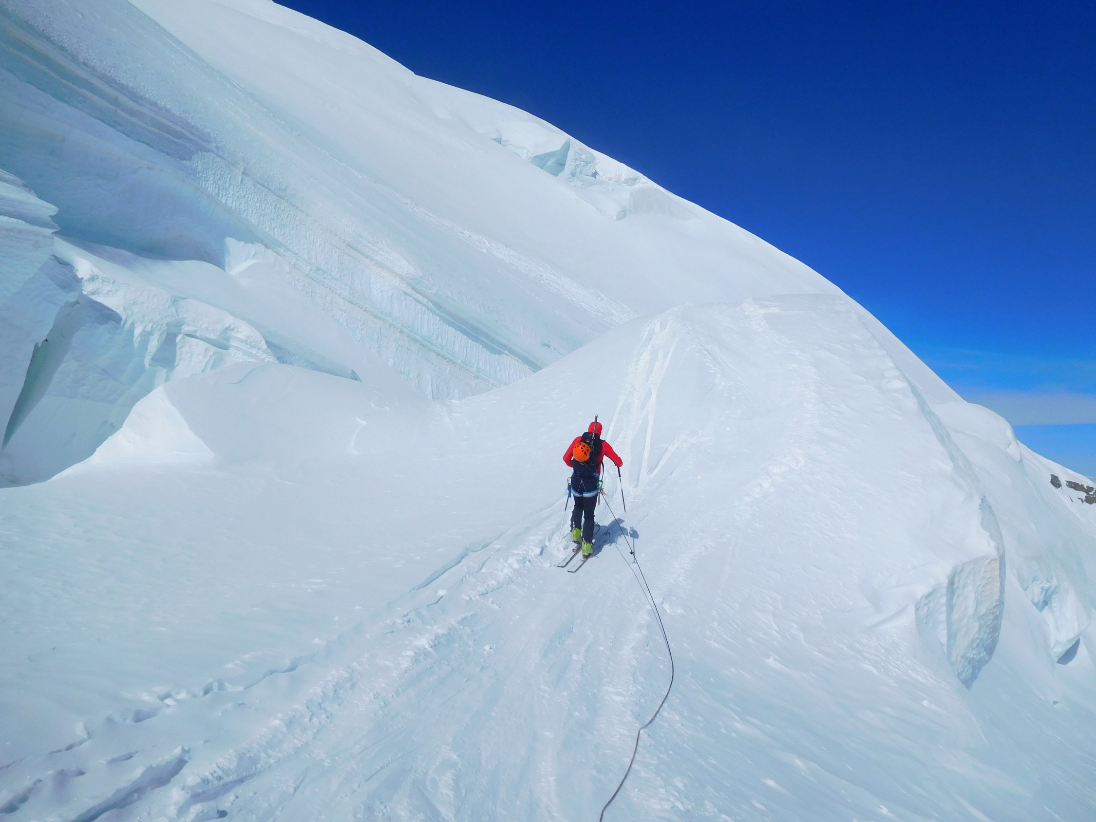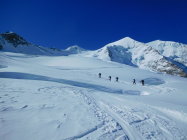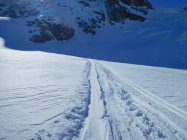 Nach einer längeren Fahrt ins Engadin, wurde rechtzeit um 8.00 Uhr die erste Bergfahrt der Diavolezza erreicht,die Berninagruppe zeigte sich Wolkenlos von ihrer schönsten Seite, dann folgte eine ruppige hartgefrohrene Abfahrt zwischen Steinen auf den Vadret Persgletscher, am 8.30 Uhr konnte angefellt und angeseilt werden, zuerst noch Flach dann immer steiler weiter in Richtung Camrena-Eisbrüche die von links nach rechts gequert werden, vorbei am Schnappsboden, unterhalb des Skidebots wurde es windig die Aufstiegsspur wurde in einigen Abschnitten zugedeckt.