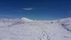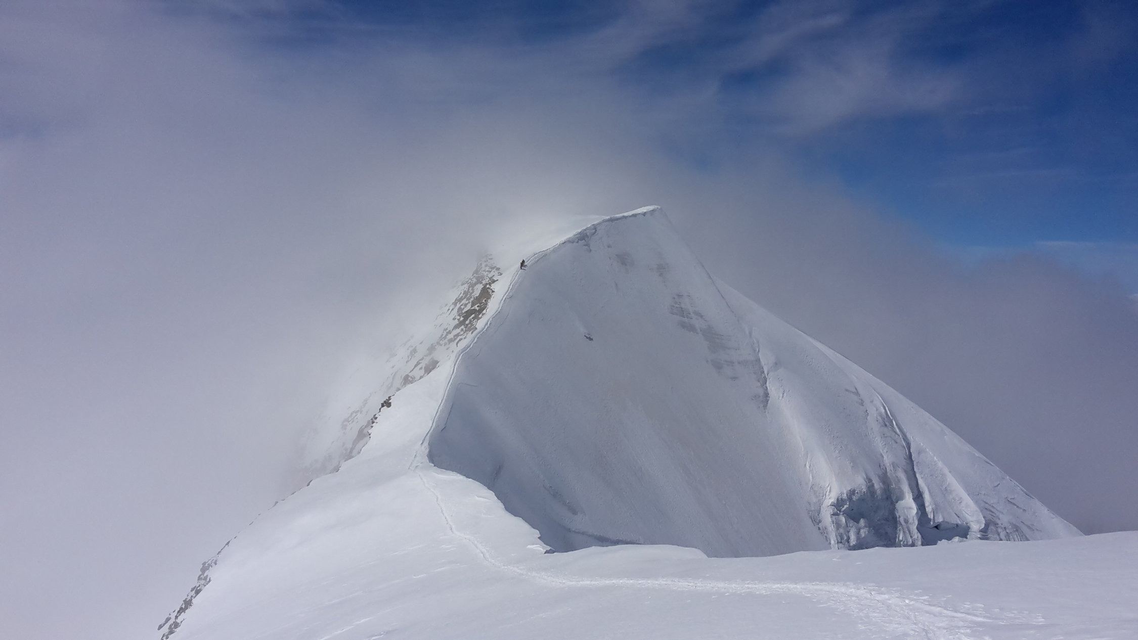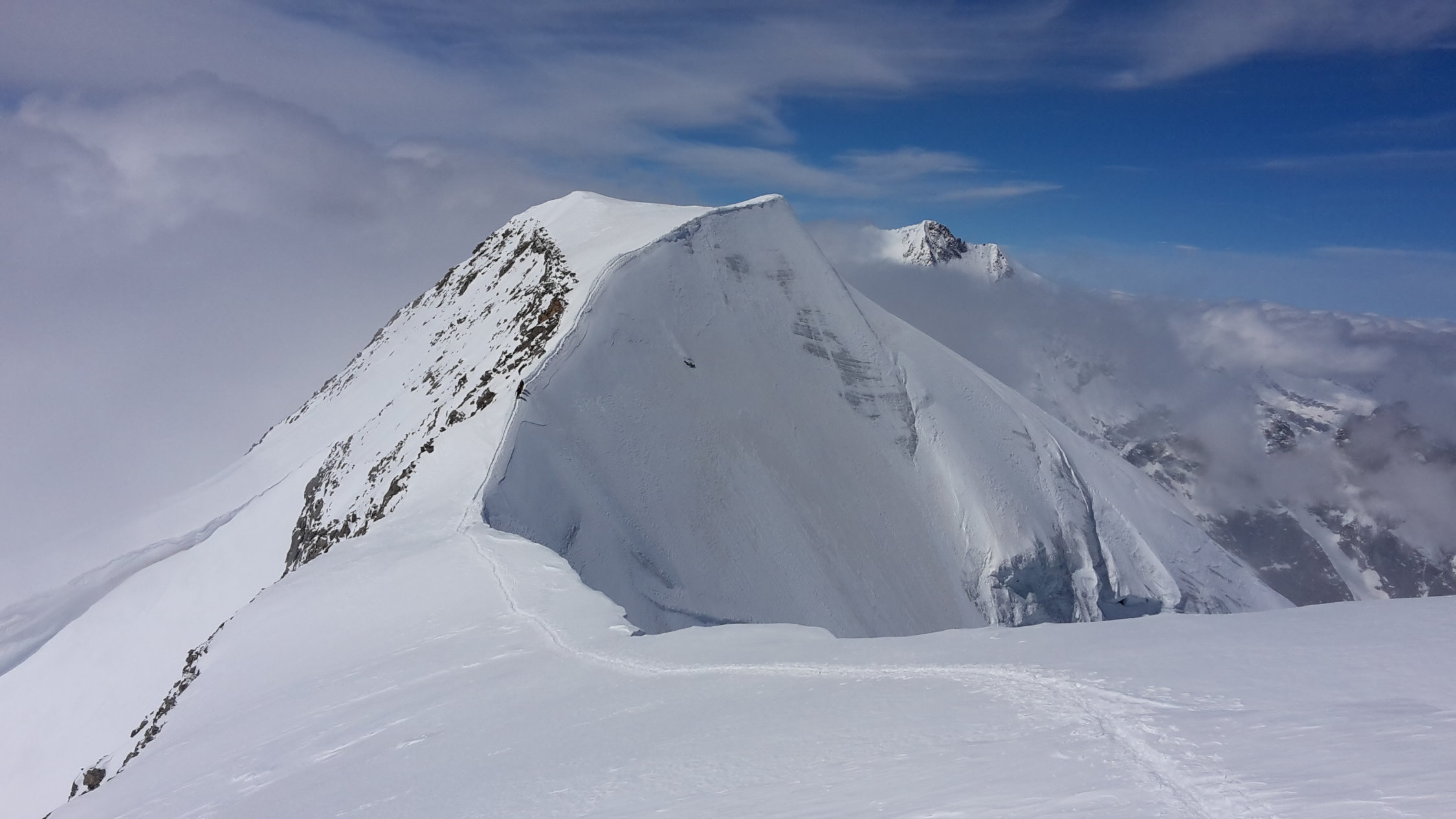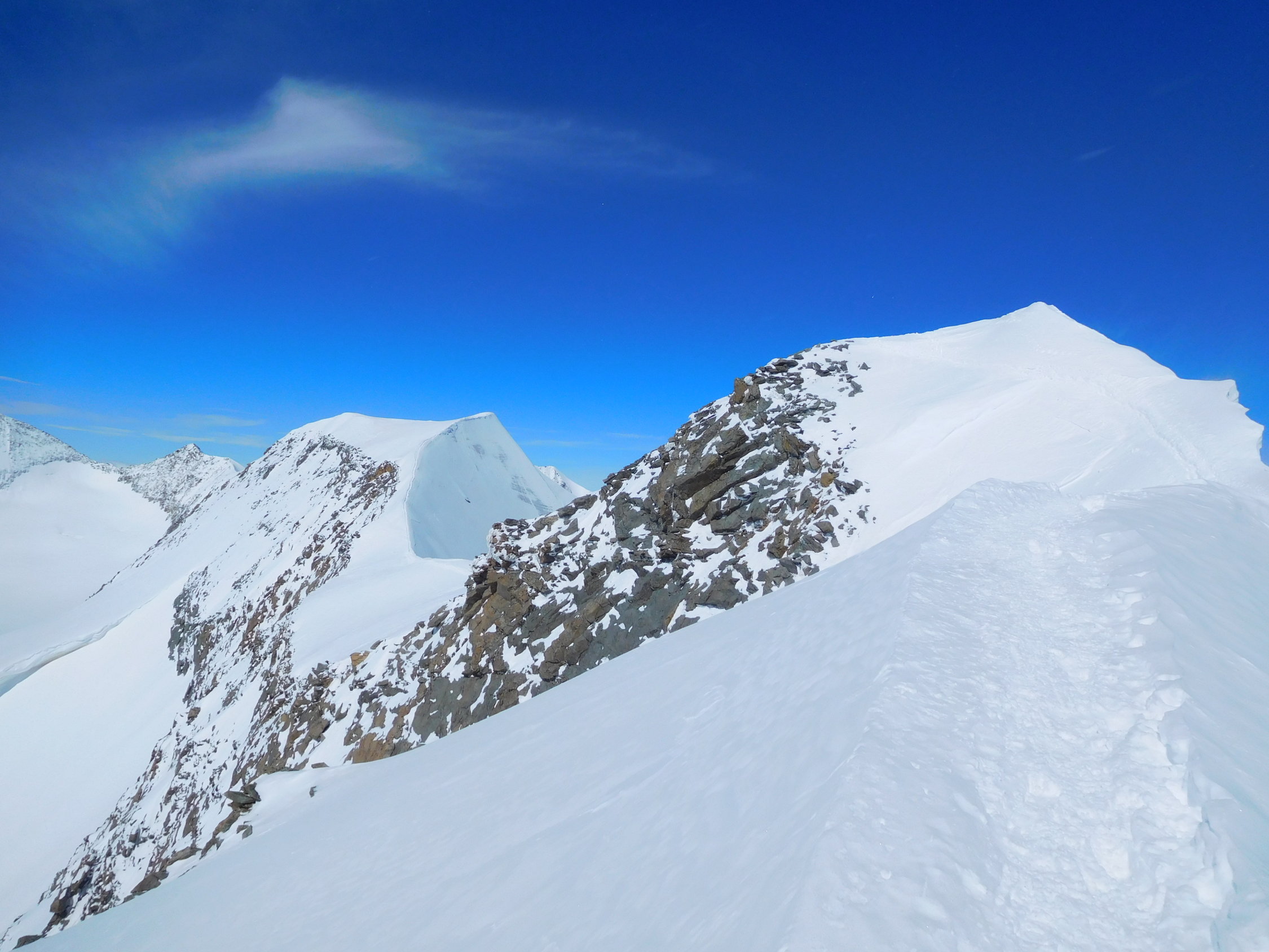 der Fussaufstieg zum Ostgipfel ist recht steil, er verlangte noch einmal alle Engergie von uns ab, nach einem kurzen Abstieg folgte noch das Finale über den sehr schmalen exponierten Schneegrat zum Hauptgipfel, leider kamen Nebelschwaden auf, begleitet von Windböen und die Gipfelrast wurde kurz, zurück um die Mittagszeit beim Skidebot konnten die Ski montiert werden, die Verhältnisse für die Abfahrt waren sehr gut, oben noch Pulverschnee, weiter unten Presspulverschnee, dann folgte noch der Aufstieg zur Diavolezza mit 200 Höhenmetern auch nochmals recht anstregend, die Schlussabfahrt entlang der Piste zur Talstation der Diavolezza hat noch durchgehend Schnee, sie war der Hammer.