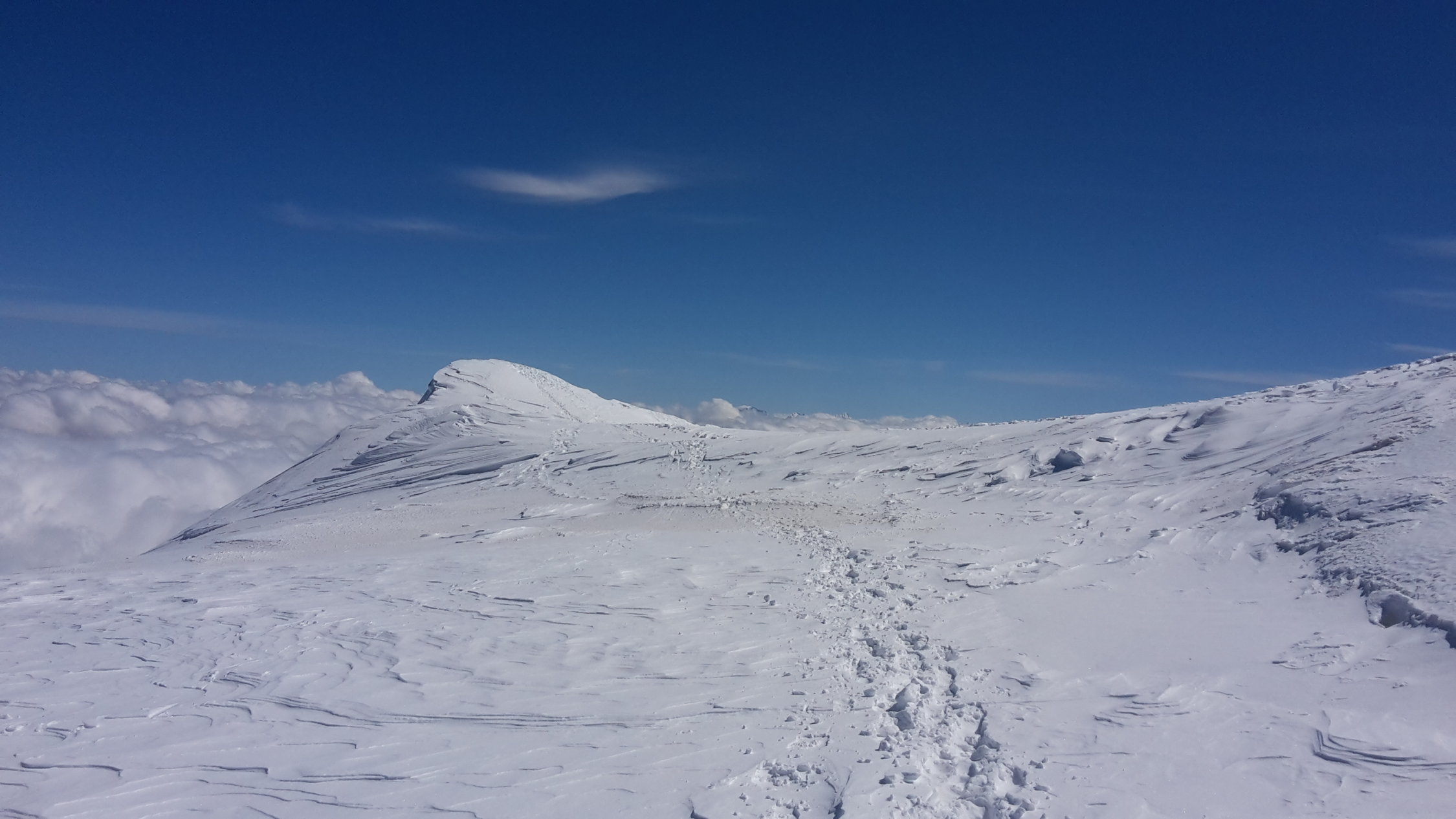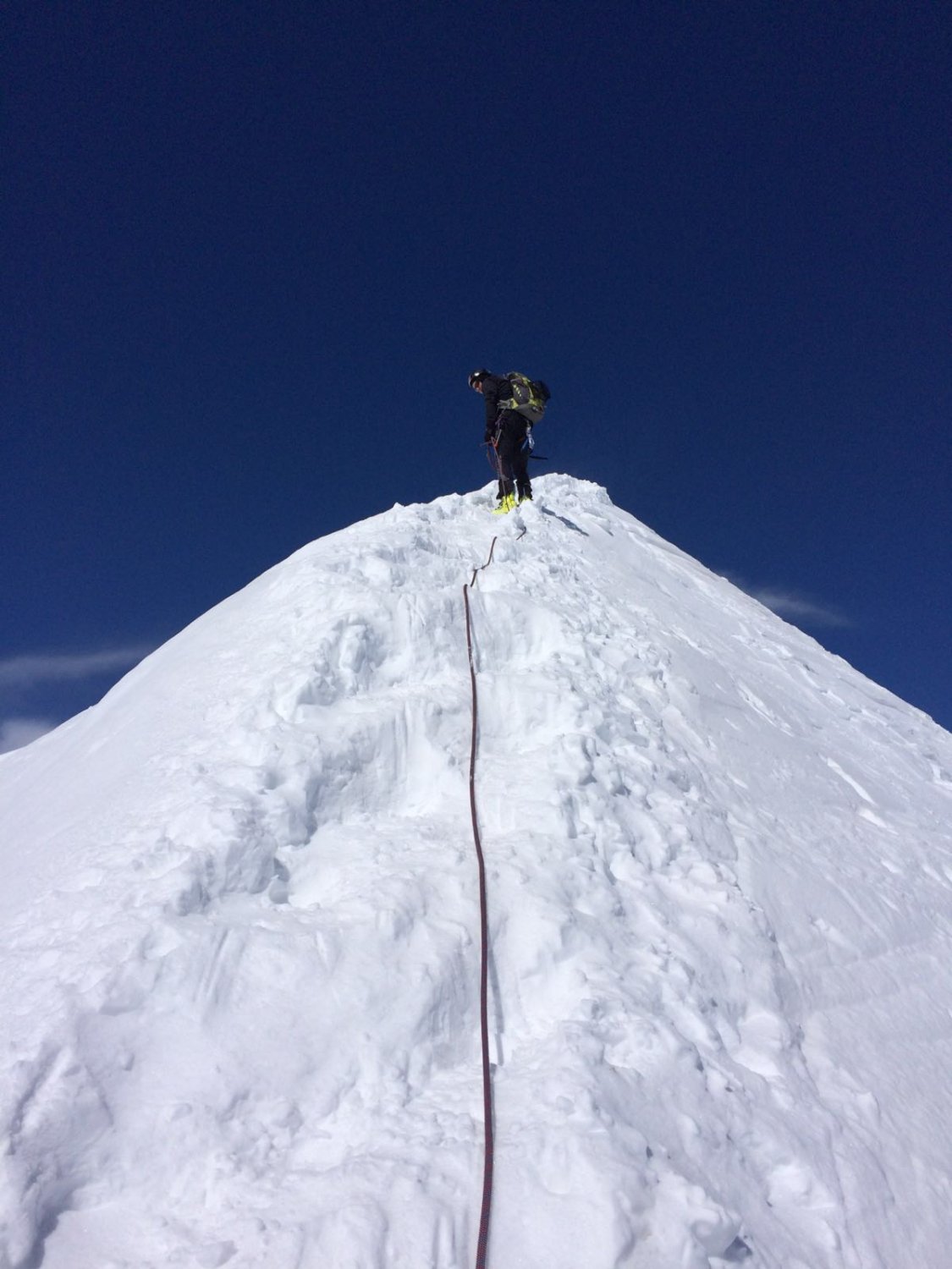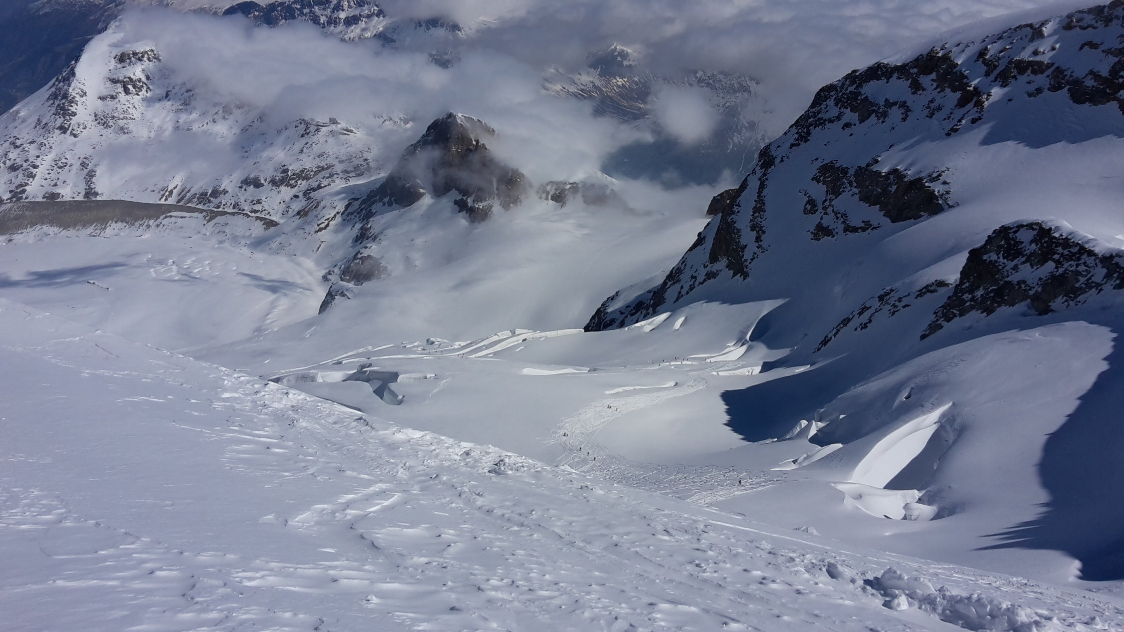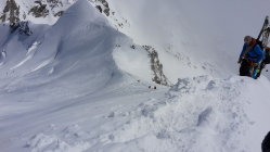der Fussaufstieg zum Ostgipfel ist recht steil, er verlangte noch einmal alle Engergie von uns ab, nach einem kurzen Abstieg folgte noch das Finale über den sehr schmalen exponierten Schneegrat zum Hauptgipfel, leider kamen Nebelschwaden auf, begleitet von Windböen und die Gipfelrast wurde kurz, zurück um die Mittagszeit beim Skidebot konnten die Ski montiert werden, die Verhältnisse für die Abfahrt waren sehr gut, oben noch Pulverschnee, weiter unten Presspulverschnee, dann folgte noch der Aufstieg zur Diavolezza mit 200 Höhenmetern auch nochmals recht anstregend, die Schlussabfahrt entlang der Piste zur Talstation der Diavolezza hat noch durchgehend Schnee, sie war der Hammer.