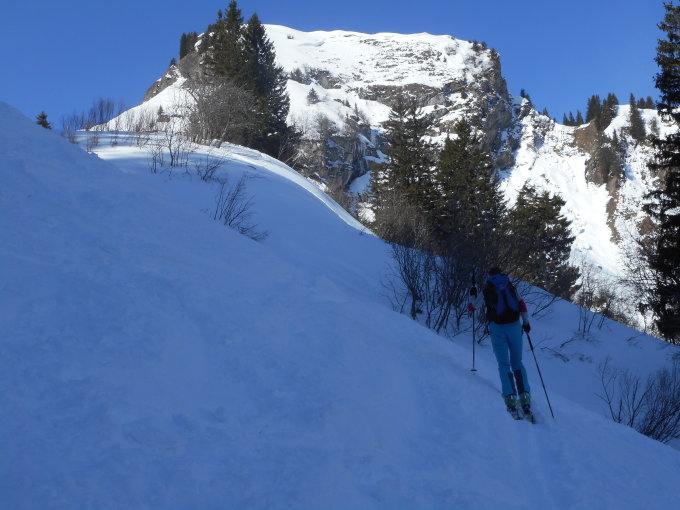 In den Süd- und Westhängen mehrere ältere Grundlawinen gesehen. Auf vielen Gräten hats Riesen-Wächten. Das zeigt uns die starken Winde der letzten Wochen an. Vorsicht vor Triebschnee-Ansammlungen.