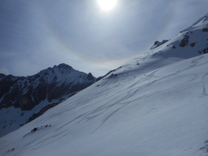 Aufstieg: Korrektur zur Routenbeschreibung. Wir sind direkt über Vers les Lacs aufgestiegen. Die oben beschriebene Route wählten wir als Abfahrtsroute. Die Aufstiegsspur war ausgezeichnet angelegt. Die klare Nacht hatte eine gute Abstrahlung zur Folge. Im unteren Teil schöner Firnaufstieg, oben teilweise Pulverschnee. Der nach Süden ausgerichtete Gipfelhang hatte Sulzschnee.