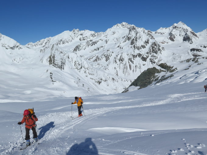 Sonntag dann Schneefall und wenig Sicht, eher winterlich am 1. Mai, trotzdem nicht so schlecht wie vorhergesagt. Wir konnten noch eine kurze schöne Tour Richtung Ölgrubenjoch machen.