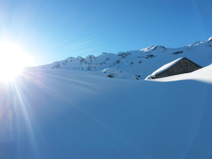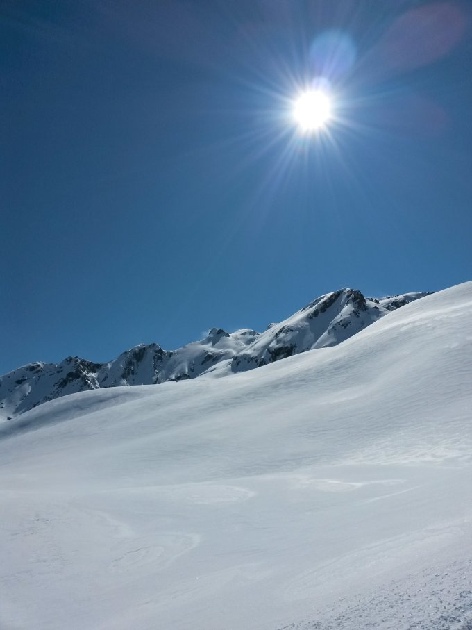 Am Gipfelhang nicht optimale Schneeverbindung, daher keine direkte Abfahrt