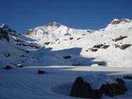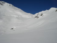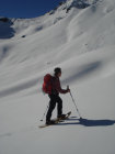 Abstieg in weichem Schnee. Das ganze Gebiet ist ab dem Sommerweg noch bestens eingeschneit. Eine Skitour lohnt sich, wenn man die Abfahrt auf dem Sommerweg, der stellenweise aper ist, nicht scheut.