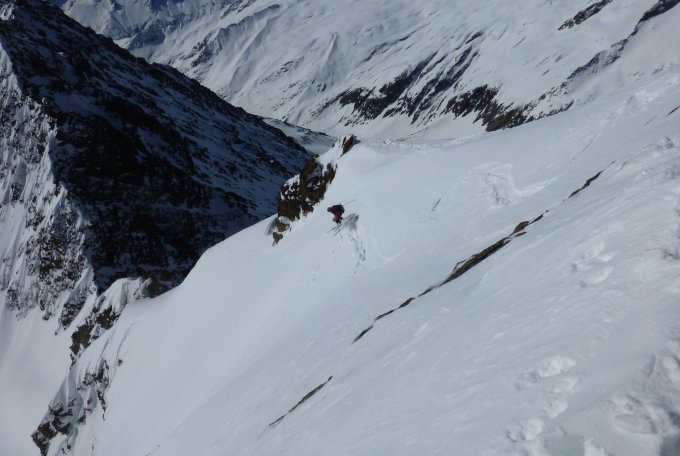 Bis 3000 müM hart, nach oben wenig Pulverauflage. Zum Sattel und auf den Gipfel strenges Spuren, teils über Knietief.