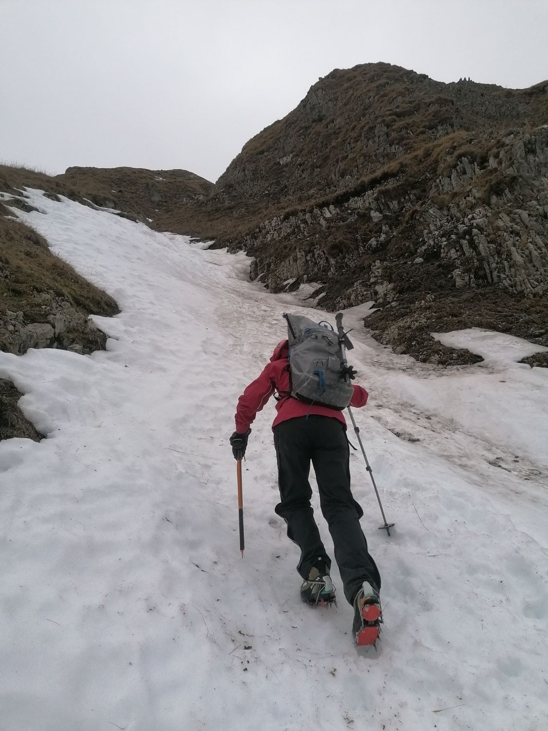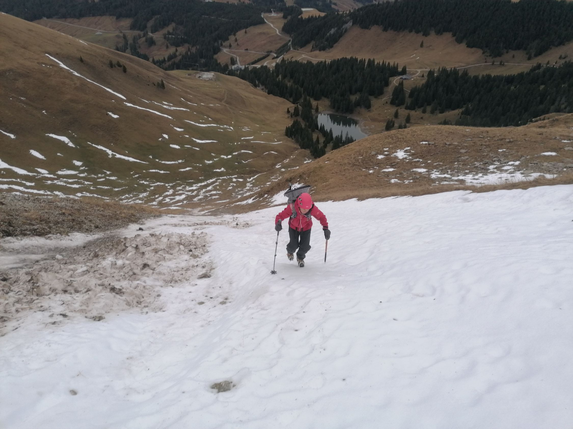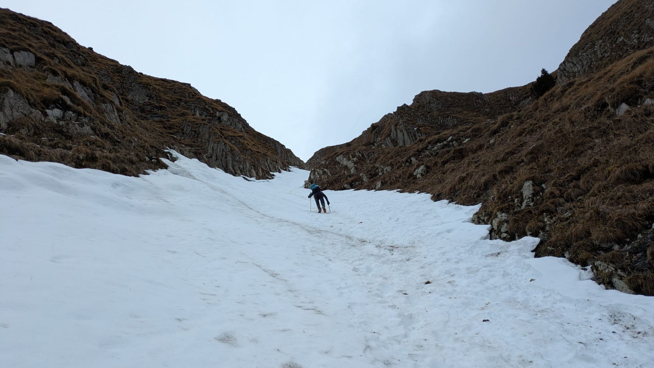 Der Aufstieg erfolgte von der Unteren Gantrischhütte rechts in die Nordwand hinein. Nach dem ersten Drittel biegt man nach rechts, ins sogennannte Bunker-Couloir. 300m lang, und 35 bis 45 Grad steil.