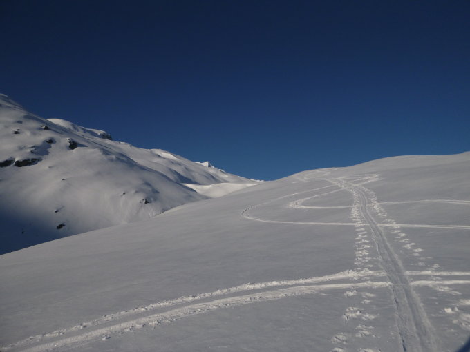 strenger Spurarbeit hoch zum Sattel vor dem Gross Muttenhorn (Pkt.2935). Anschliessend mit Pickel und Steigeisen bewaffnet den Gipfelgrat in Angriff genommen. Da es aber auf dem Grat noch sehr viel Schnee hat, war das Vorwärtskommen extrem mühsam, und wir haben die Wühlerei nach kurzer Zeit abgebrochen, insbesondere weil die direkte Abfahrt vom Sattel entlang der Route 980d verlockend gut aussah. Also haben wir die super Abfahrt Richtung Geretal genossen, und konnten auf dem Restschnee im Geretal bis ca. 1500 müM abfahren bzw. runterstöckeln.
