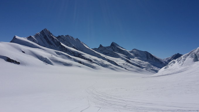 Start der Tour am 9.15 Uhr beim Jungfraujoch, nach einer vergnüglichen Bahnfahrt bei schönstem Wetter, entlang der Piste zum Mönchsjoch zum ersten Fellwechsel, Abfahrt durch Pulverschnee über das Ewigschneefäld, der Aufstieg zum Fieschersattel war schon gespurt und führte weit hinauf, am Fischersattel begrüsste uns ein zügiger Wind, mit Ski konnte bis kurz unterhalb des Hinter Fiescherhorn aufgestiegen werden, nur noch wenige Meter zu Fuss zum Gipfel,