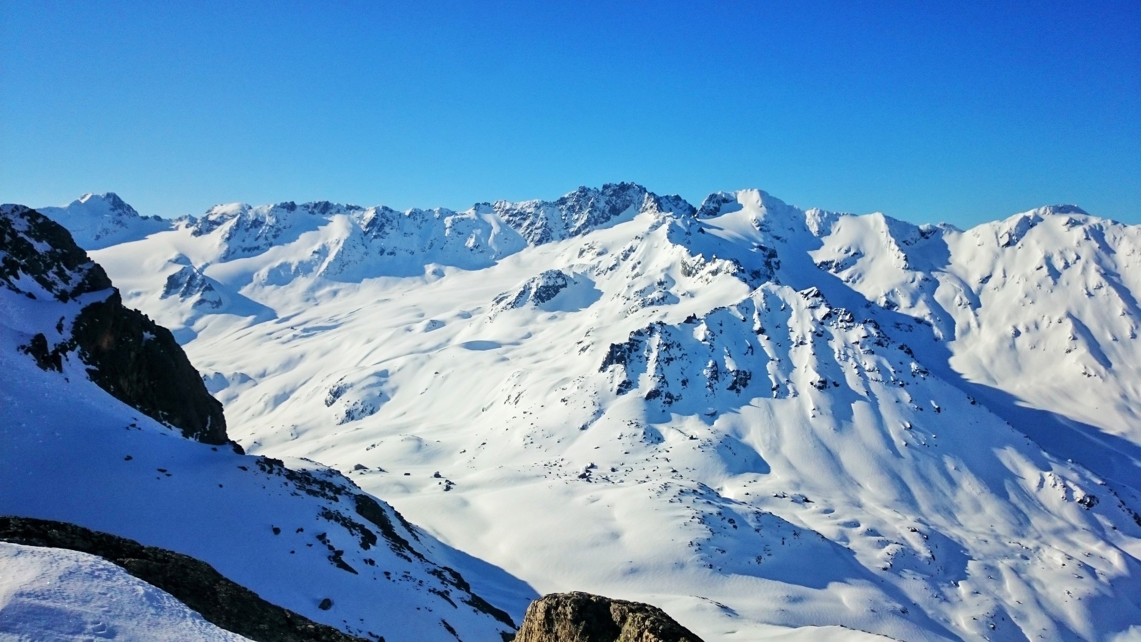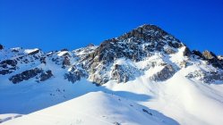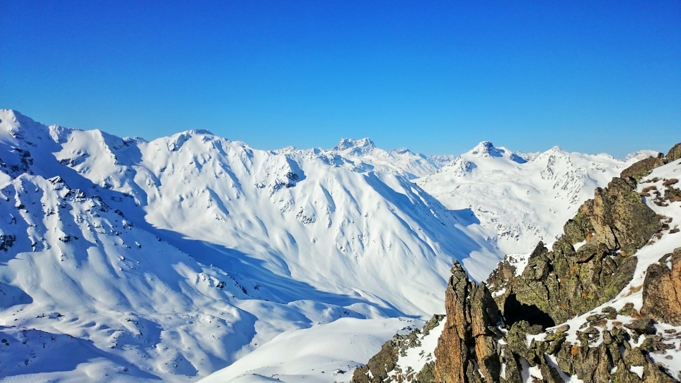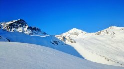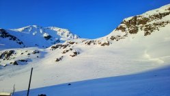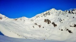 Top Verhältnisse, untere Hälfte Firn, oberer Teil auch noch Pulverschnee. Wunderschönes Skitourengelände mit zahlreichen Abfahrtsmöglichkeiten. Viele Tourengänger am Schwarzhorn 3136 m und einige am Piz Radönt 3065 m.