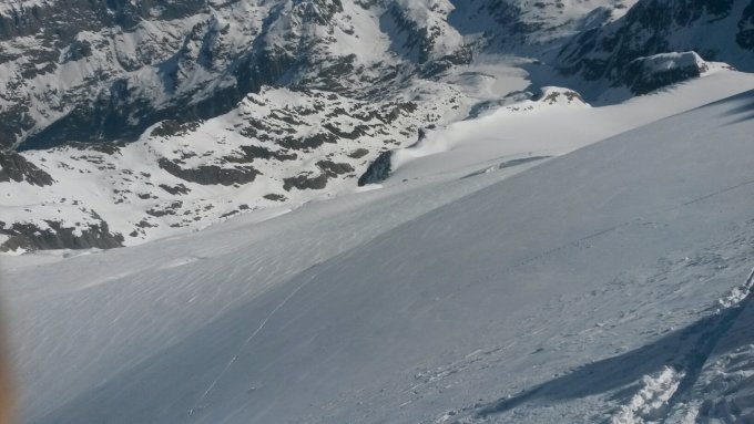 Abfahrt dann über die NO Wand bei guten Verhältnissen. Ist steil und lang; Blankeis unten links (v. oben gesehen) nicht vergessen.