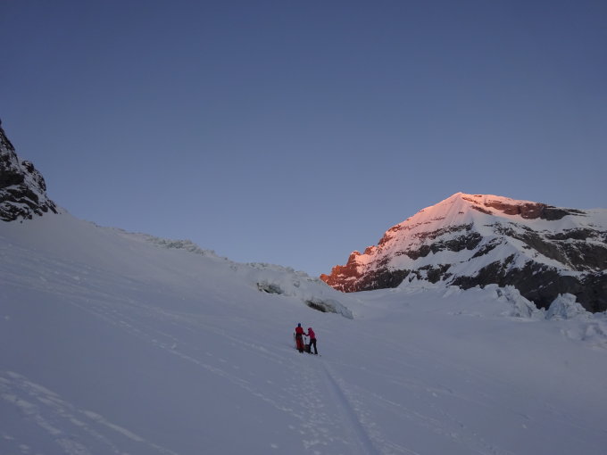 Der Fussaufsteig zum Gipfel hat sehr viel Schnee und es fehlen noch ein, zwei Nächte, damit es richtig guten Trittschnee hat.