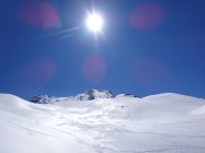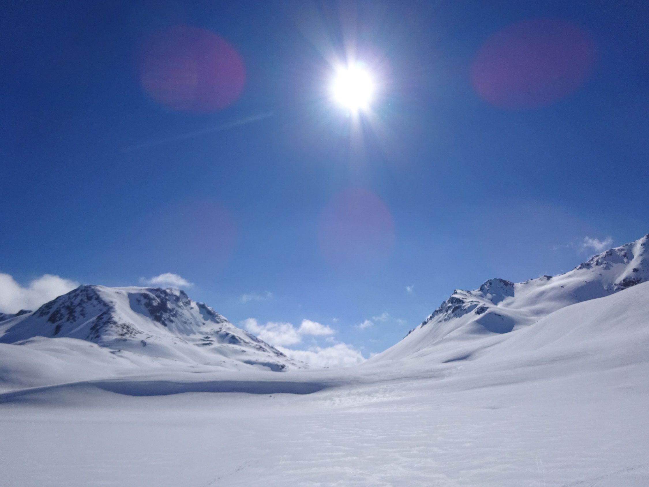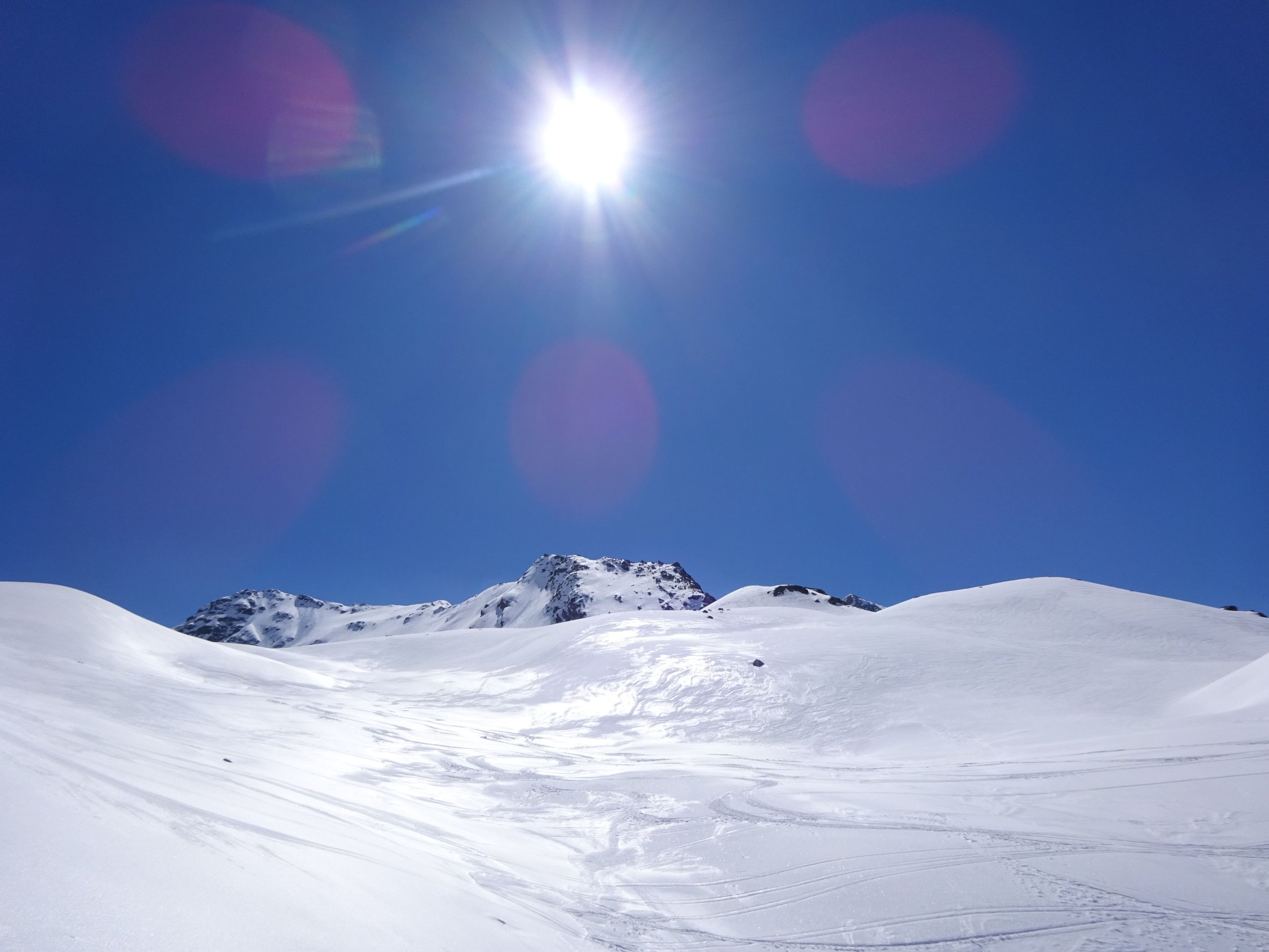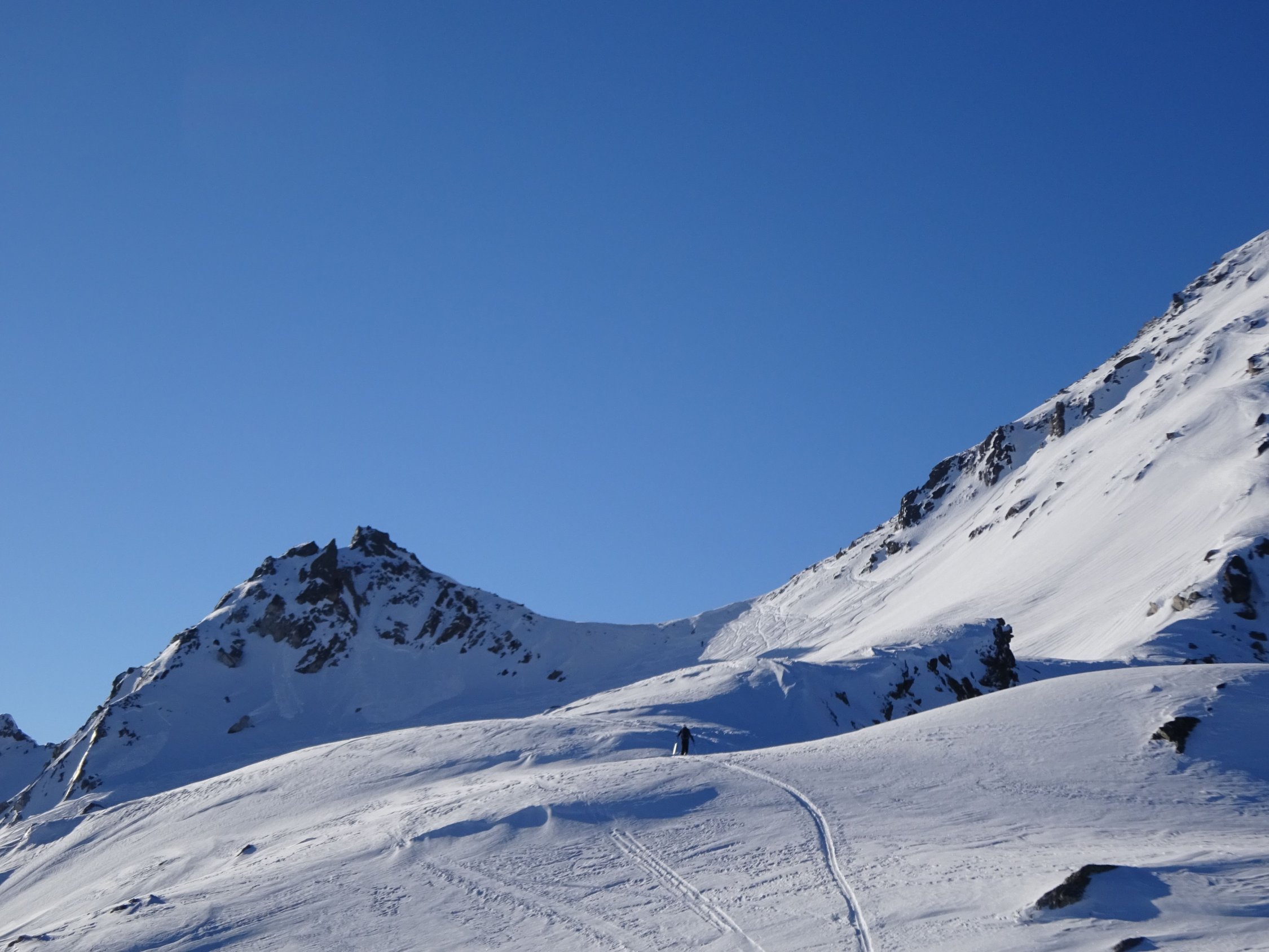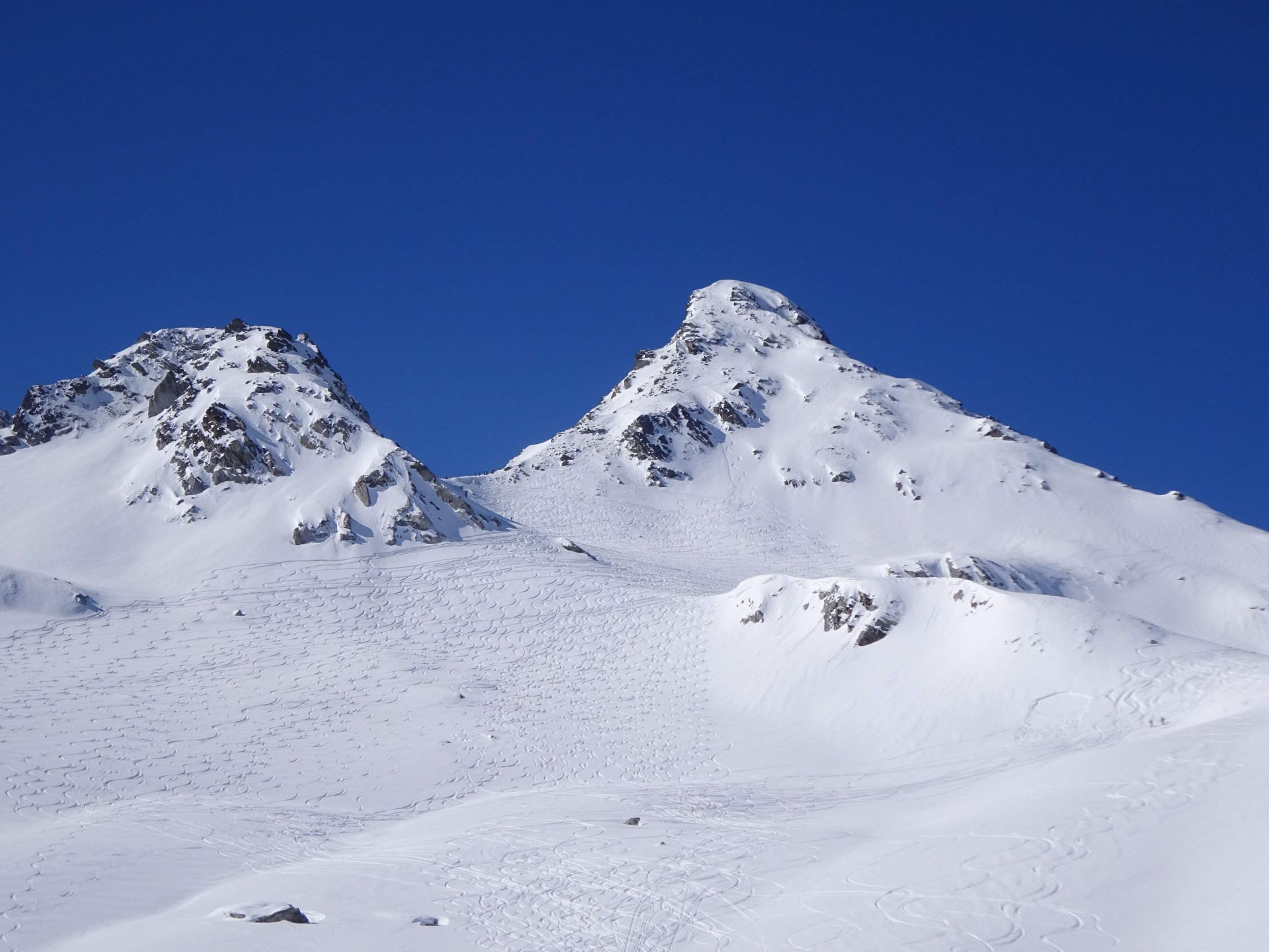 Allgemein gute Verhältnisse; das Gebiet ist in höheren Lagen gut eingeschneit. Spätestens unter der Winterlücke sind Harscheisen sehr zu empfehlen. Hingegen hat es beim Aufstieg vom Skidepot zum Gipfel guten Trittschnee. Der Pulver ist manchmal etwas brüchig und nicht ganz so grossartig wie auf den Fotos. Abfahrt von der "Wöschchuchi" um etwa 11 Uhr. Oben hart; unten schöner Firn.