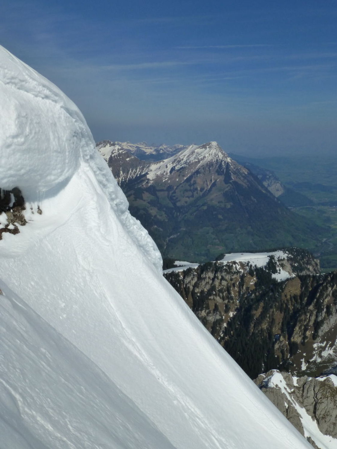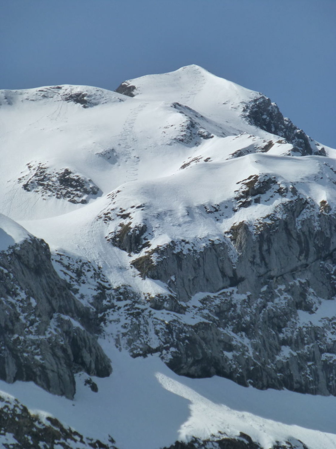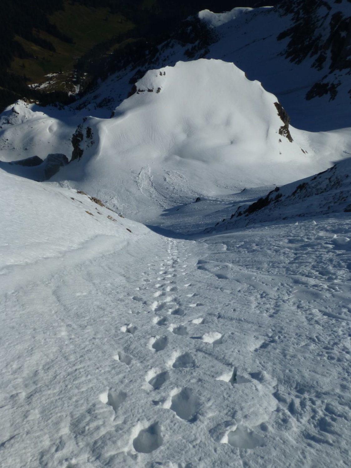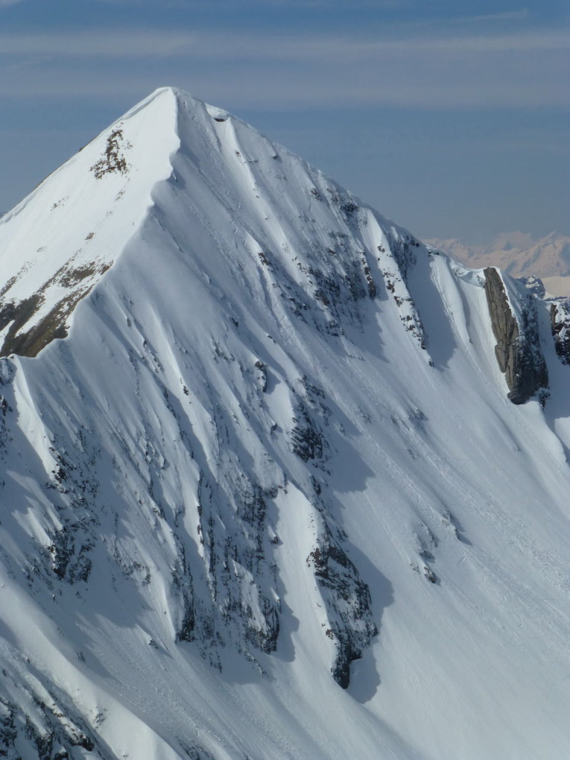 Sonnig mit zunehmenden Quell- und Schleierwolken. Strasse bis Unter Obersuld aper (Fahrverbot ab Suld). Schnee ab ca. 1375m: bis Höchstböde morgens gefroren, gegen Mittag aufgeweicht, Dreispitz N-Flanke 20-30cm gesetzter Pulver (oben in der Gipfelflanke und im Diagonalcouloir z.T. ohne Unterlage, entsprechend einige Steinkontakte: Vorsicht!), First W-Flanke und S- und -N-Grat gefroren oder angesulzt, N-Flanke oben schöner Pulver (nur wenige Steinkontakte), unten zunehmend durchfeuchtet. Mehrere ältere, z.T. grosse Nassschneelawinen.