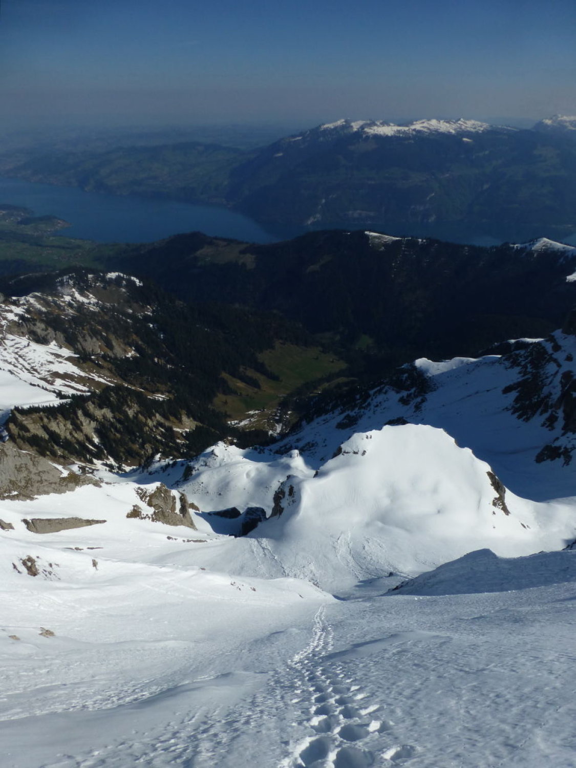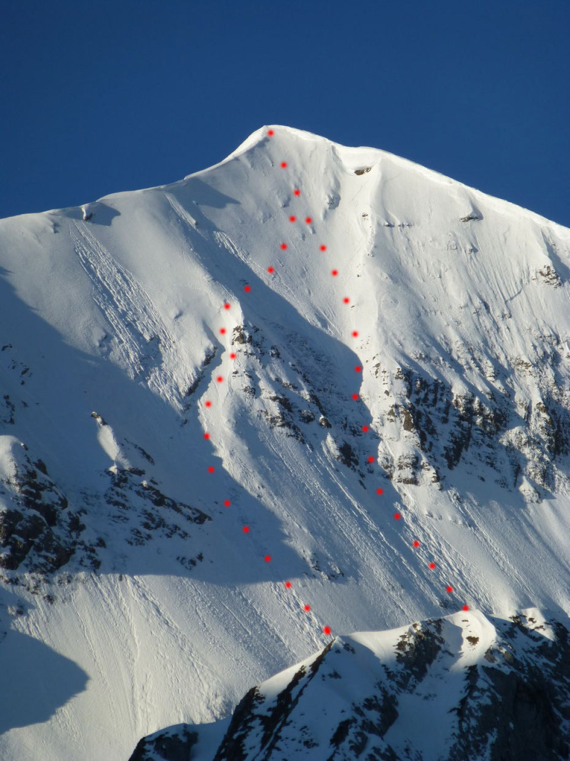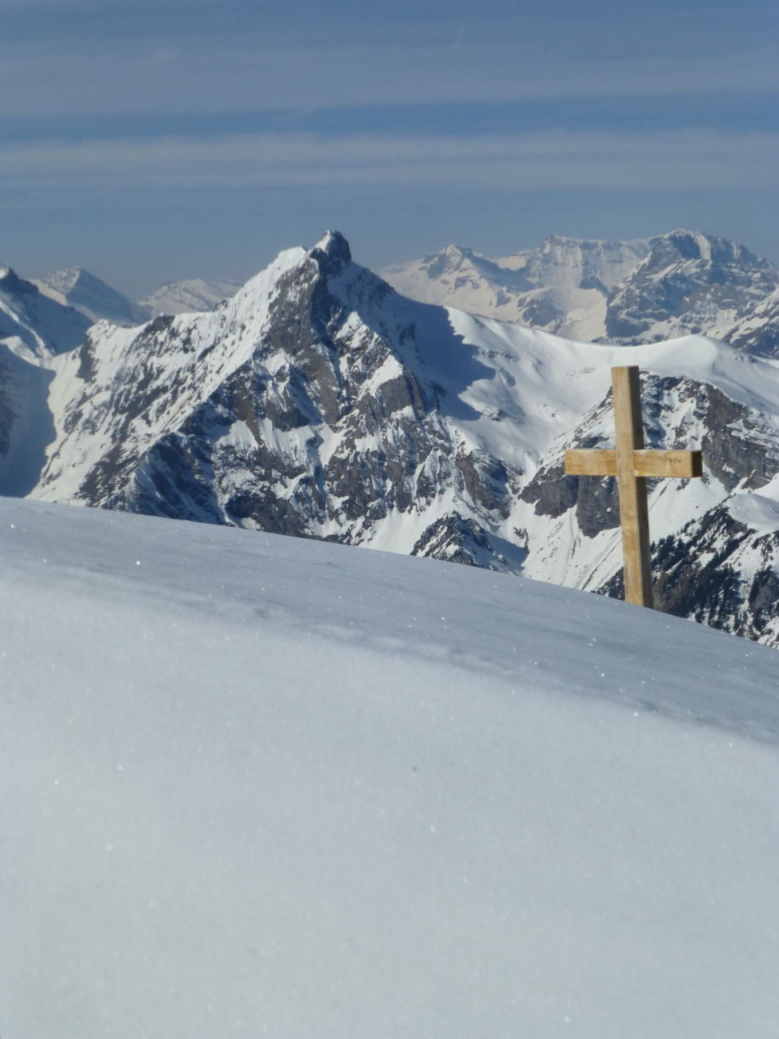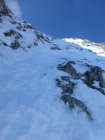 Sonnig mit zunehmenden Quell- und Schleierwolken. Strasse bis Unter Obersuld aper (Fahrverbot ab Suld). Schnee ab ca. 1375m: bis Höchstböde morgens gefroren, gegen Mittag aufgeweicht, Dreispitz N-Flanke 20-30cm gesetzter Pulver (oben in der Gipfelflanke und im Diagonalcouloir z.T. ohne Unterlage, entsprechend einige Steinkontakte: Vorsicht!), First W-Flanke und S- und -N-Grat gefroren oder angesulzt, N-Flanke oben schöner Pulver (nur wenige Steinkontakte), unten zunehmend durchfeuchtet. Mehrere ältere, z.T. grosse Nassschneelawinen.