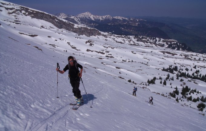 Perfekte Verhältnisse - den Brisi habe ich noch nie so gut angetroffen. Wir sind vom Hinterrugg über die Westflanke ins Gluristal abgefahren. Die Abfahrt ist sehr steil und war hart gefroren - sie eignet sich nur für gute und vor allem sichere Skifahrer. Dann unter dem Schibenstoll und Zuestollen vorbei auf den Brisi. Der Einstieg in den Brisi geht über den Sommerweg mit kurzer Tragstrecke problemlos. Weiter in guter Aufstiegsspur ohne Harscheisen bis zum Gipfel. In der Abfahrt gepresster Pulverschnee und mit zunehmender Tiefe immer tiefer werdender Sulzschnee.