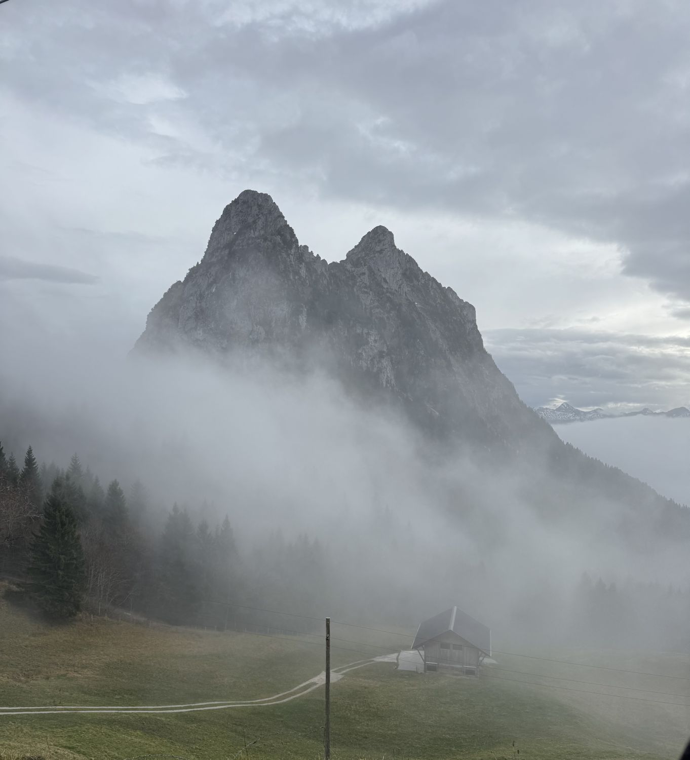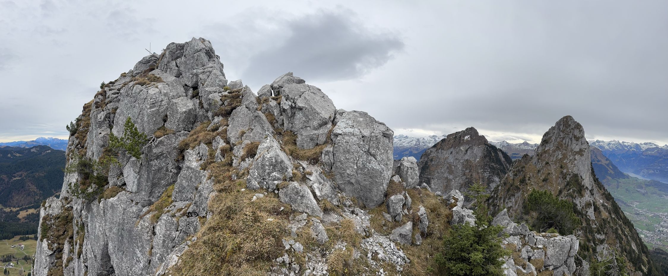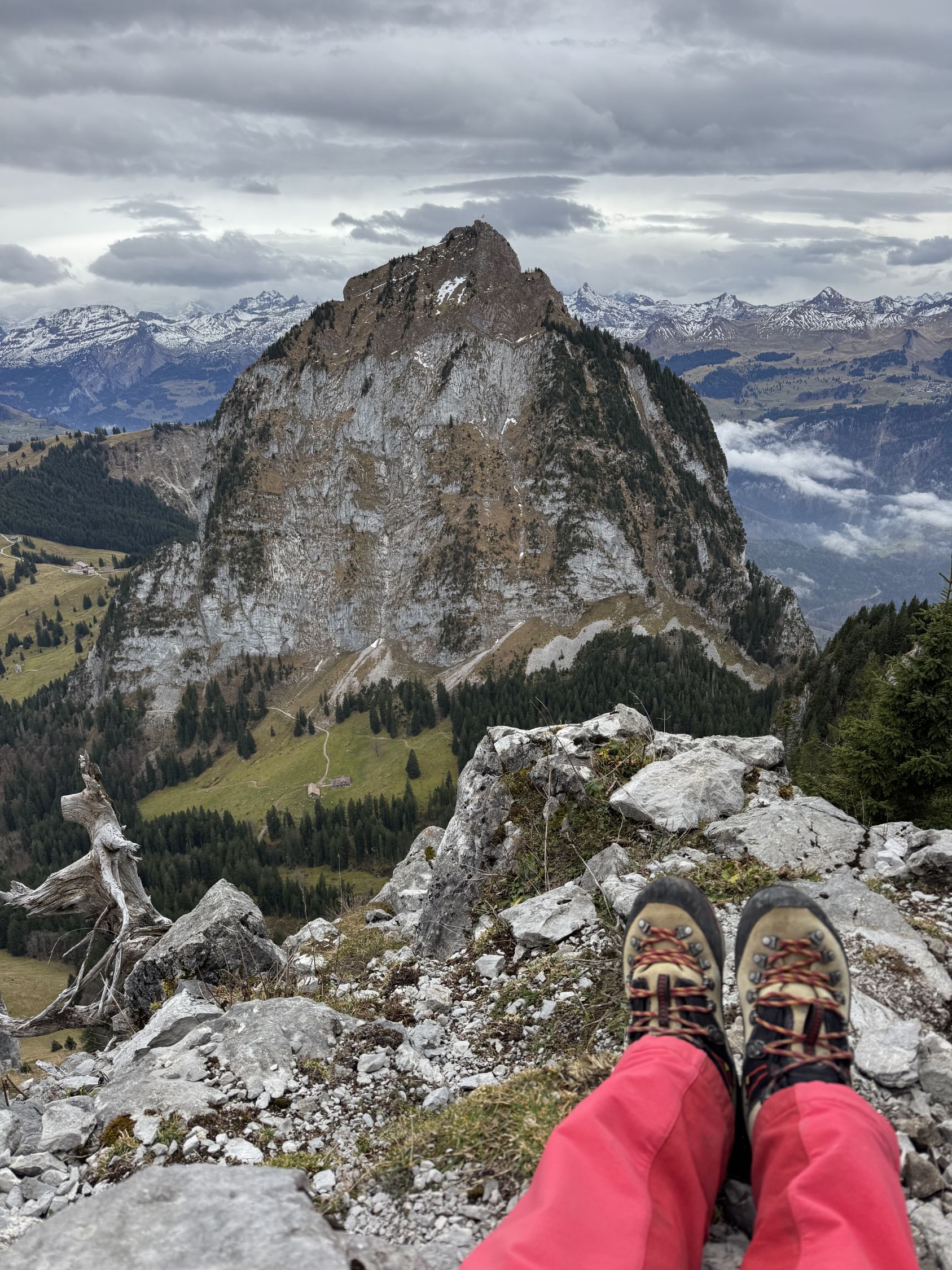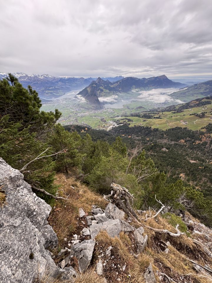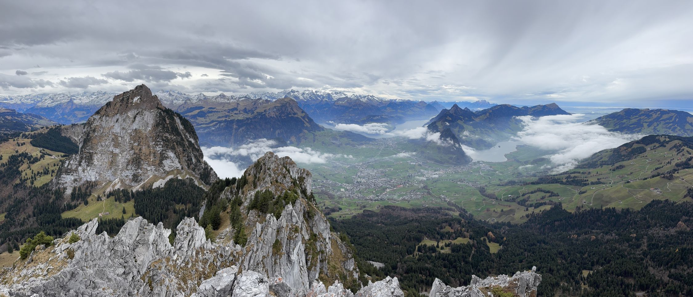 Die Aussicht auf den Mythen, an dem heute das letzte Mal die Fahne geweht hat, und den Talkessel von Schwyz war trotz bedecktem Himmel wunderschön und farbig in blau und grün. (Meine Lieblingsaussicht)