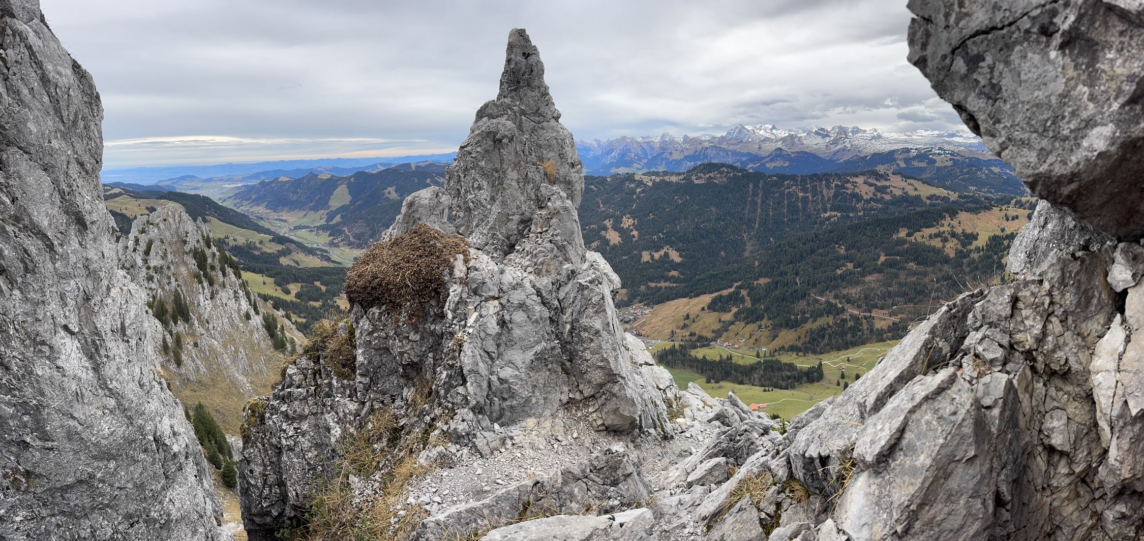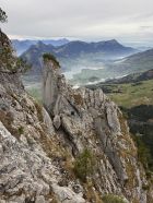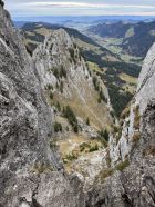 Von der Haggenegg aus bin ich auf einem nicht markierten, aber ausgetretenen Weg zum Fuss des Haggenspitz gegangen. Dann die steilen Wiesenflanken hinauf, vorbei am Klettergarten bis zur ersten Schlüsselstelle, der Felsquerung nach links. Hier muss man aufpassen, dass man nicht zu weit nach unten steigt, oben hat es bessere Griffe. Den Müller Kamin hab ich ausgelassen und bin lieber nach links abgezweigt. Diese Route führt nicht mehr durch das Couloir, sondern rechts davon sehr ausgesetzt am Grat entlang, die Umleitung ist gut mit roten Pfeilen markiert.