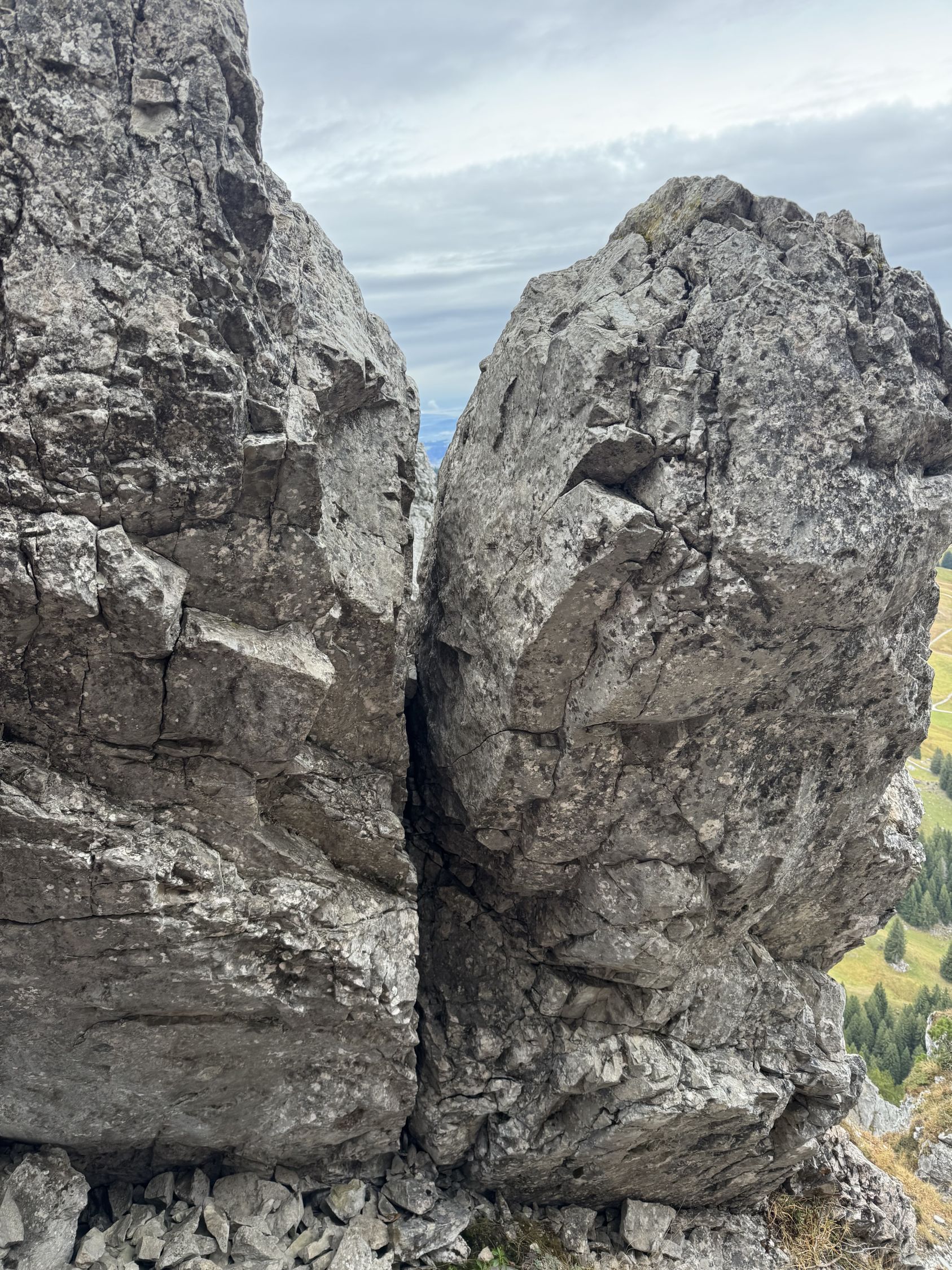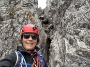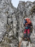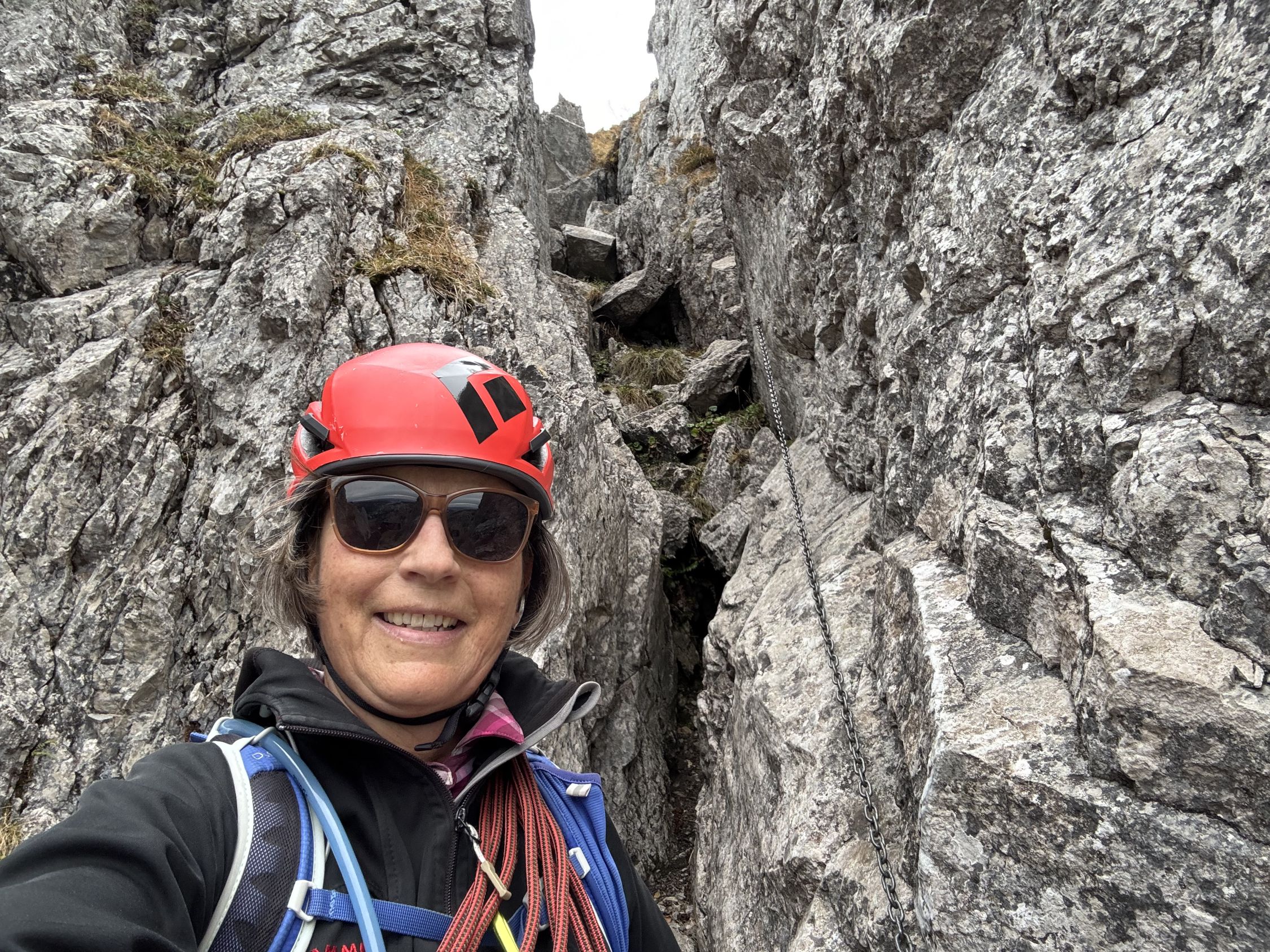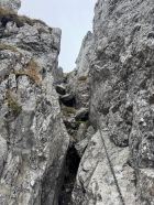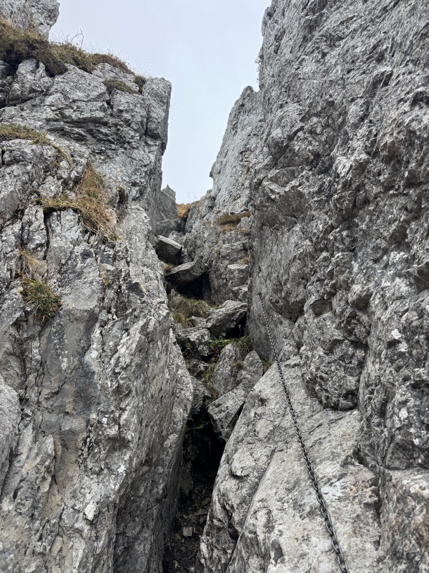 Danach geht es ein paar Meter steil nach unten, man kann sich aber an einer Kette festhalten. Danach kommt ein Felsen, der zuerst überhängend ausssieht, aber wenn man die Beine durch den Spalt zwängt und sich umdreht, gibt es einen guten Tritt um abzusteigen.