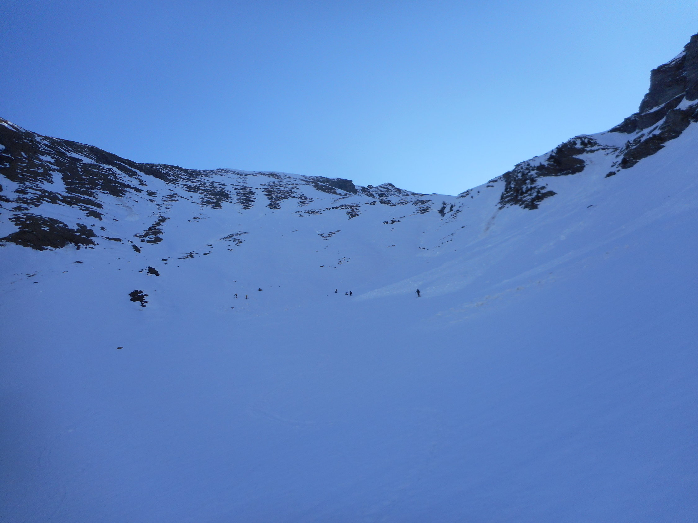 Insgesamt 12 Skitourengeher am Berg. War ein schönes Wiedersehen mit Andreas, und anderen Bergkollegen. Mit ihm habe ich vor 16 Jahren den gesamten Finsteraarhorn Südostgrat (2.5km) in 16 Stunden ueberschritten. Drei Tage lang, sind wir niemanden begegnet. Danke.