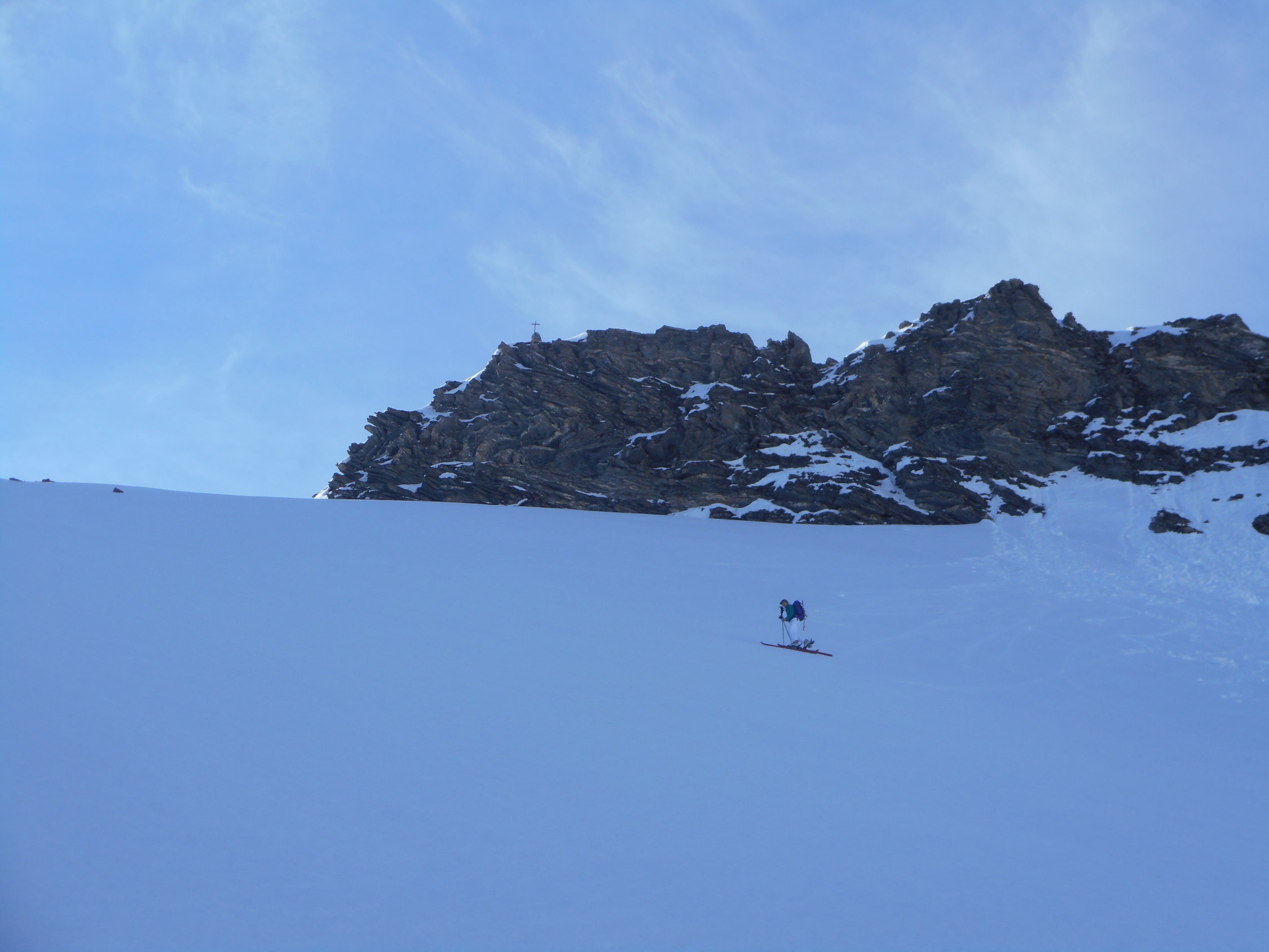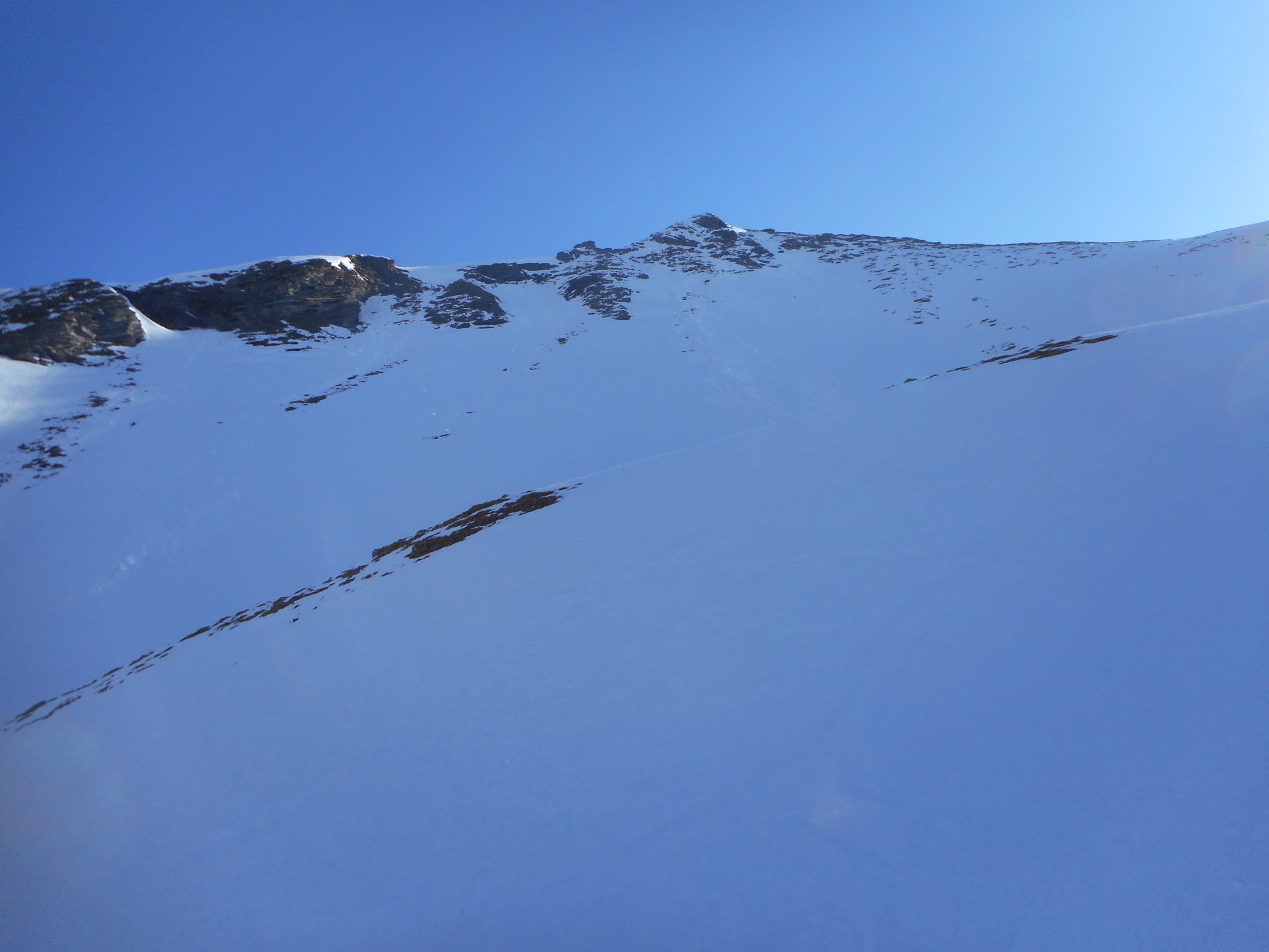 Aufstieg: Schneedecke ab Start gefroren und tragend. Die letzten Meter in 5 Minuten über den Westgrat auf den Gipfel. Windstill und sehr mild.