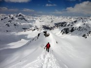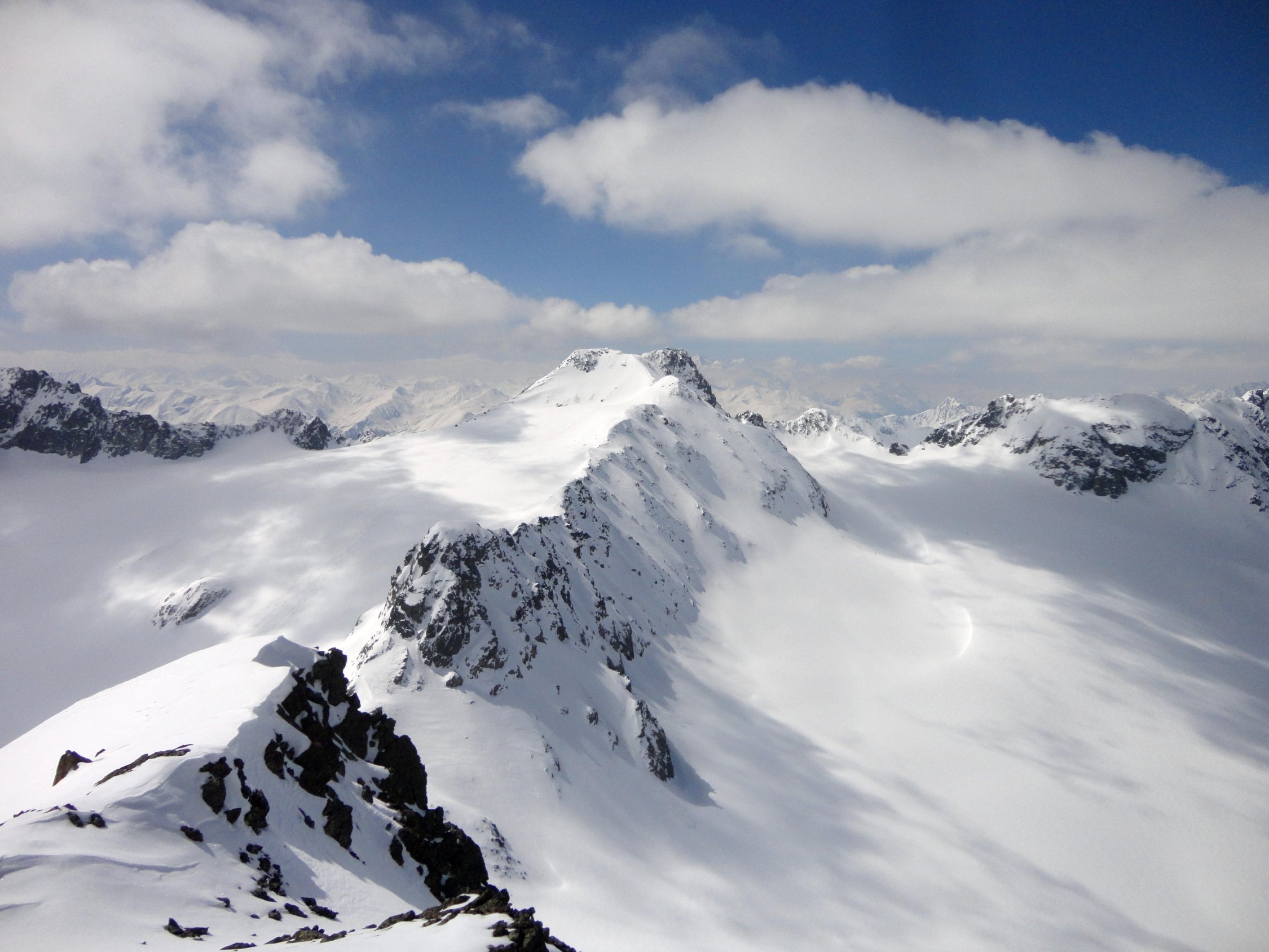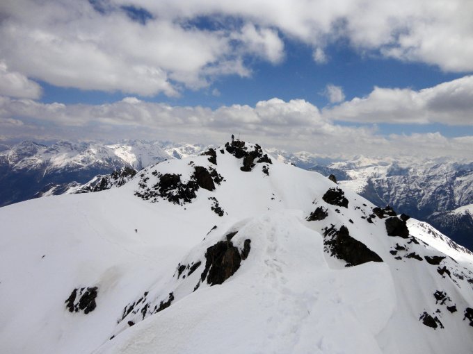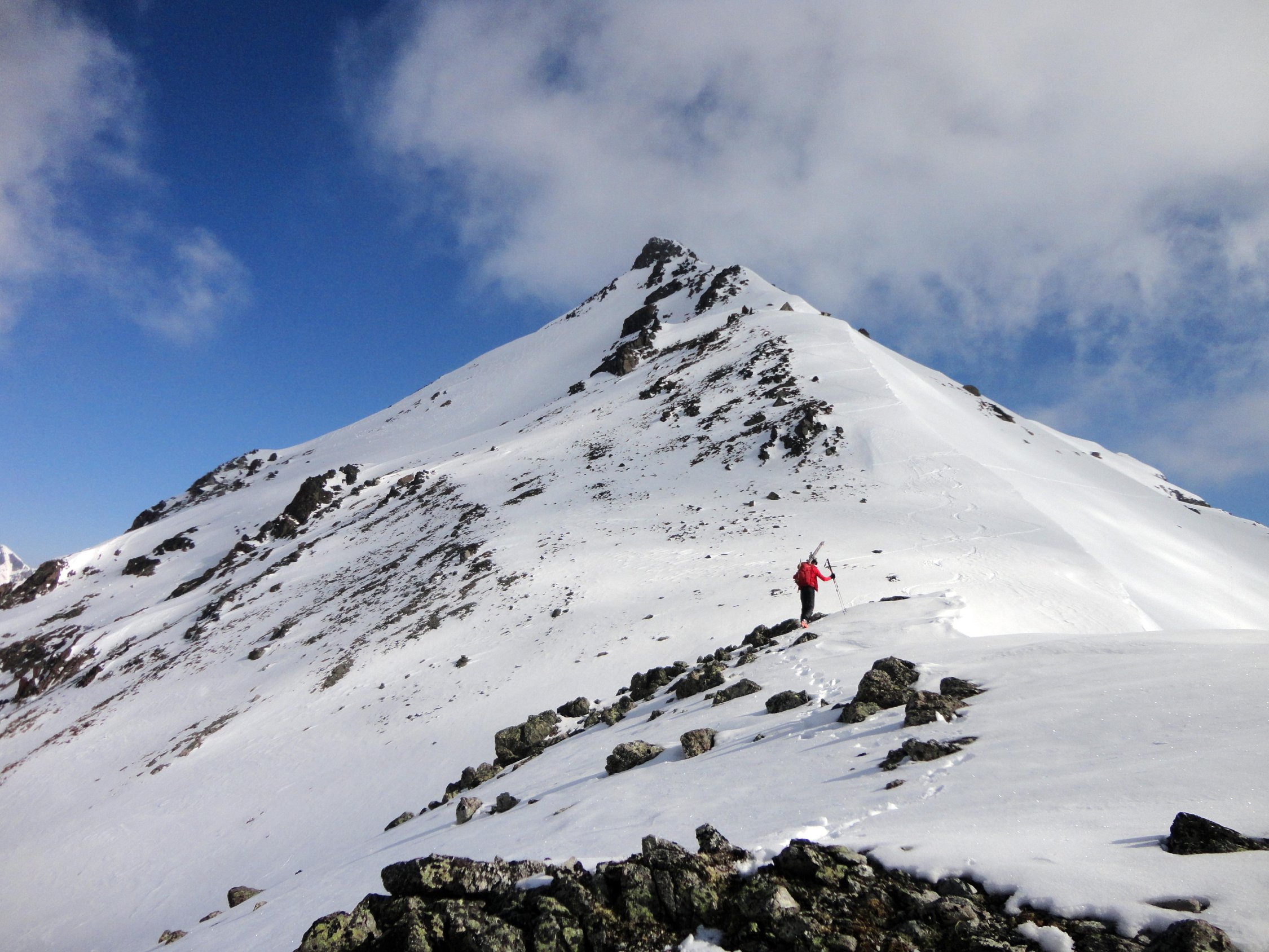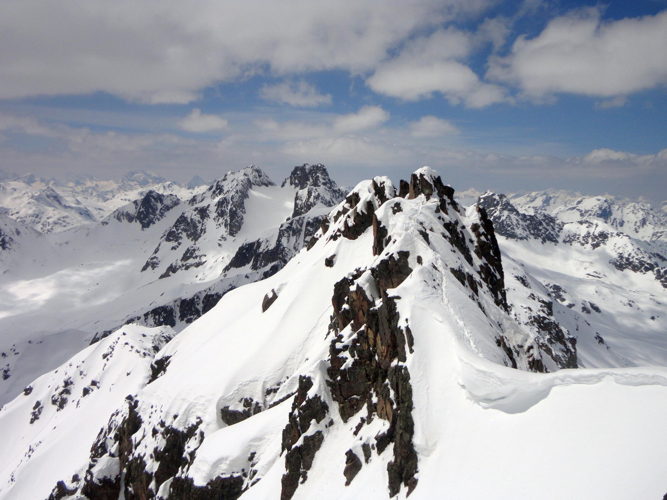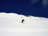 Gipfelaufstieg zum Piz Sarsura (Ostgipfel, Gipfelstange und Buch) zu Fuß in gutem Trittschnee, der Übergang zum westl. Felsgipfel ist kurz, aber ziemlich ausgesetzt. Abfahrt durch die Westflanke oben kompakter Pulver, nach unten hin zunehmend besserer Firn. Talabfahrt von der Hütte nach Dürrboden perfekter Sulz.