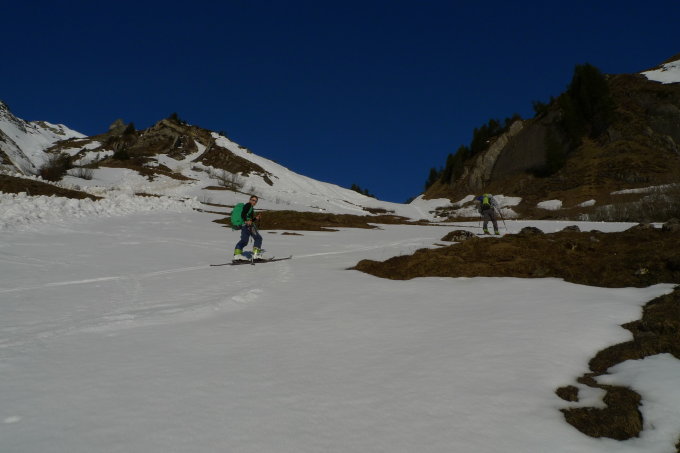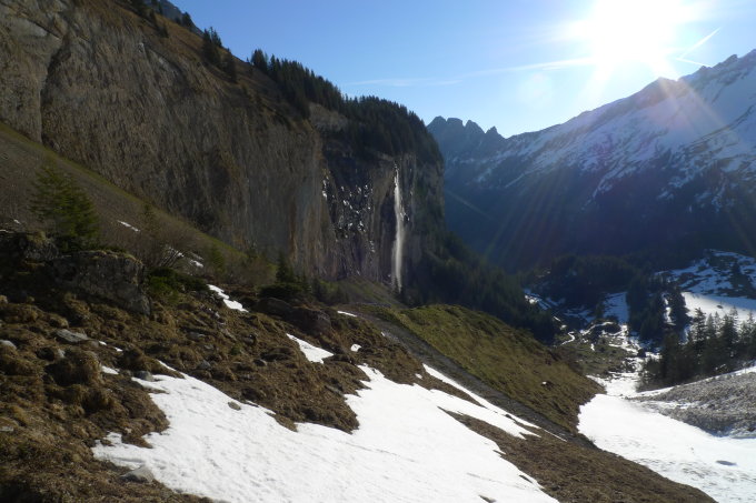Ab Grossalp mit den Ski durchgehend tragende Schneedecke. Felsriegel gut passierbar.
