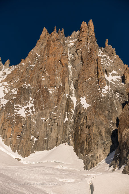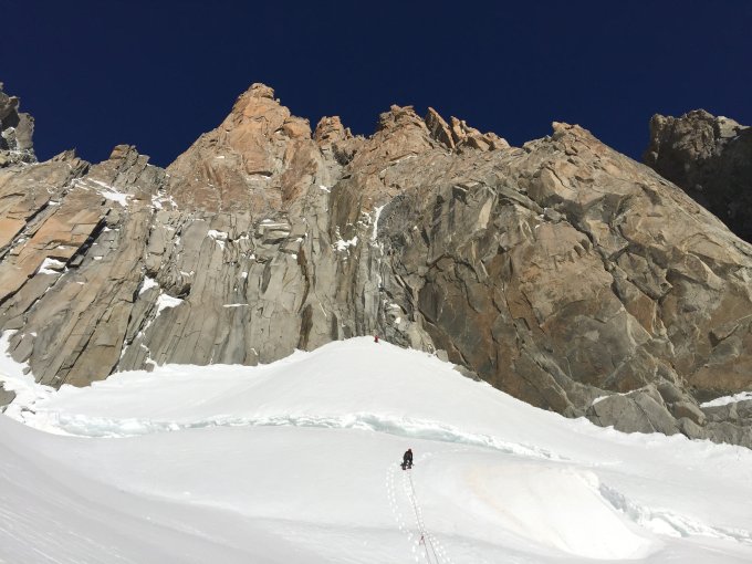 Zustieg momentan gut mit Skiern machbar. Eine Spur hat uns den Zustieg zur Route etwas erleichtert (danke an die Franzosen Pierre und Christoph welche am Vorabend gespurt hatten).