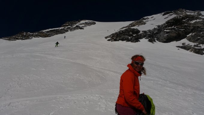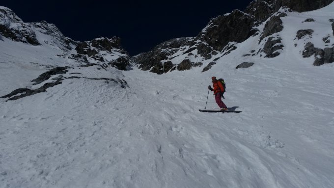 Harter Schnee bis hin zum Einstieg ins Couloir. Im Couloir noch ein paar Spitzkehren und dann Ski auf den Rucksack und Steigeisen an. Es war schon eine Spur vorhanden daher sehr gut zu stapfen. Nach dem Couloir ins lange steile Schneefeld weiter stapfen bis zum Gipfel, und das sind viele Höhenmeter. Danke dem Spurer das war sicher Knochenarbeit. Abfahrt direkt vom Gipfelkreuz mit Skiern über die Ostflanke. Heute zum Glück früh genug unterwegs, Abfahrt ca. um 09:45Uhr (Tageserwärumng). Beim Start harter Schnee dann ab ca. 3100 firn bis sulzig. In der Engstelle nur kurz abrutschen, kein Problem. Schnee bis kurz vor den Parkplatz. Ski ca. 10 Min. tragen, was jetzt aber sicher immer länger wird. Aber Achtung, sehr früh abfahren!!! Je nachdem wie warm es wird zwischen 09:00 und 10:00Uhr.