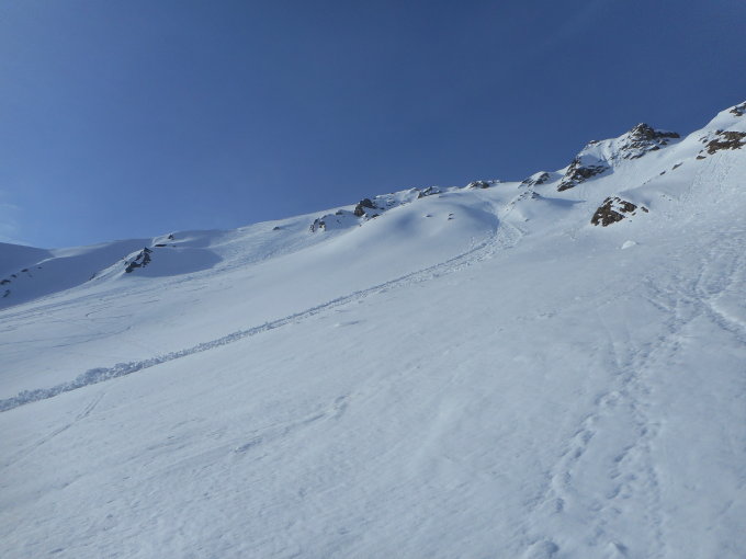 Mehrere Grundlawinen und Fischmäuler in allen Hangexpositionen gesehen. Als wir von der Abendmatte Richtung Ramsli abfuhren, haben wir eine grosse Nassschneelawine vom Wiriehore gesehen. ( siehe Fotos )