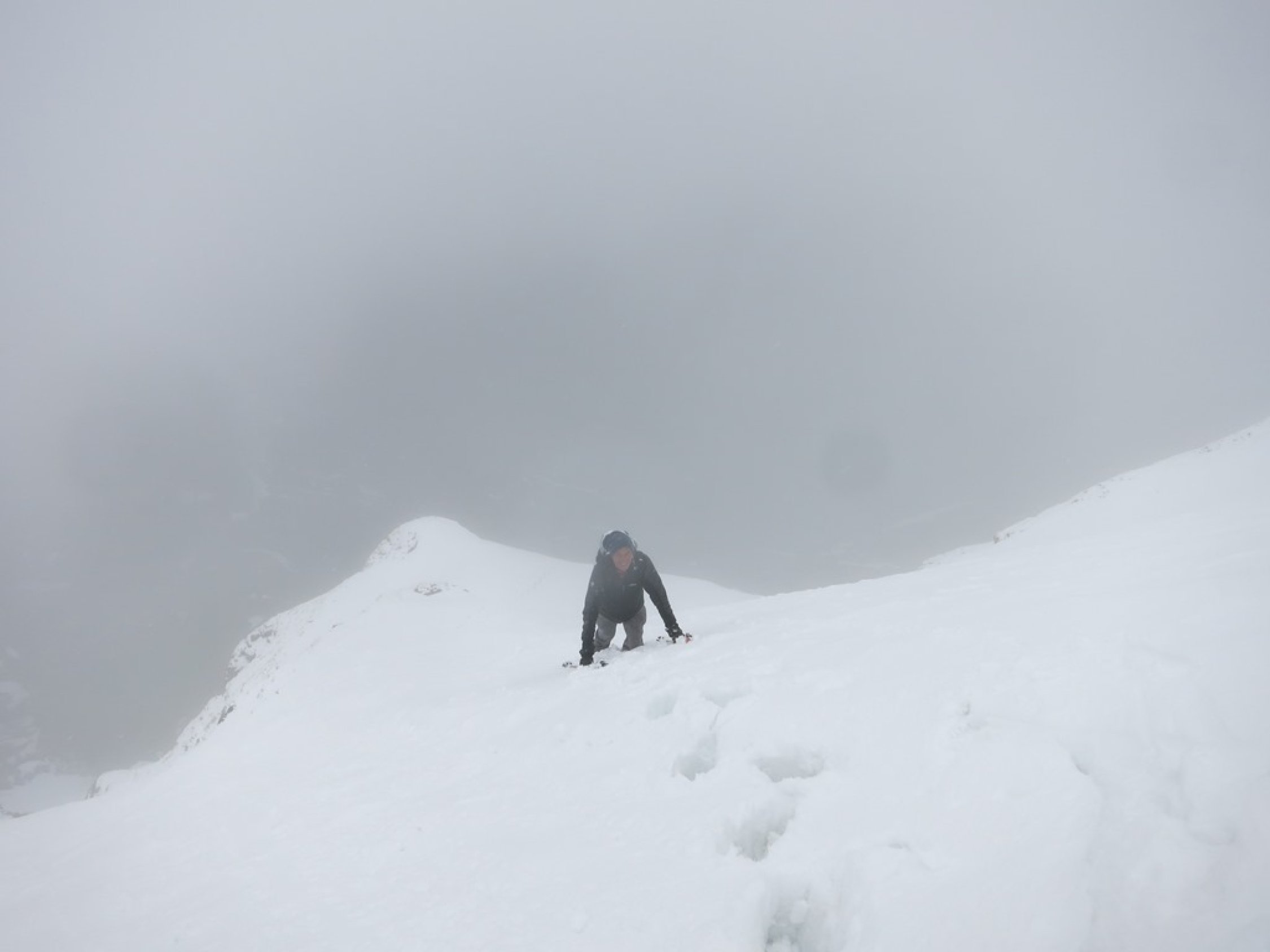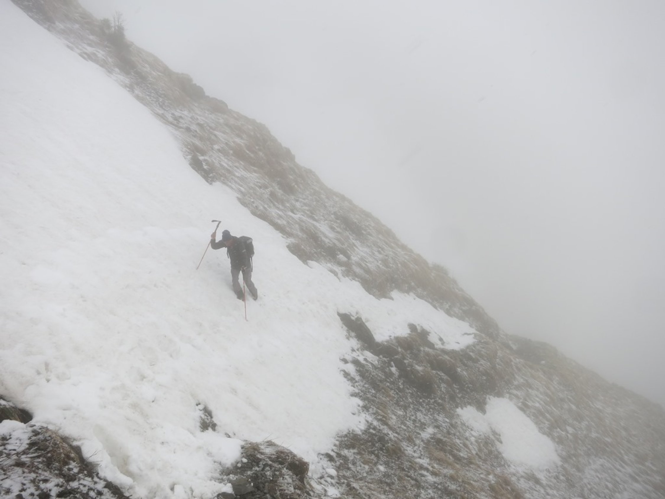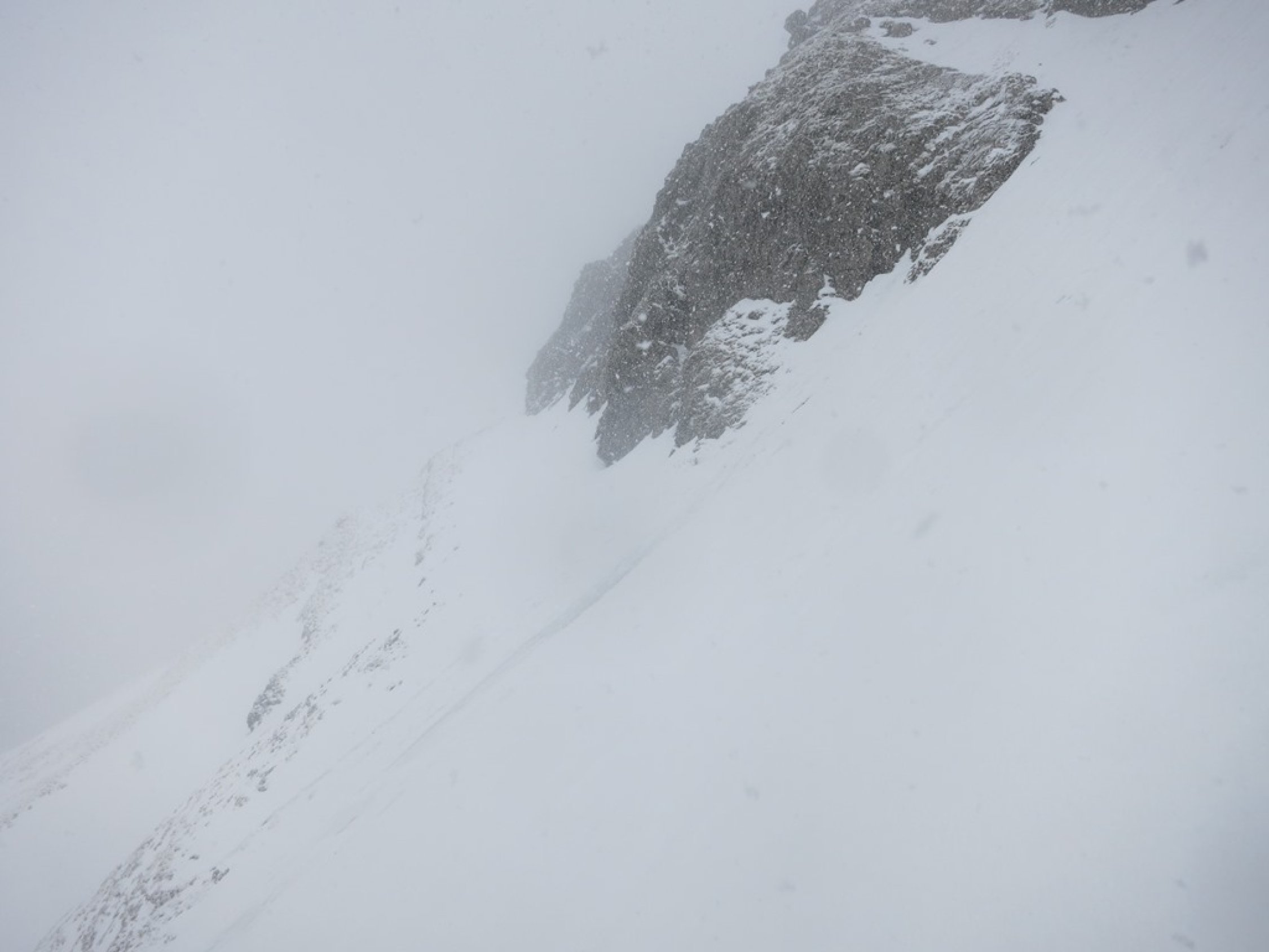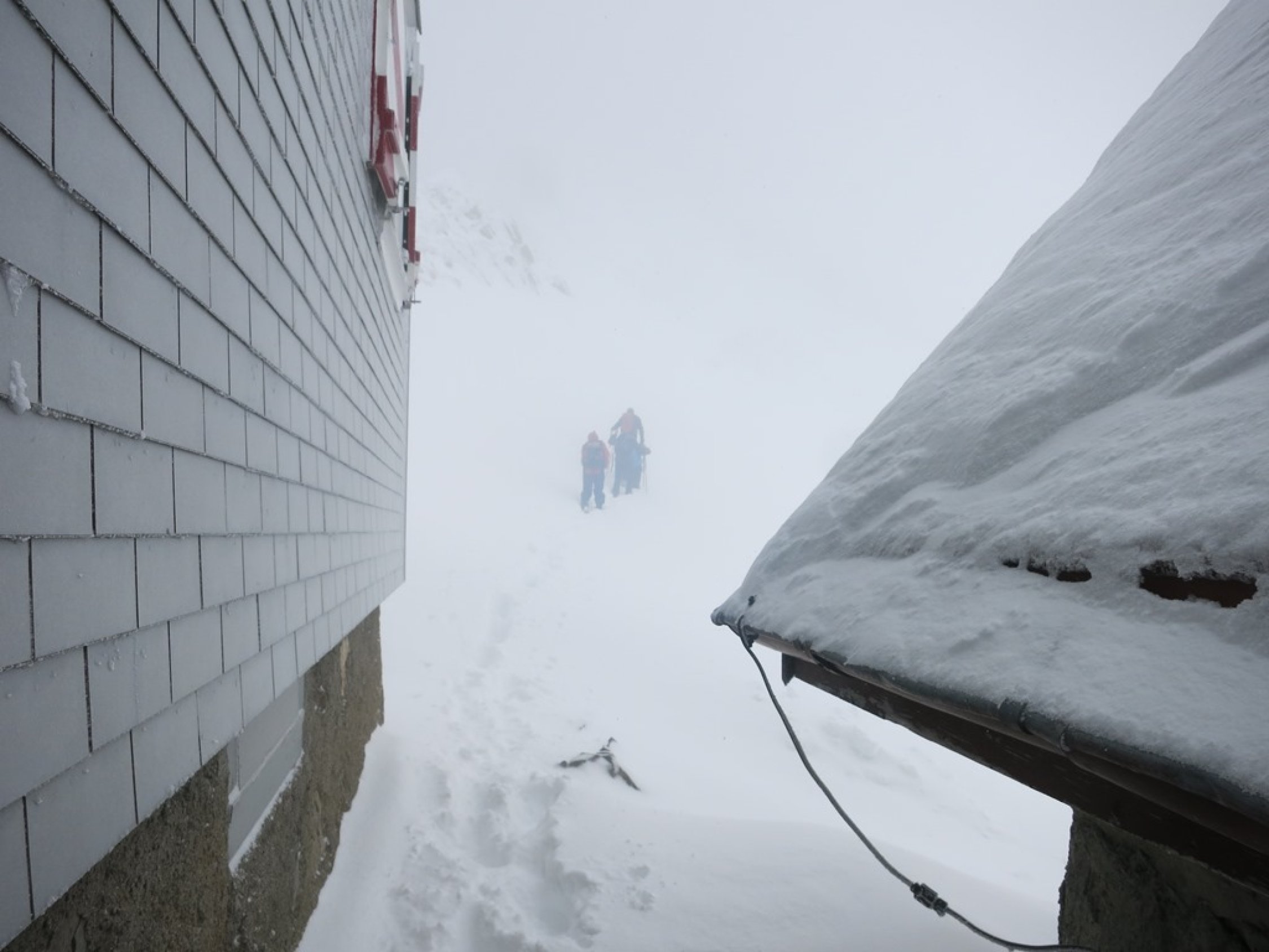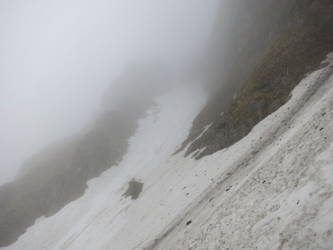 Aufstieg Tierwis (gestern): Start kurz vor 15 Uhr nach einer kurzen Aufhellung. Bald einsetzender Regen, dann Graupelschauer und oberhalb ca. 1‘600 Meter Schneefall. Neuschnee ab etwa 1‘800 Meter auf Altschnee; je nach Windexposition zwischen 10 und 25 cm, (oder mehr). Altschnee darunter aufgeweicht… Querung Langwand teils heikel da ziemlich abschüssig. Aufstieg in der Rinne nach dem Ellbogen, (P.1939), streckenweise bis 40 cm im Schnee „gewühlt“. Stahlseil zur Tierwis liegt noch unter dem Schnee.