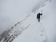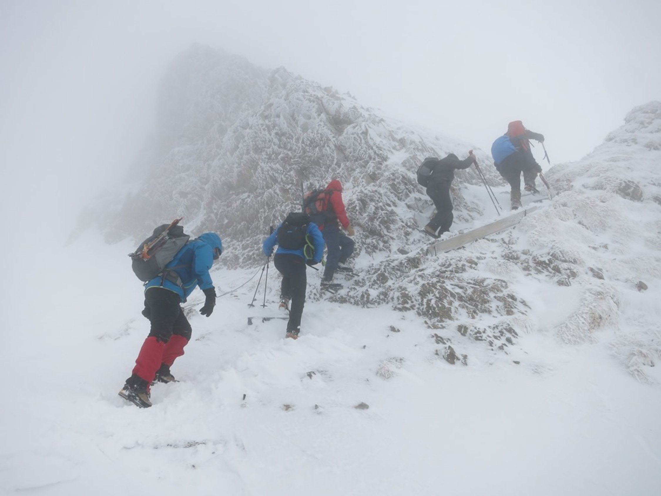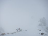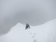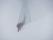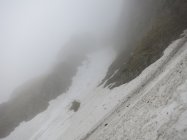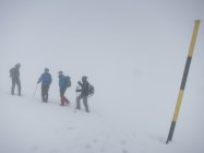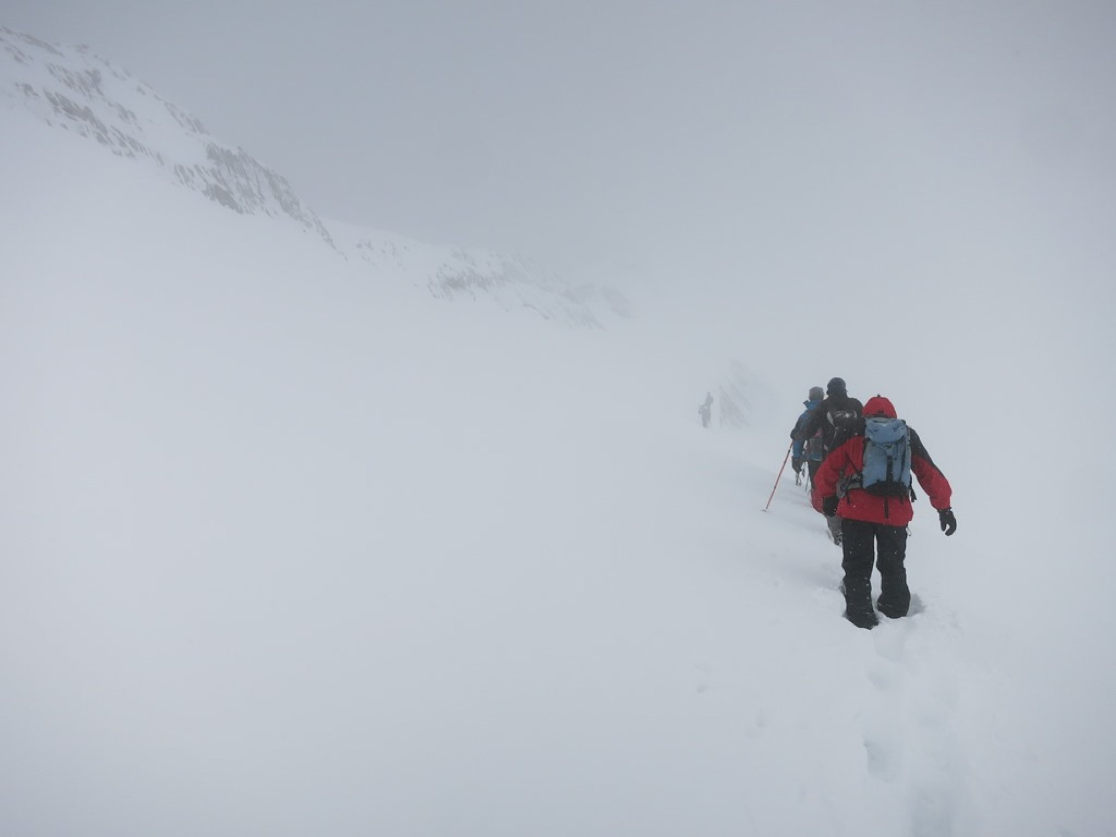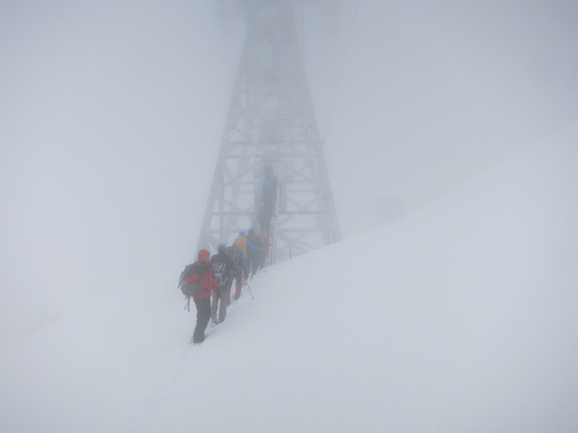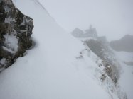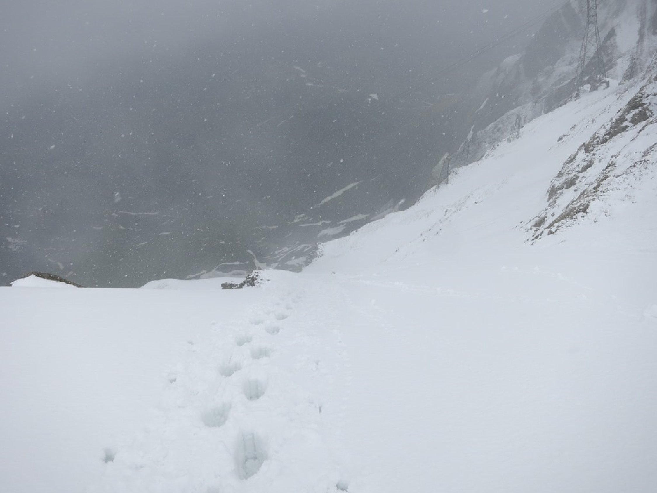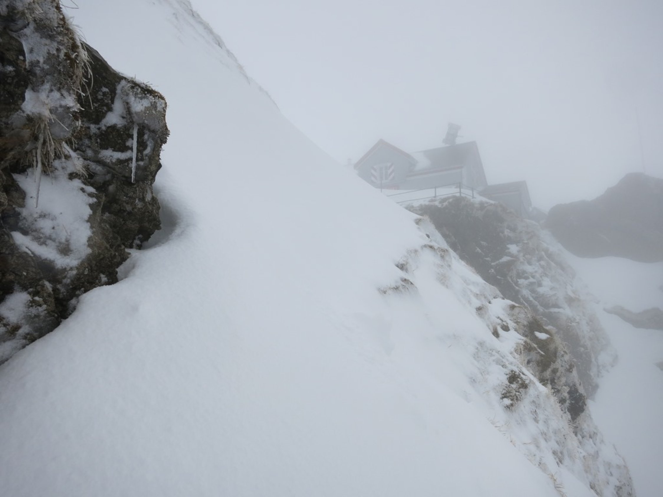 Aufstieg Säntis: Start um ca. 9 Uhr bei Schneefall, Minustemperaturen und starkem Ostwind. Da es praktisch die ganze Nacht geschneit hat, war Spuren angesagt… Spuren vom Vortag von der Stütze 2 waren nicht mehr sichtbar. Wegen dichtem Nebel und (wahrscheinlich) vielem Neuschnee im Kamin bei der Himmelsleiter, bei der Stütze 2 die Tour abgebrochen.