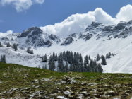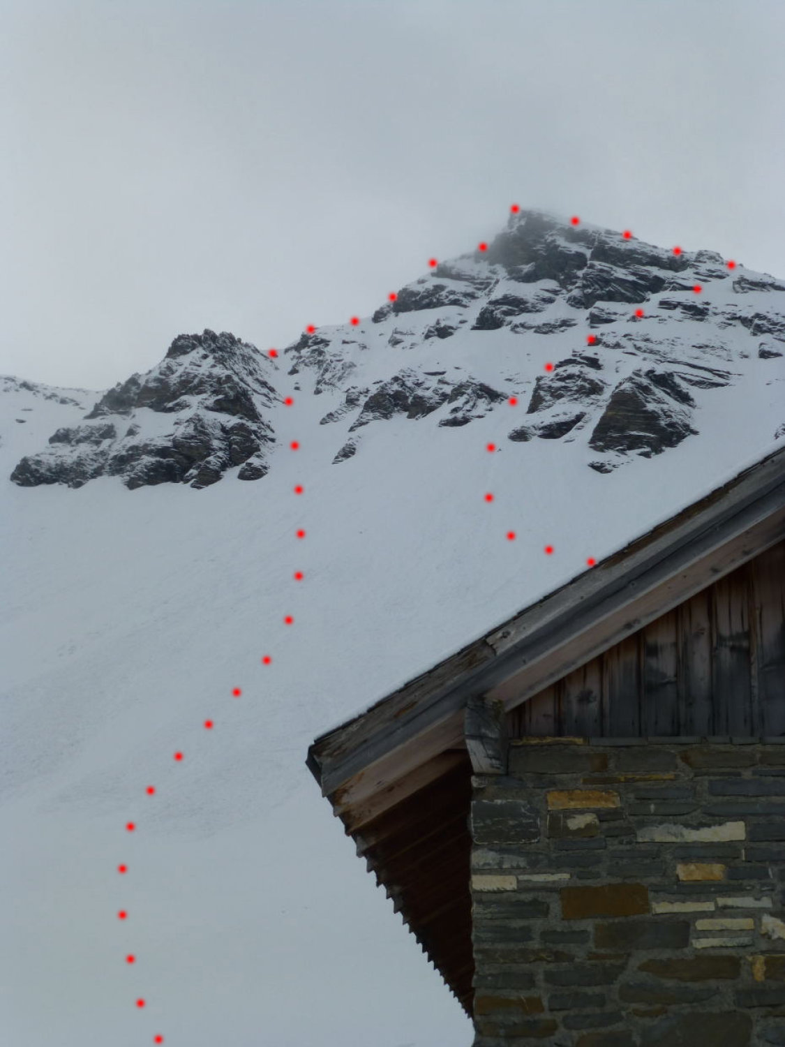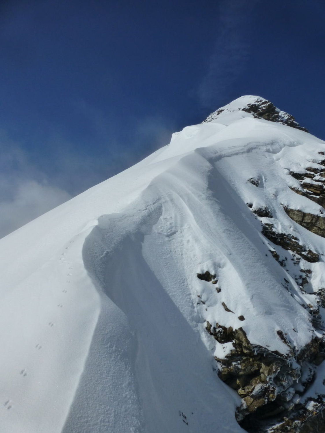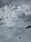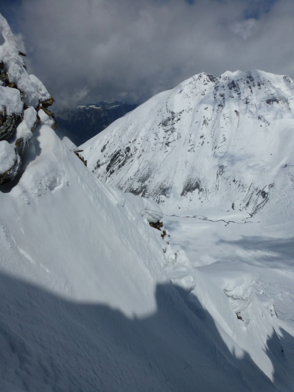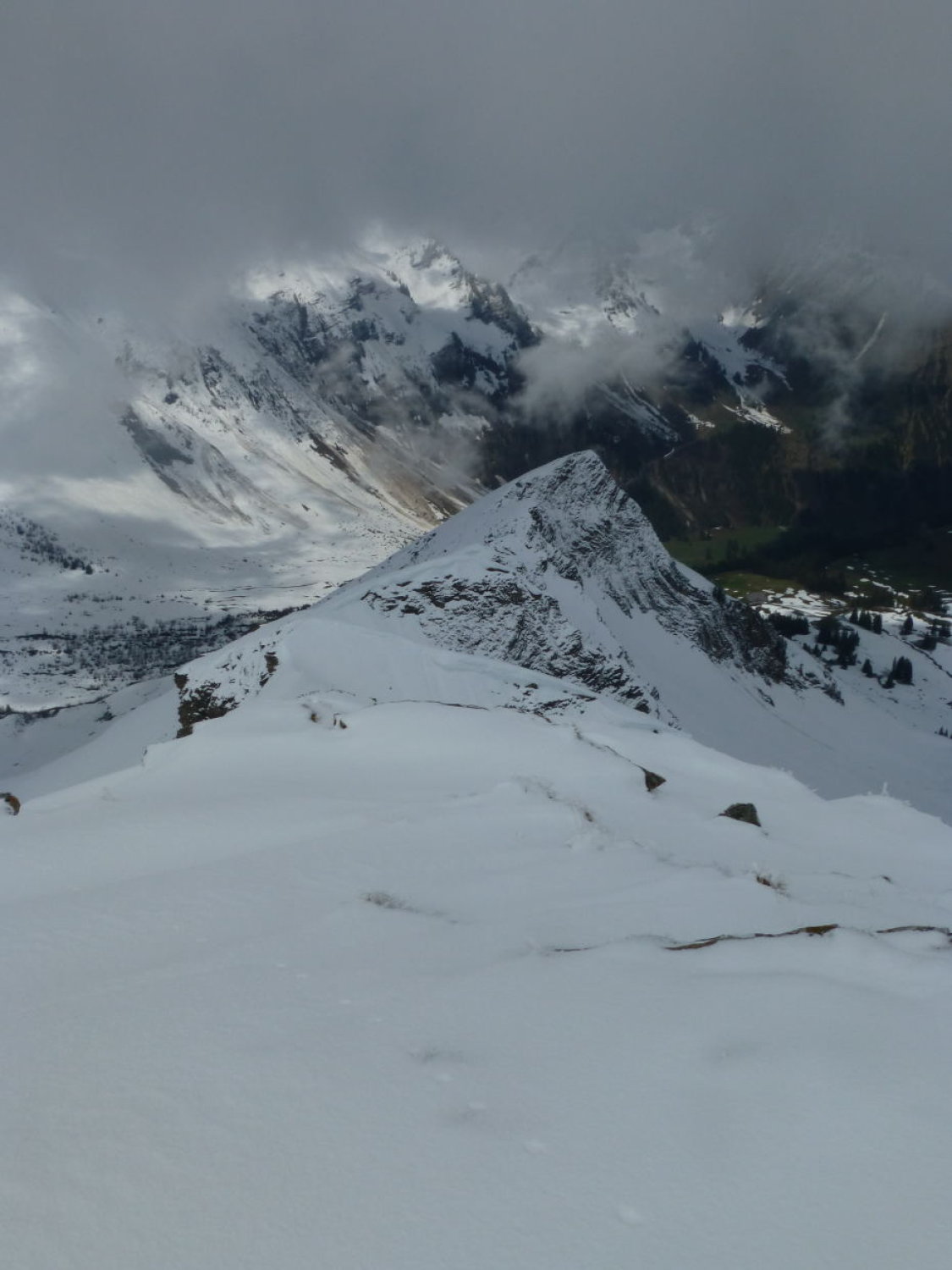 Morgens Nebel und z.T. noch leichter Schneefall, dann Aufhellungen und Quellwolken. Schnee ab 1750m: ca. 10-20cm Pulver auf durchfeuchteter, aber tragender Unterlage. Mehrere ältere überschneite Locker- und Nassschneelawinen.