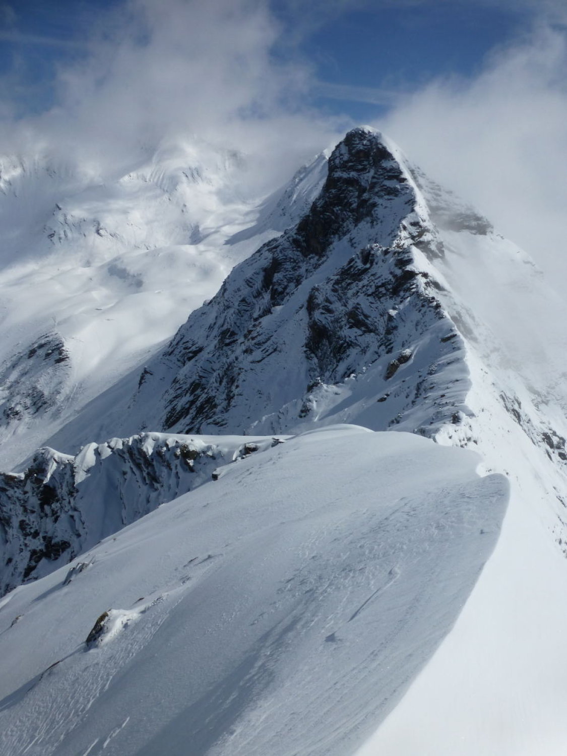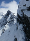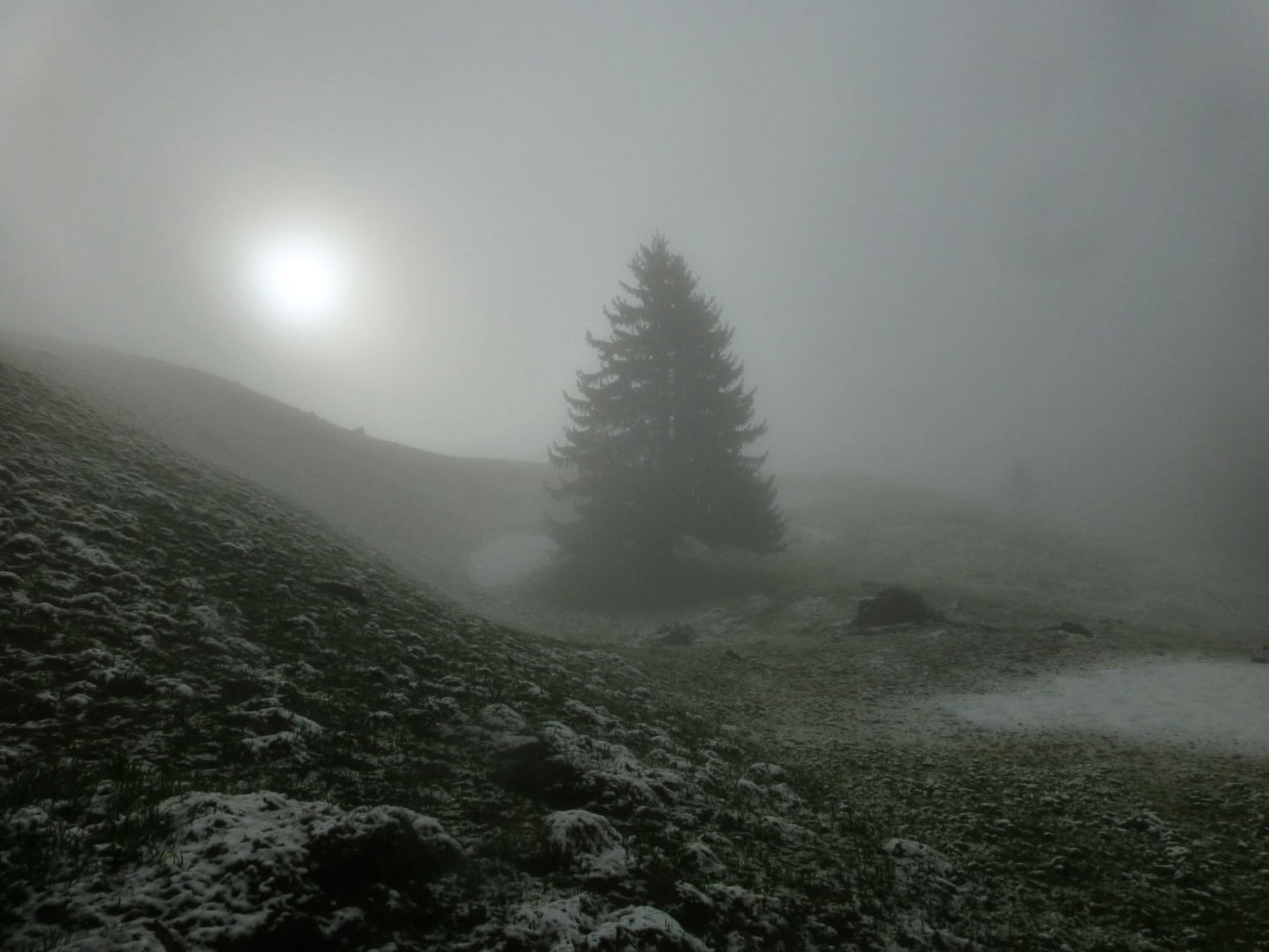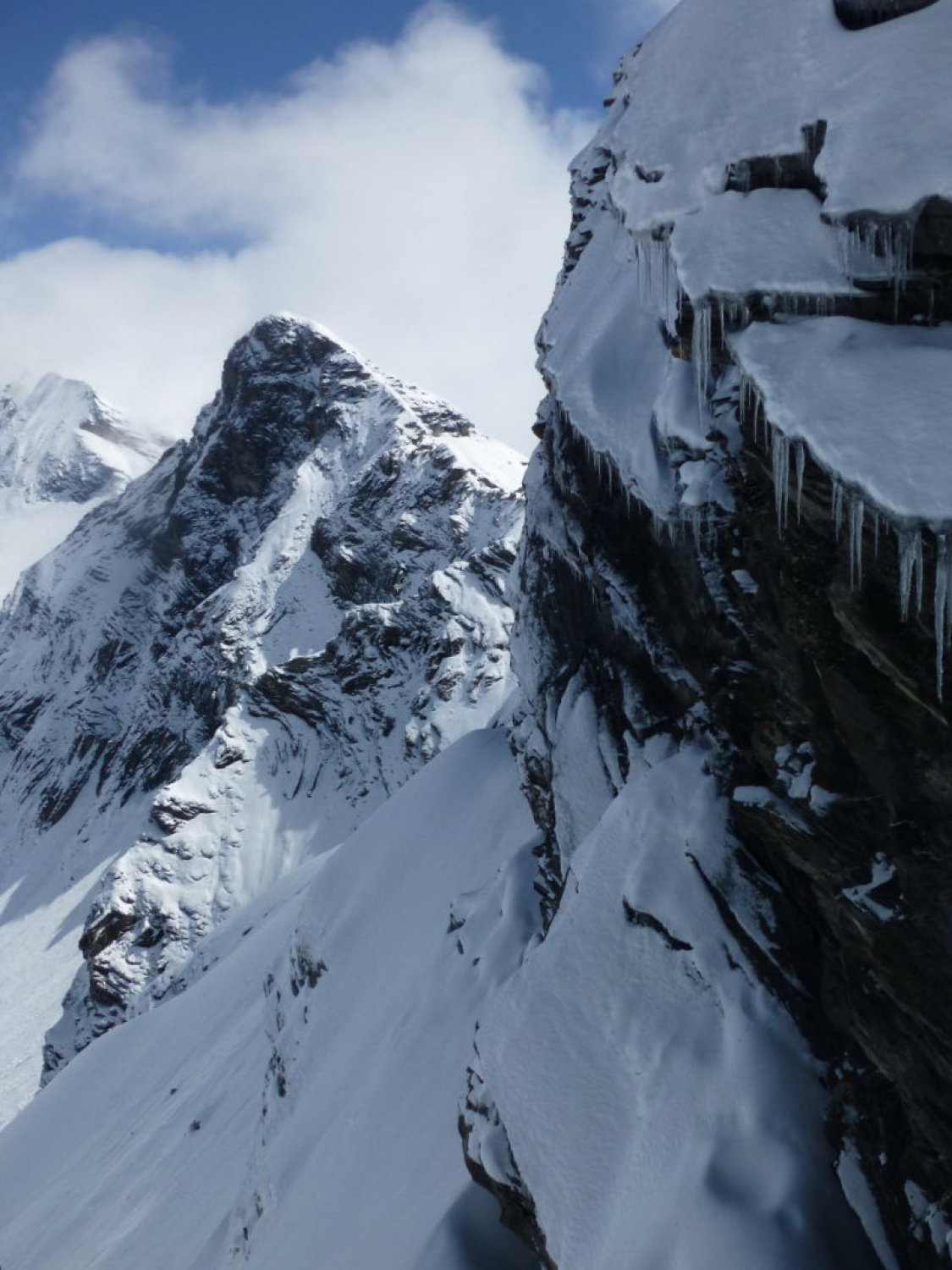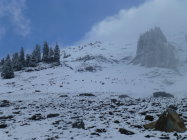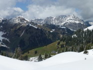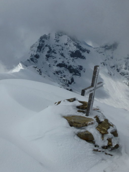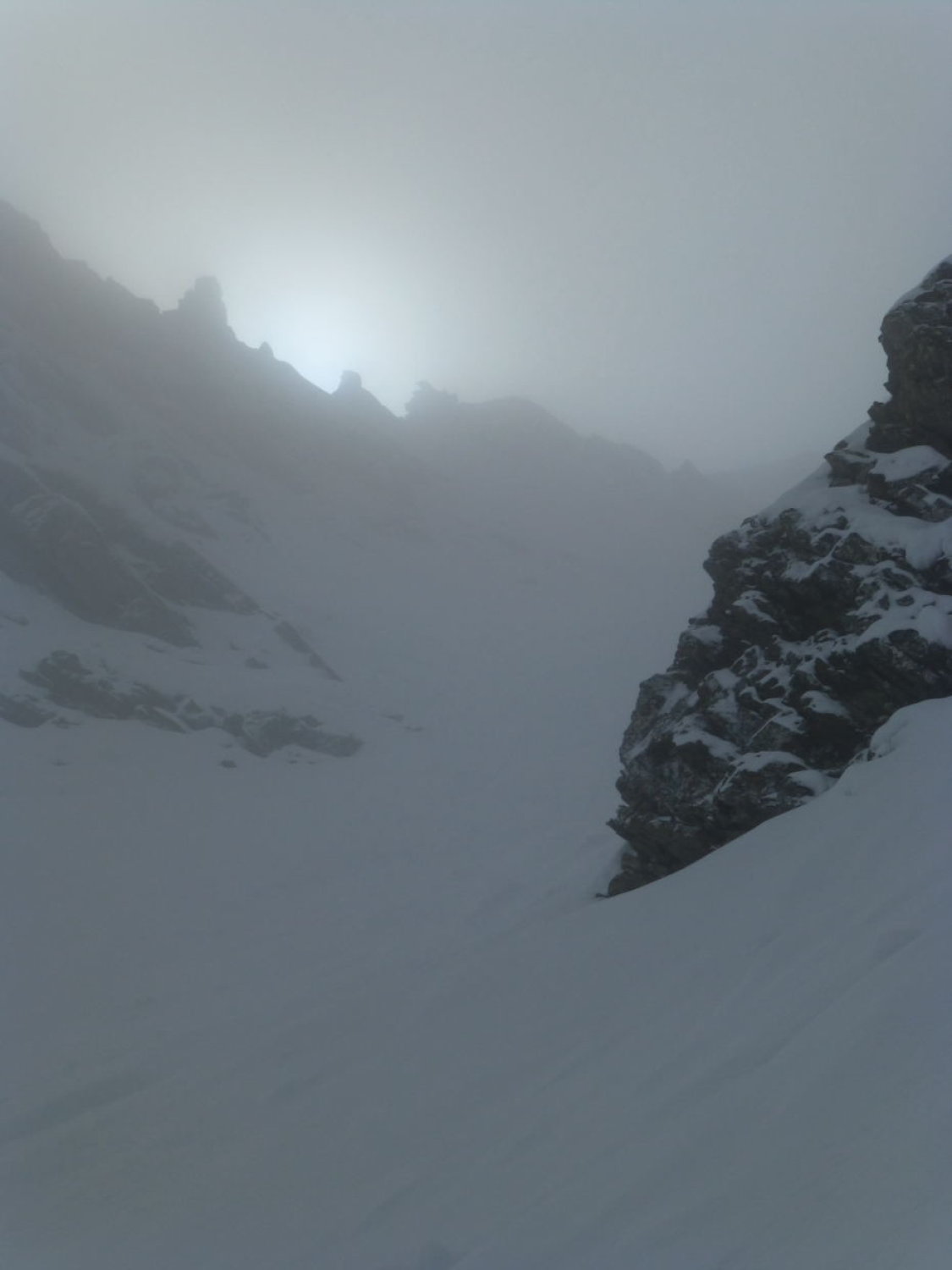 Morgens Nebel und z.T. noch leichter Schneefall, dann Aufhellungen und Quellwolken. Schnee ab 1750m: ca. 10-20cm Pulver auf durchfeuchteter, aber tragender Unterlage. Mehrere ältere überschneite Locker- und Nassschneelawinen.