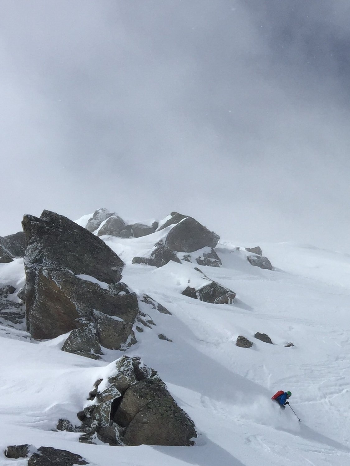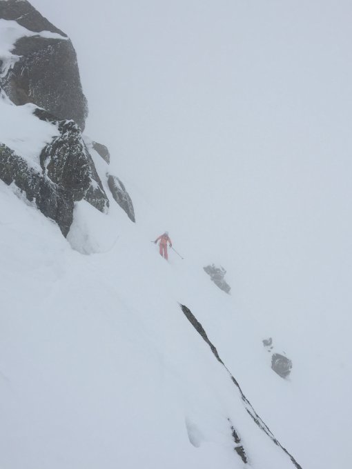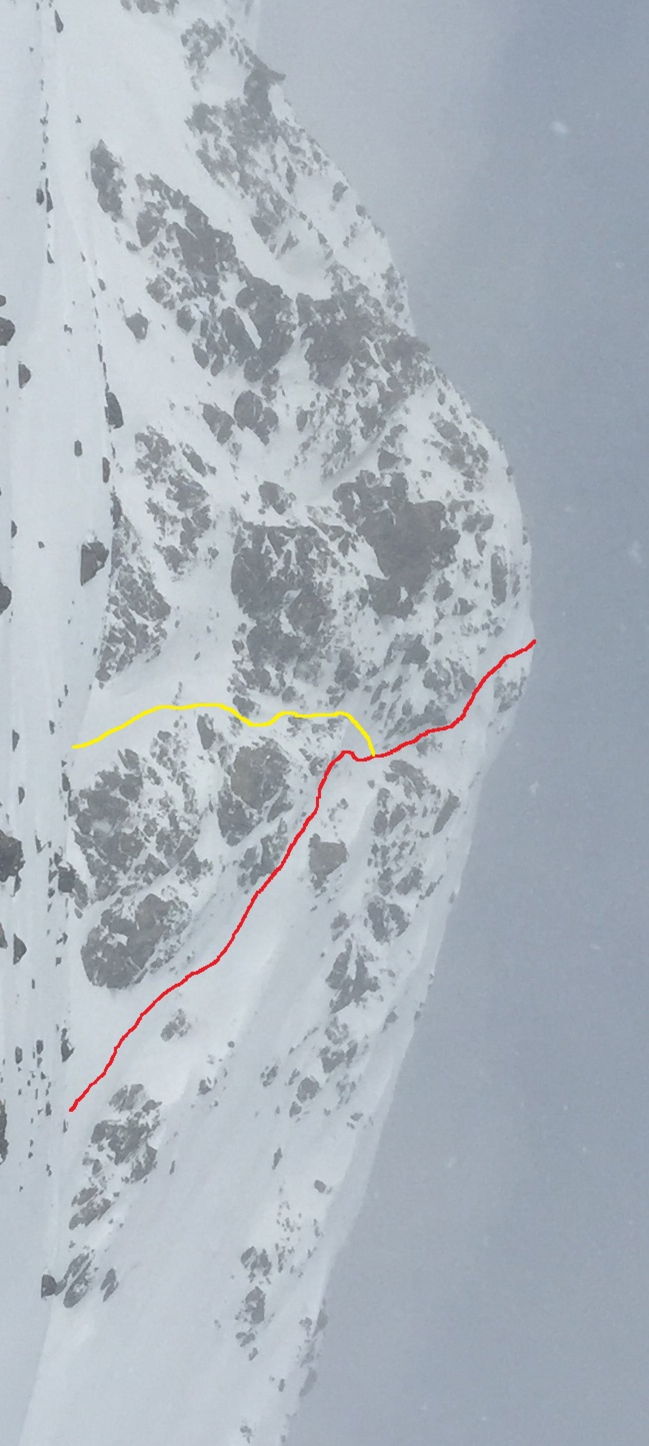 Das Nordcouloir wird selten, aber trotzdem hin und wieder befahren. An sich ein echter Geheimtipp. Um der Sache noch zusätzliche Würze zu geben, fuhr ich nach der Schlüsselstelle ein weitaus steileres Sekundärcouloir. (Im Bild gelb eingezeichnet.) Es dürfte auf fast 100Hm anhalten 50°steil sein und nur gerade 3-5m breit. Kleinere Stufen müssen übersprungen werden. Meines Wissens wurde diese Variante noch nie befahren, Infos dazu würden mich brennend interessieren.