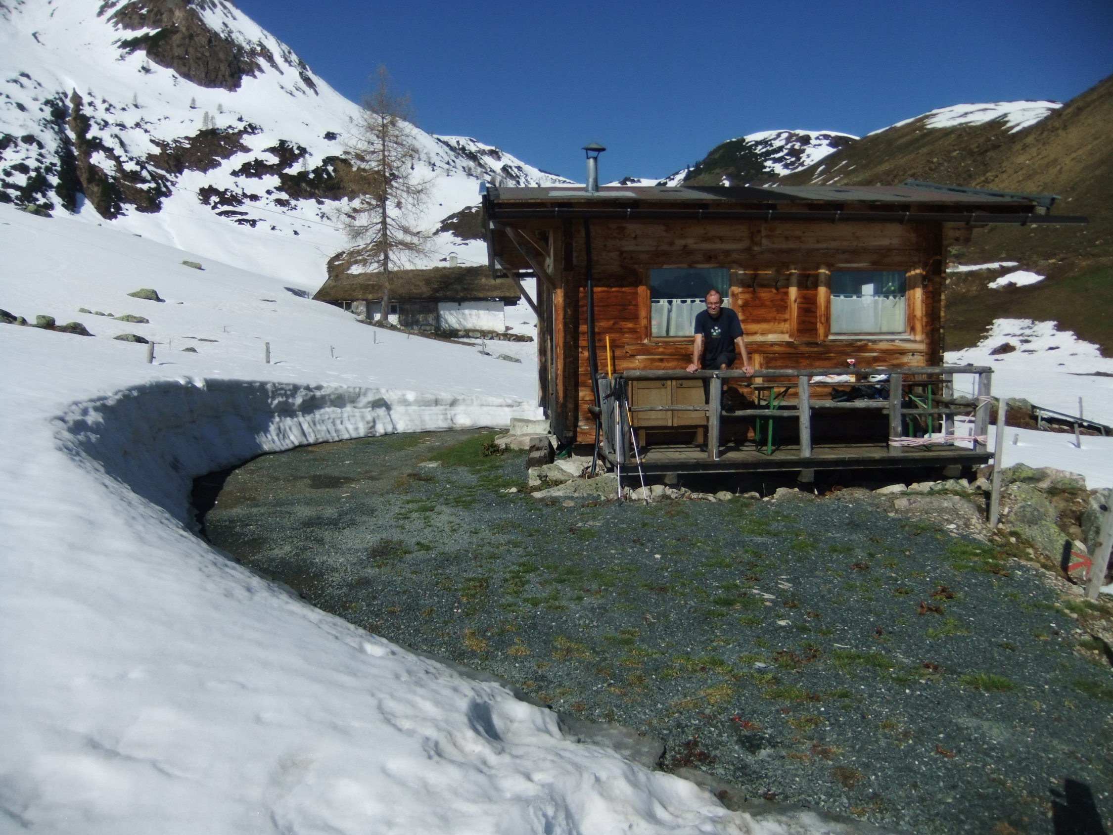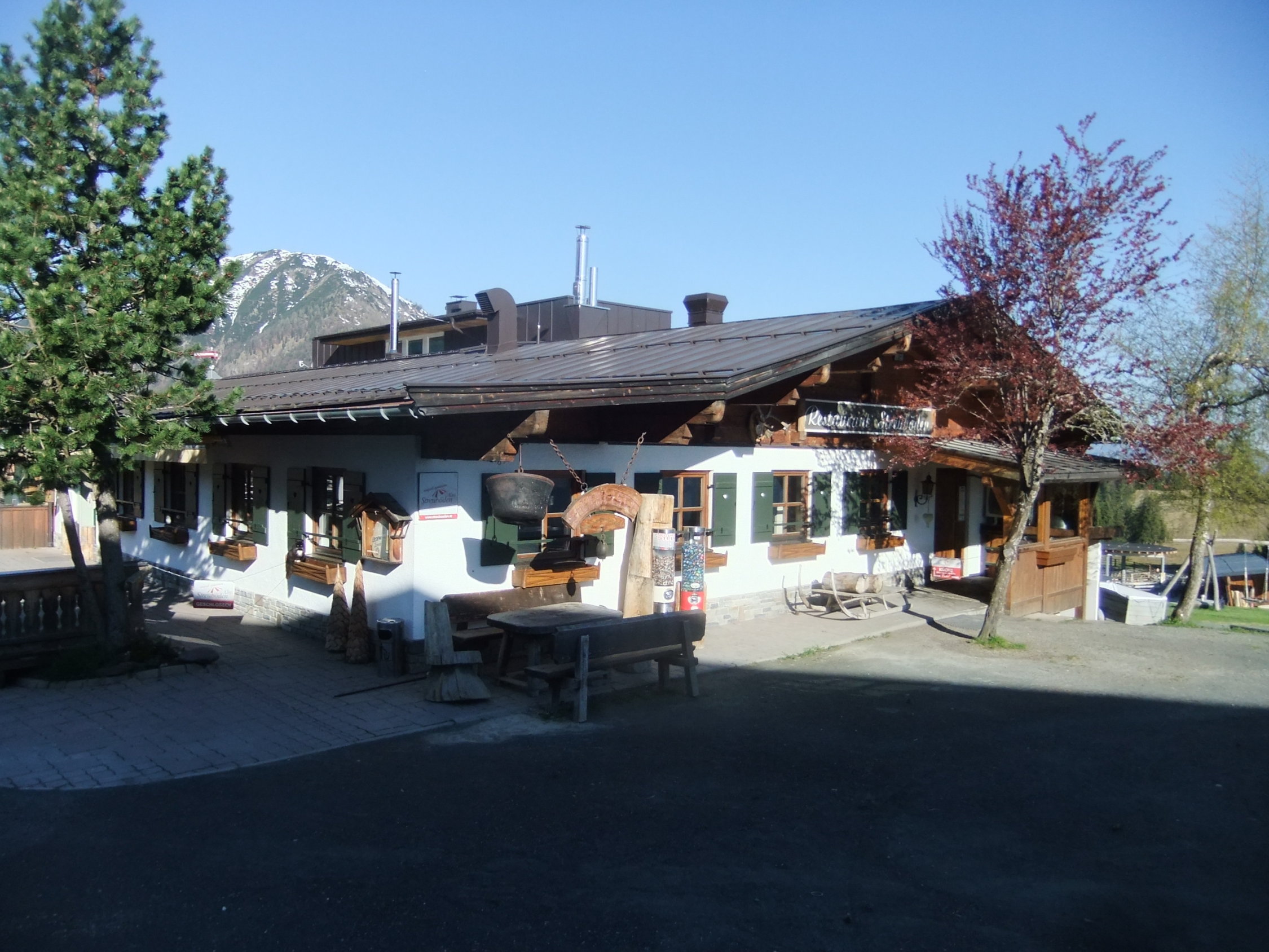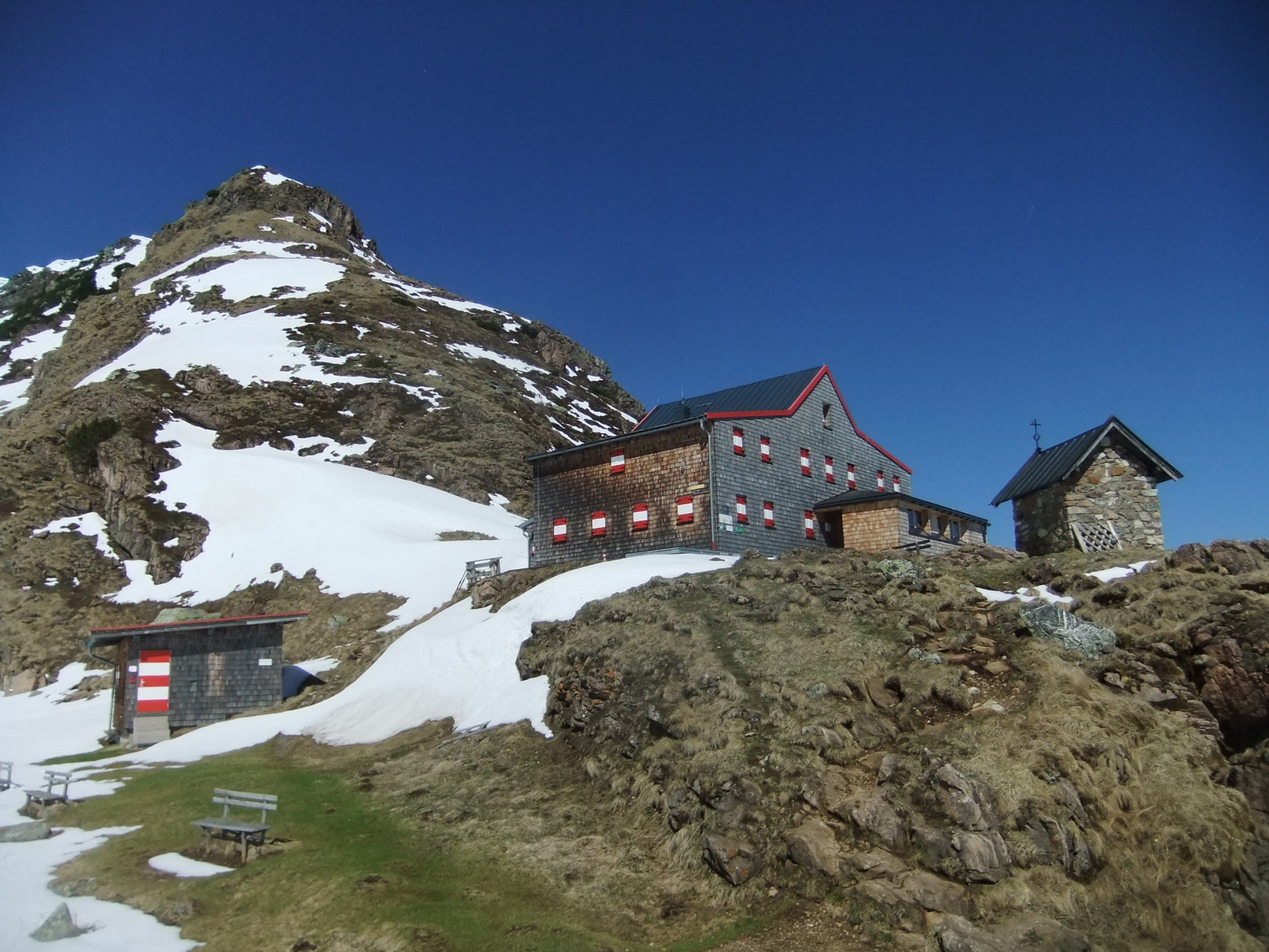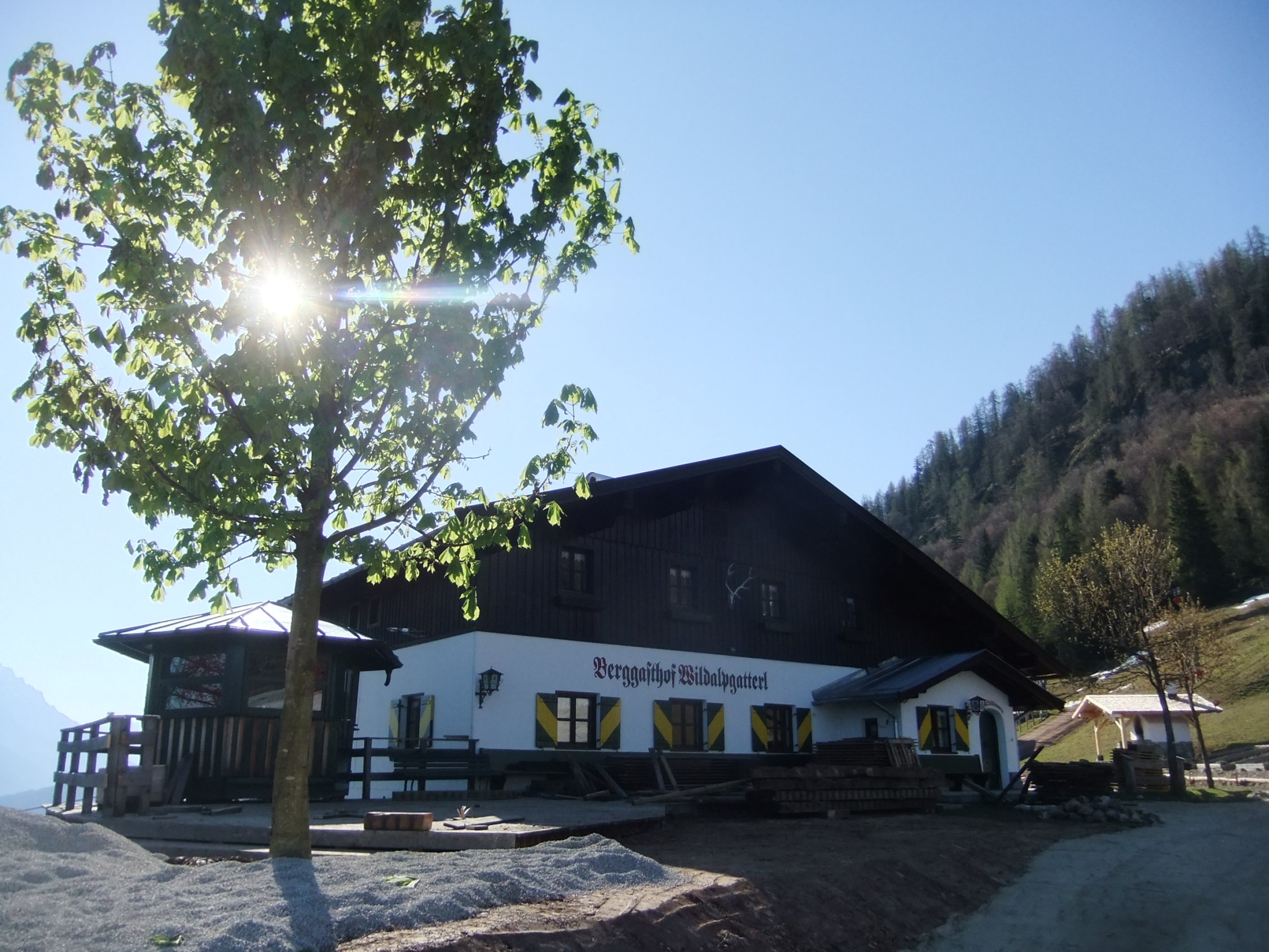 Fußspuren führten von der Wildalm im Schnee nur bis zum Jägerstand weit links von der Materialseilbahn zum Wildseeloderhaus. Da ich keine Einstiegswegbeschreibung hatte und im nordseitigen Aufstieg zum Wildseeloderhaus weder ein Hinweisschild vorfand (ich befand mich zu weit links, wo es im Schnee einfacher ging), noch unter hoher Schneedecke Anzeichen eines Weges darunter ausmachen konnte, folgte ich einer Tourenskispur mit Abkürzern bis zur Berghütte am Wildsee. Von dort stieg ich über überwiegend schneearmen Westrücken auf zum Verbindungsgrat zwischen Henne und Marokka. Weiter dann über schneefreien Westgrat zum Gipfel. Hier kam mir ein Skitourenfahrer entgegen, der seine Ski am Wegweiser deponierte, den Gipfel besuchte und danach den Gamssteig Richtung Reckmoos-Piste abfuhr. Über den Klettersteig stieg ich dann ab. In 2 Querpassagen lag das Seil noch unterm Schnee und konnte nicht zum Sichern genutzt werden. Die Sitzbretter am Anseilplatz waren schon schneefrei. Ich stiefelte nicht weiter hinunter zum Jägerstand, sondern querte westwärts durch sulzig gewordenen Schnee hinüber zu meiner Aufstiegsspur und stieg noch einmal zum Verbindungsgrad hinauf, um der Henne (2078 m) geplanten Besuch abzustatten.