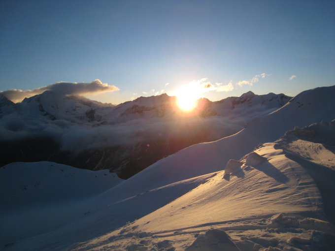 Nach der gestrigen "Tortour de froid" heute die Rechnung mit dem Alphubel beglichen. Schöner Ausklang des "Ausflugs auf die Britannia-Hütte". Merci à Pierre&Julie pour le conseil à la fin. Top Sulzabfahrt über die gebügelten Pisten, fast schon der schönste Teil der Tour!