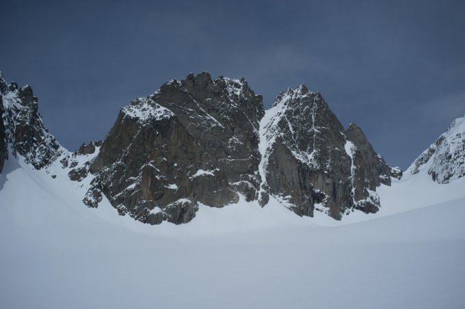 Abfahrtsverhältnisse: Abfahrt 11 Uhr, im Gipfelcouloir hübscher Powder, auf dem Gletscher nicht ganz zuverlässig gefrorener Sulz. Weiter unten eher mühsamer Bremsschnee. Obschon die Tour skifahrerisch ergiebig ist, war die Abfahrt nicht so der Brüller heute.