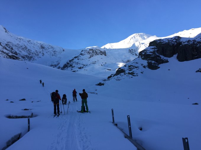 Perfekte Verhältnisse: Gletscher gut eingeschneit. Sonne, kein Wind am Gipfel und herrliche Sicht. Die ca. 15 cm Neuschnee von gestern Abend waren bei Abfahrt um 12:30 Uhr oben noch pulvrig, unten allerdings schon feucht und schwer. Heute wenig Betrieb, vielen Dank an unsere Vorgänger, die eine super Spur gelegt haben.
